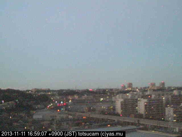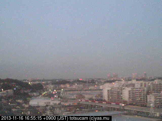 適度に曇った日の雲の動き (例: 2005-10-24) がとても楽しめます。 正面を横切っている高架は横須賀線下りです。 その下に横須賀線上り、東海道線、同貨物線が走っていますが、 高架に隠れていてよく見えません。 夜間は特に中央左寄りの車の動きがよく見えます。