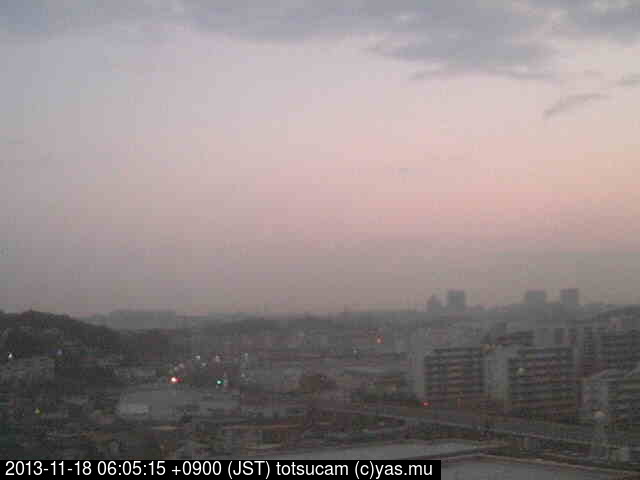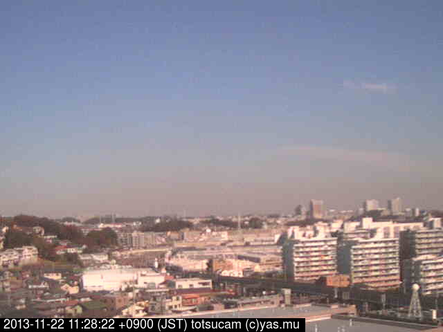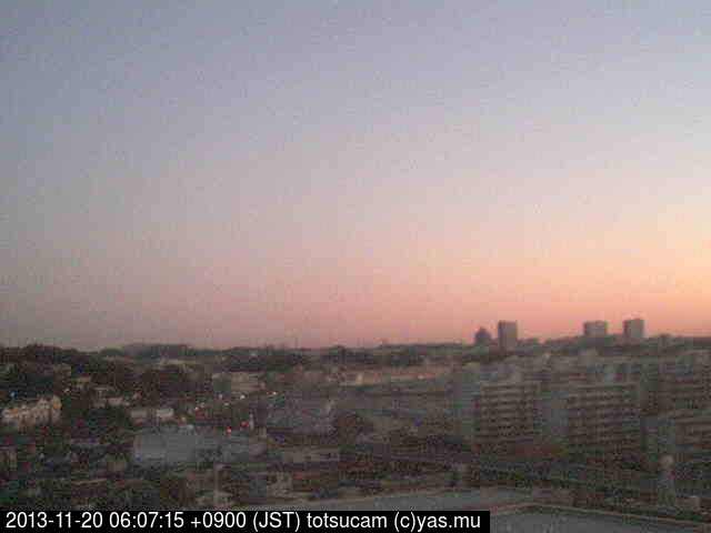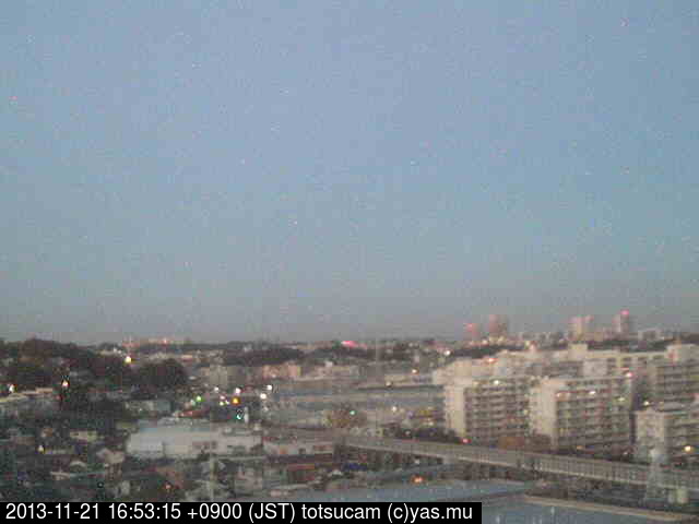 横浜市戸塚駅周辺から 東戸塚方面(北北東)を望む展望カメラの映像です。 左は現在の映像です。 下に並んでいるのは、 7日間に亘る日の出どき、昼間、夕暮れどきの写真(サムネイル)です。 それぞれ、日の出15分前、南中時、日没20分後の写真となっています。 各写真の下にはmpeg形式の動画へのリンクがあります。 それぞれ、日の出、南中、日没の前後1時間の画像です。 右欄にはその日24時間の動画へのリンクがあります。 この7日間以外は日付が一覧表示されています。 日付部分をクリックすると、 その日付から7日分が展開されて表示されます。