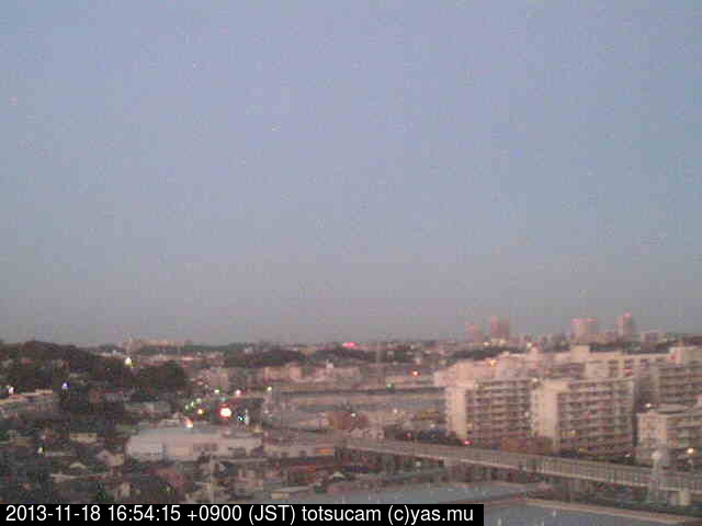適度に曇った日の雲の動き (例: 2005-10-24) がとても楽しめます。 正面を横切っている高架は横須賀線下りです。 その下に横須賀線上り、東海道線、同貨物線が走っていますが、 高架に隠れていてよく見えません。 夜間は特に中央左寄りの車の動きがよく見えます。