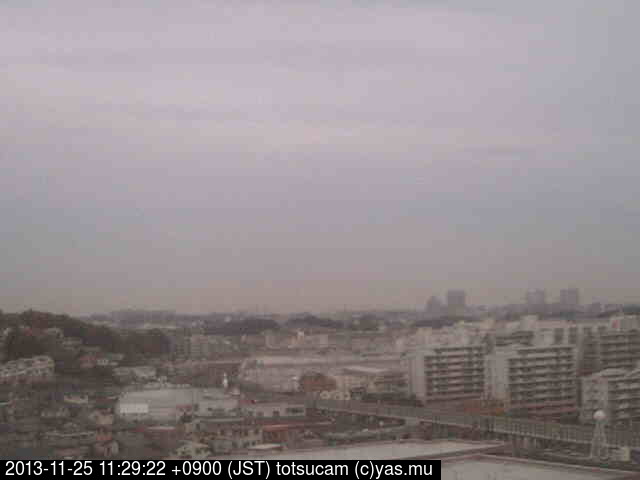 適度に曇った日の雲の動き (例: 2005-10-24) がとても楽しめます。 正面を横切っている高架は横須賀線下りです。 その下に横須賀線上り、東海道線、同貨物線が走っていますが、 高架に隠れていてよく見えません。 夜間は特に中央左寄りの車の動きがよく見えます。