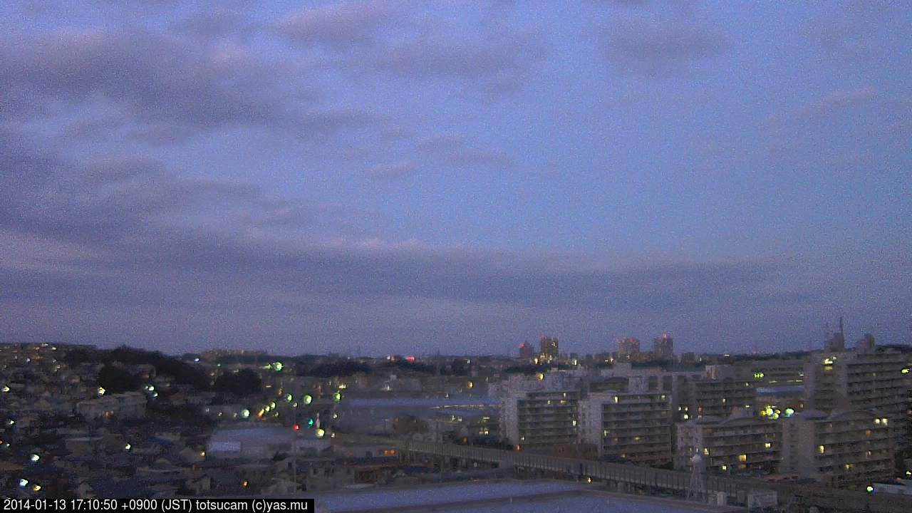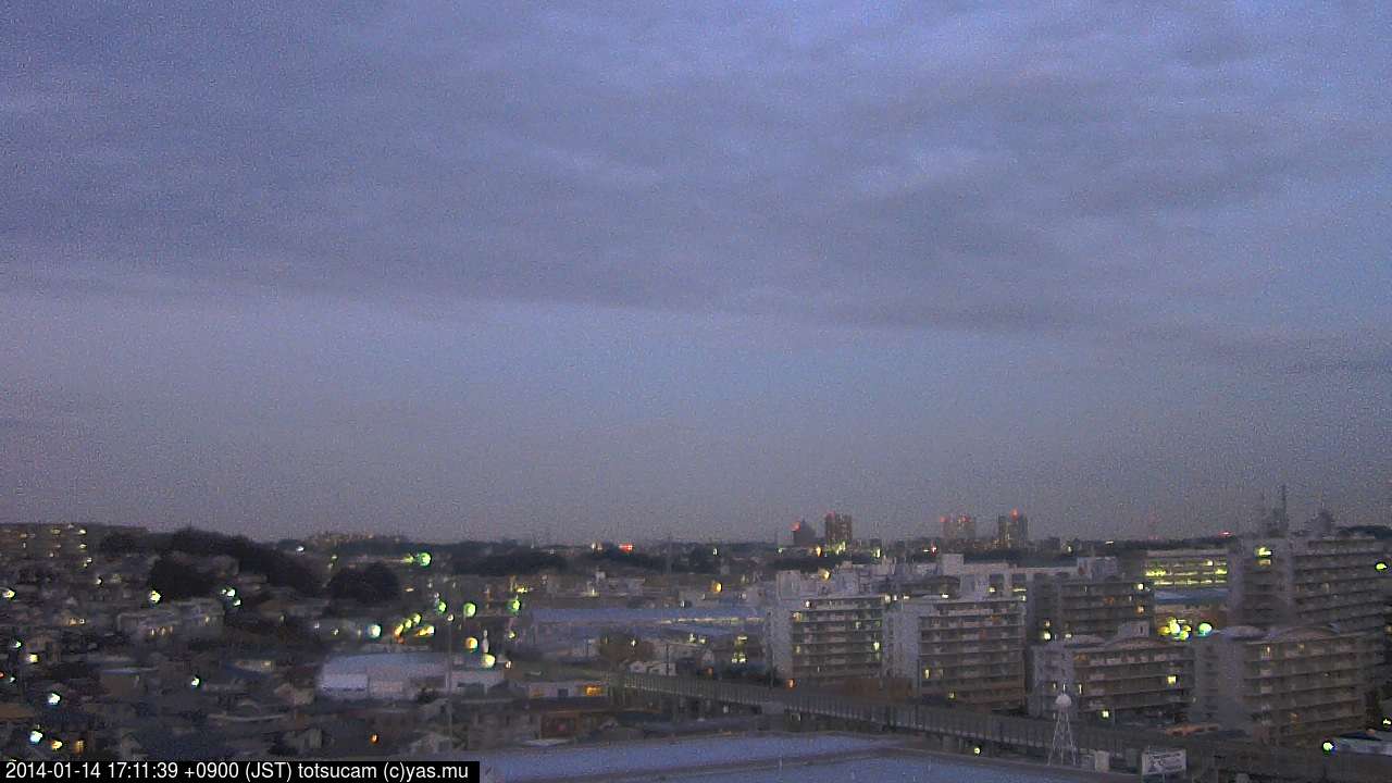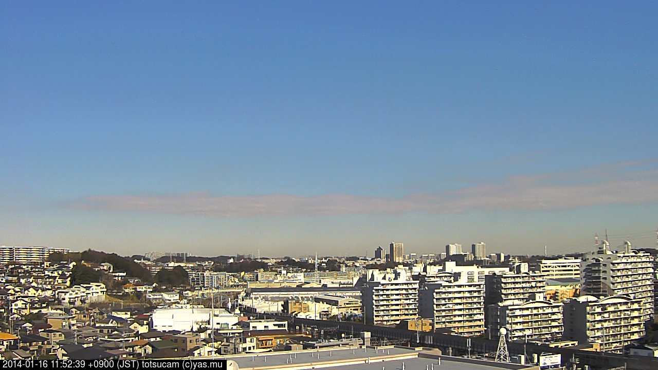 適度に曇った日の雲の動き (例: 2005-10-24) がとても楽しめます。 正面を横切っている高架は横須賀線下りです。 その下に横須賀線上り、東海道線、同貨物線が走っていますが、 高架に隠れていてよく見えません。 夜間は特に中央左寄りの車の動きがよく見えます。