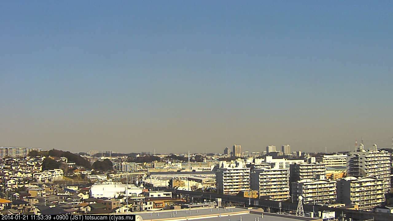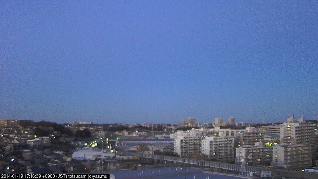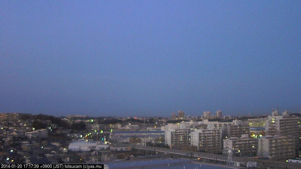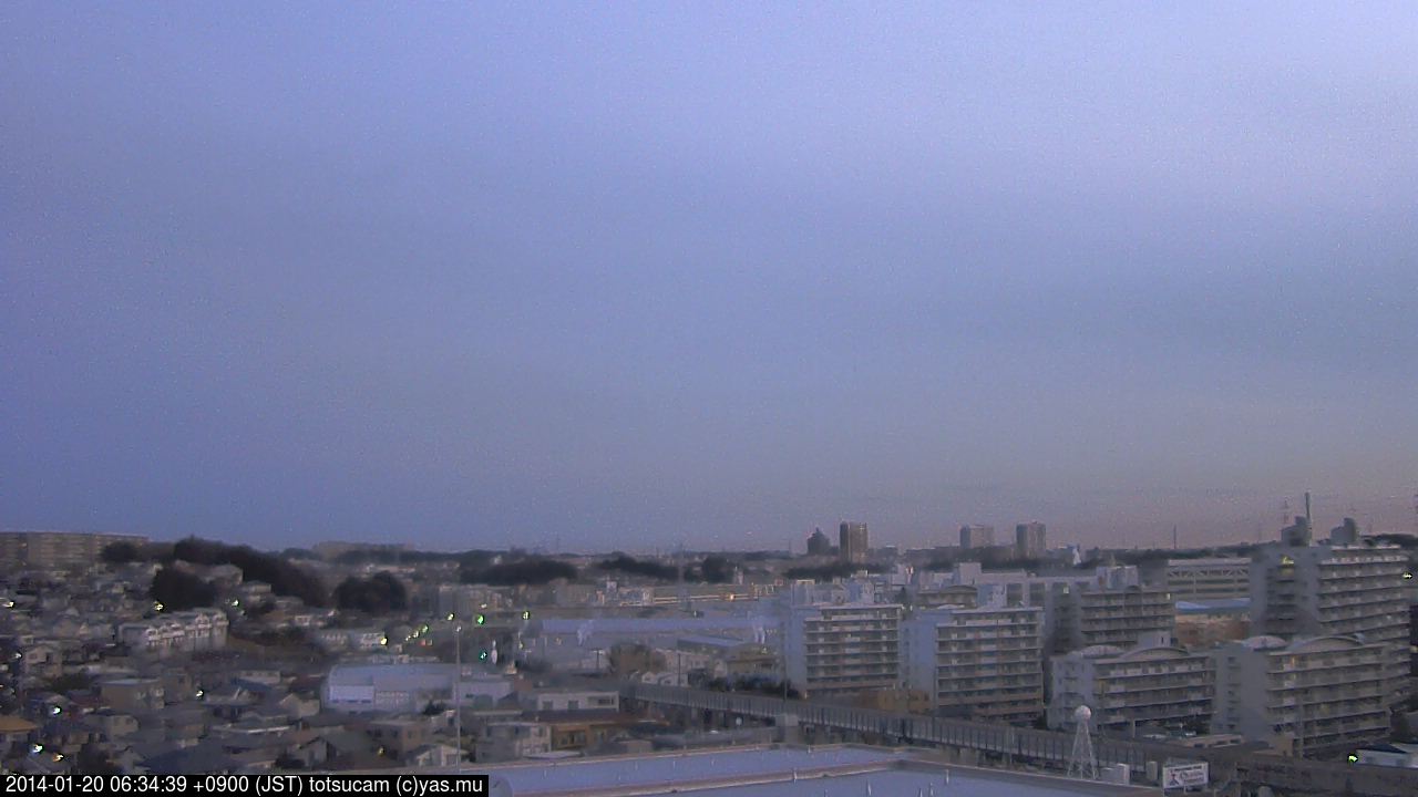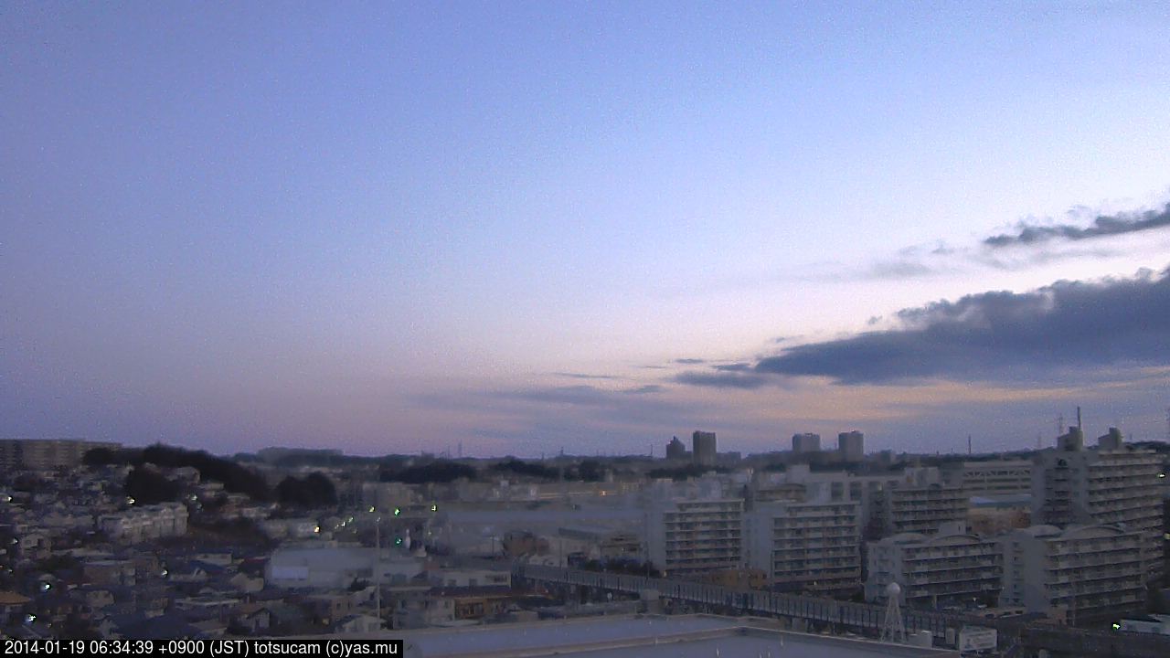 横浜市戸塚駅周辺から 東戸塚方面(北北東)を望む展望カメラの映像です。 左は現在の映像です。 下に並んでいるのは、 7日間に亘る日の出どき、昼間、夕暮れどきの写真(サムネイル)です。 それぞれ、日の出15分前、南中時、日没20分後の写真となっています。 各写真の下にはmpeg形式の動画へのリンクがあります。 それぞれ、日の出、南中、日没の前後1時間の画像です。 右欄にはその日24時間の動画へのリンクがあります。 この7日間以外は日付が一覧表示されています。 日付部分をクリックすると、 その日付から7日分が展開されて表示されます。