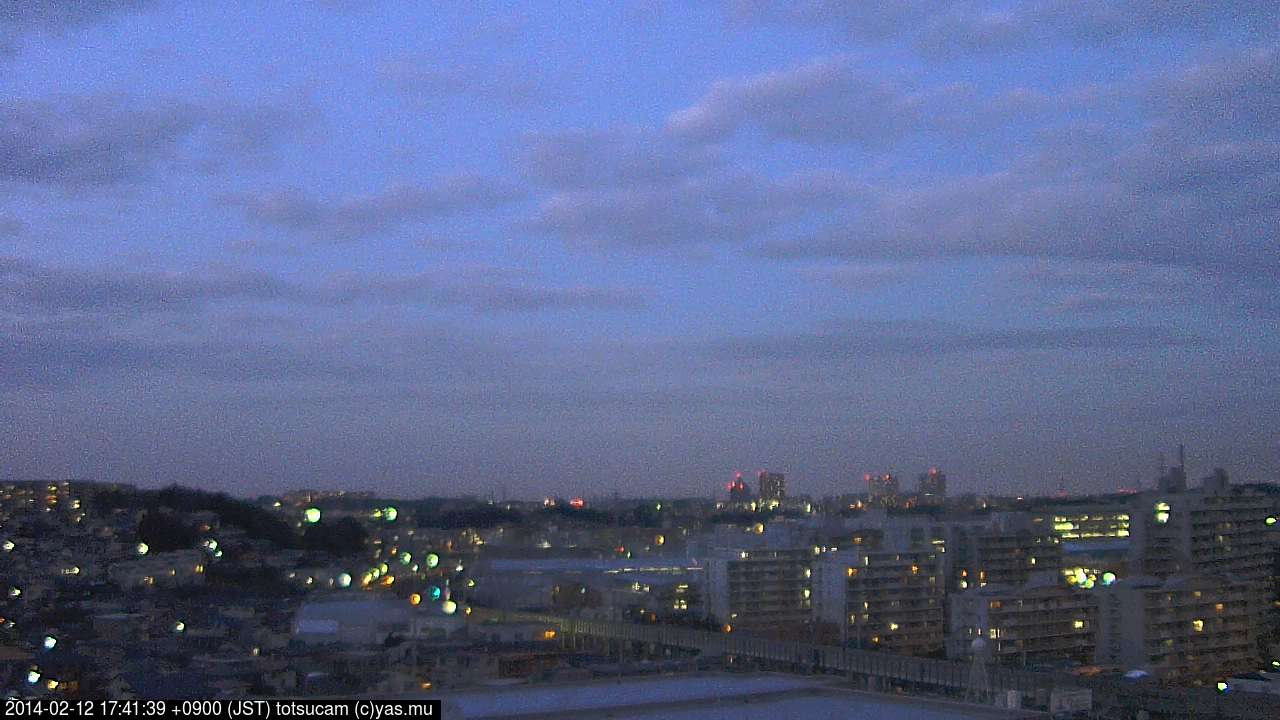 横浜市戸塚駅周辺から 東戸塚方面(北北東)を望む展望カメラの映像です。 左は現在の映像です。 下に並んでいるのは、 7日間に亘る日の出どき、昼間、夕暮れどきの写真(サムネイル)です。 それぞれ、日の出15分前、南中時、日没20分後の写真となっています。 各写真の下にはmpeg形式の動画へのリンクがあります。 それぞれ、日の出、南中、日没の前後1時間の画像です。 右欄にはその日24時間の動画へのリンクがあります。 この7日間以外は日付が一覧表示されています。 日付部分をクリックすると、 その日付から7日分が展開されて表示されます。