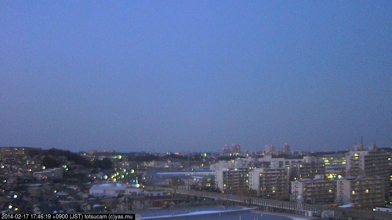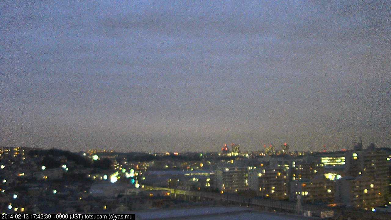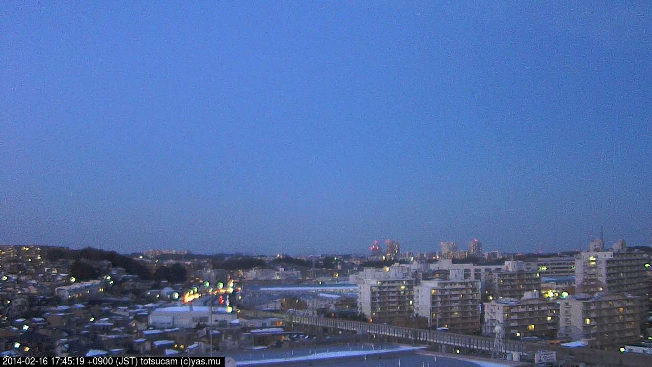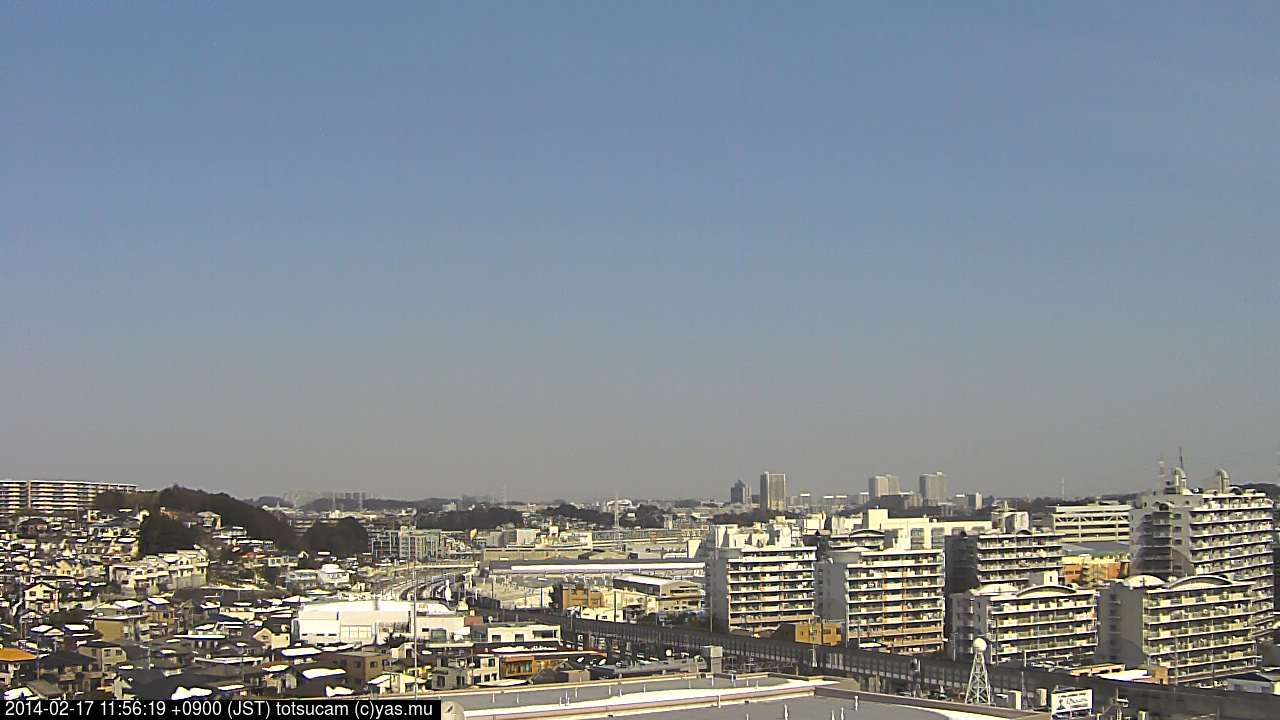 適度に曇った日の雲の動き (例: 2005-10-24) がとても楽しめます。 正面を横切っている高架は横須賀線下りです。 その下に横須賀線上り、東海道線、同貨物線が走っていますが、 高架に隠れていてよく見えません。 夜間は特に中央左寄りの車の動きがよく見えます。