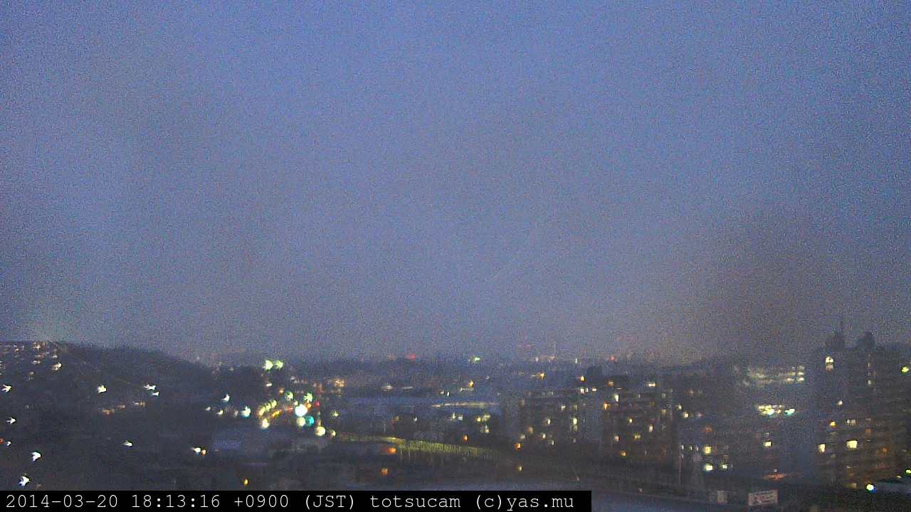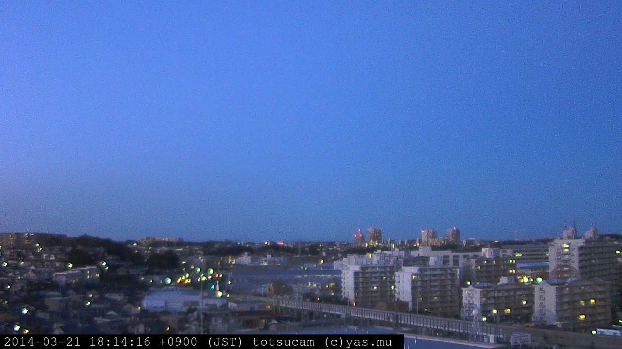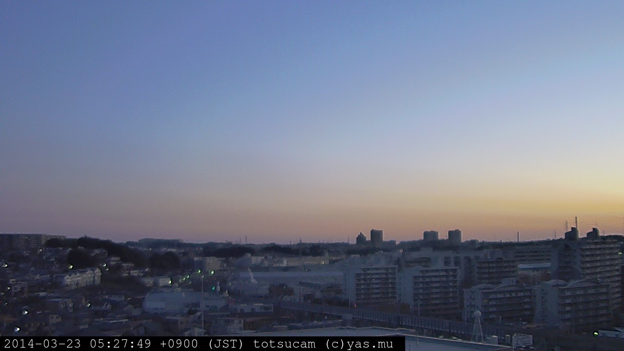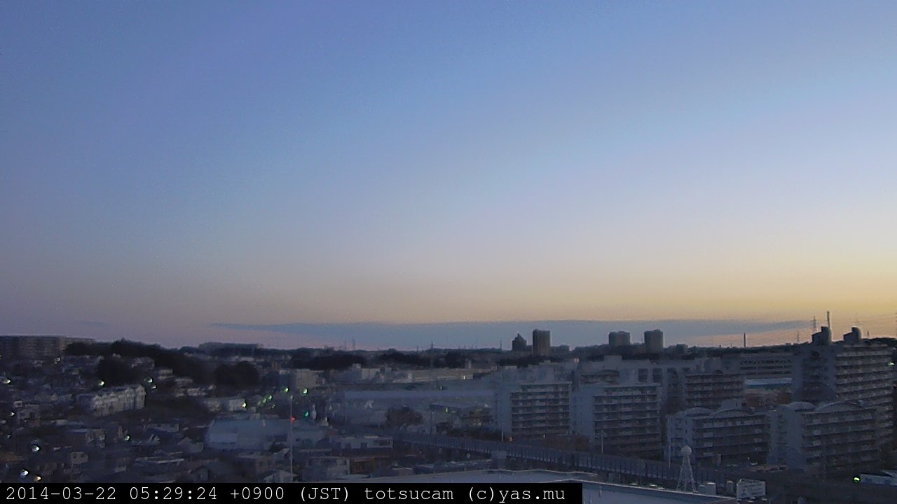 横浜市戸塚駅周辺から 東戸塚方面(北北東)を望む展望カメラの映像です。 左は現在の映像です。 下に並んでいるのは、 7日間に亘る日の出どき、昼間、夕暮れどきの写真(サムネイル)です。 それぞれ、日の出15分前、南中時、日没20分後の写真となっています。 各写真の下にはmpeg形式の動画へのリンクがあります。 それぞれ、日の出、南中、日没の前後1時間の画像です。 右欄にはその日24時間の動画へのリンクがあります。 この7日間以外は日付が一覧表示されています。 日付部分をクリックすると、 その日付から7日分が展開されて表示されます。