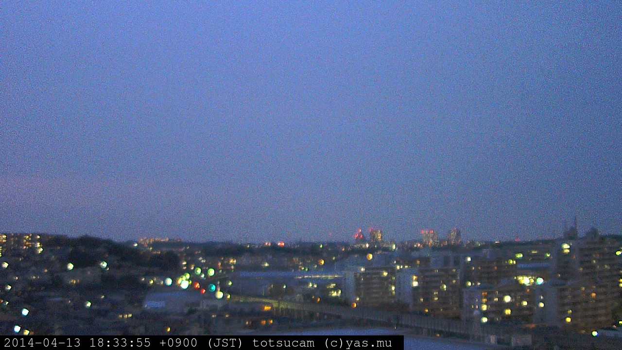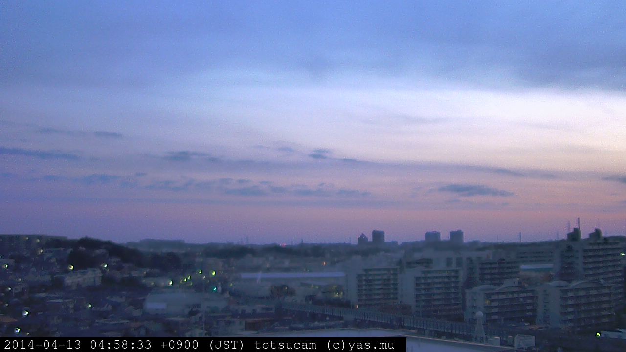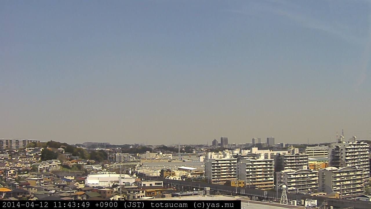 横浜市戸塚駅周辺から 東戸塚方面(北北東)を望む展望カメラの映像です。 左は現在の映像です。 下に並んでいるのは、 7日間に亘る日の出どき、昼間、夕暮れどきの写真(サムネイル)です。 それぞれ、日の出15分前、南中時、日没20分後の写真となっています。 各写真の下にはmpeg形式の動画へのリンクがあります。 それぞれ、日の出、南中、日没の前後1時間の画像です。 右欄にはその日24時間の動画へのリンクがあります。 この7日間以外は日付が一覧表示されています。 日付部分をクリックすると、 その日付から7日分が展開されて表示されます。