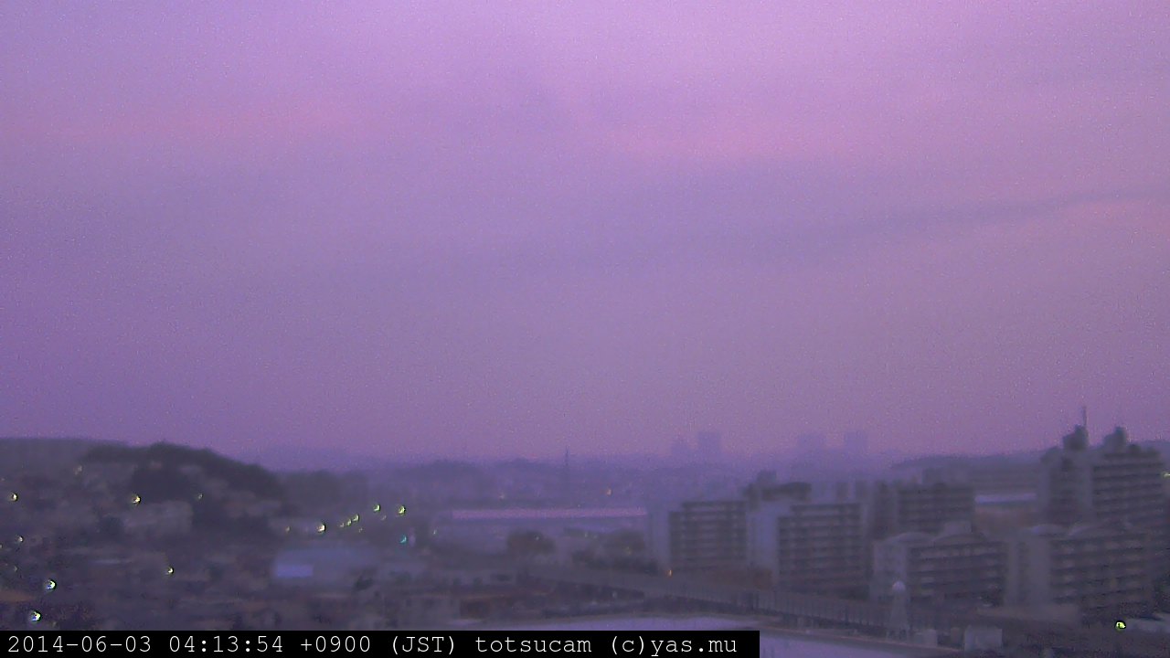 横浜市戸塚駅周辺から 東戸塚方面(北北東)を望む展望カメラの映像です。 左は現在の映像です。 下に並んでいるのは、 7日間に亘る日の出どき、昼間、夕暮れどきの写真(サムネイル)です。 それぞれ、日の出15分前、南中時、日没20分後の写真となっています。 各写真の下にはmpeg形式の動画へのリンクがあります。 それぞれ、日の出、南中、日没の前後1時間の画像です。 右欄にはその日24時間の動画へのリンクがあります。 この7日間以外は日付が一覧表示されています。 日付部分をクリックすると、 その日付から7日分が展開されて表示されます。
