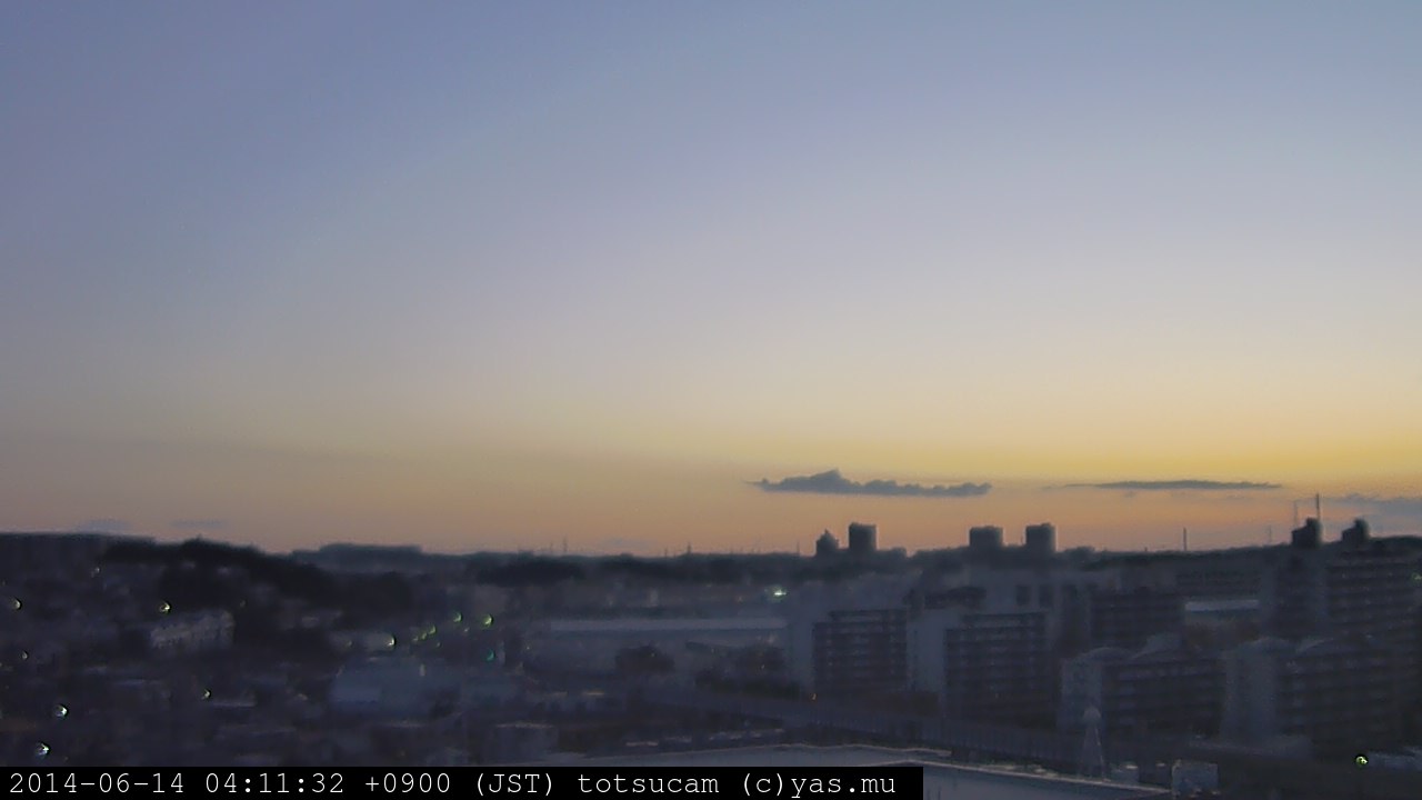横浜市戸塚駅周辺から 東戸塚方面(北北東)を望む展望カメラの映像です。 左は現在の映像です。 下に並んでいるのは、 7日間に亘る日の出どき、昼間、夕暮れどきの写真(サムネイル)です。 それぞれ、日の出15分前、南中時、日没20分後の写真となっています。 各写真の下にはmpeg形式の動画へのリンクがあります。 それぞれ、日の出、南中、日没の前後1時間の画像です。 右欄にはその日24時間の動画へのリンクがあります。 この7日間以外は日付が一覧表示されています。 日付部分をクリックすると、 その日付から7日分が展開されて表示されます。
