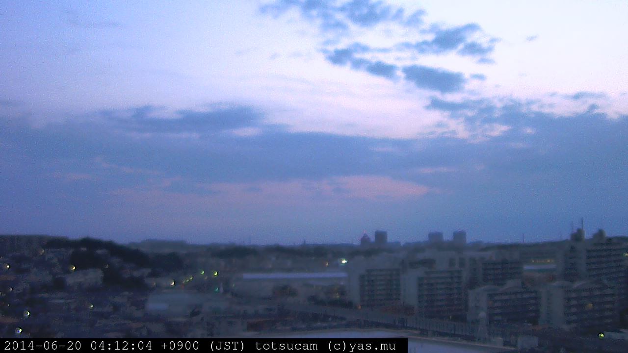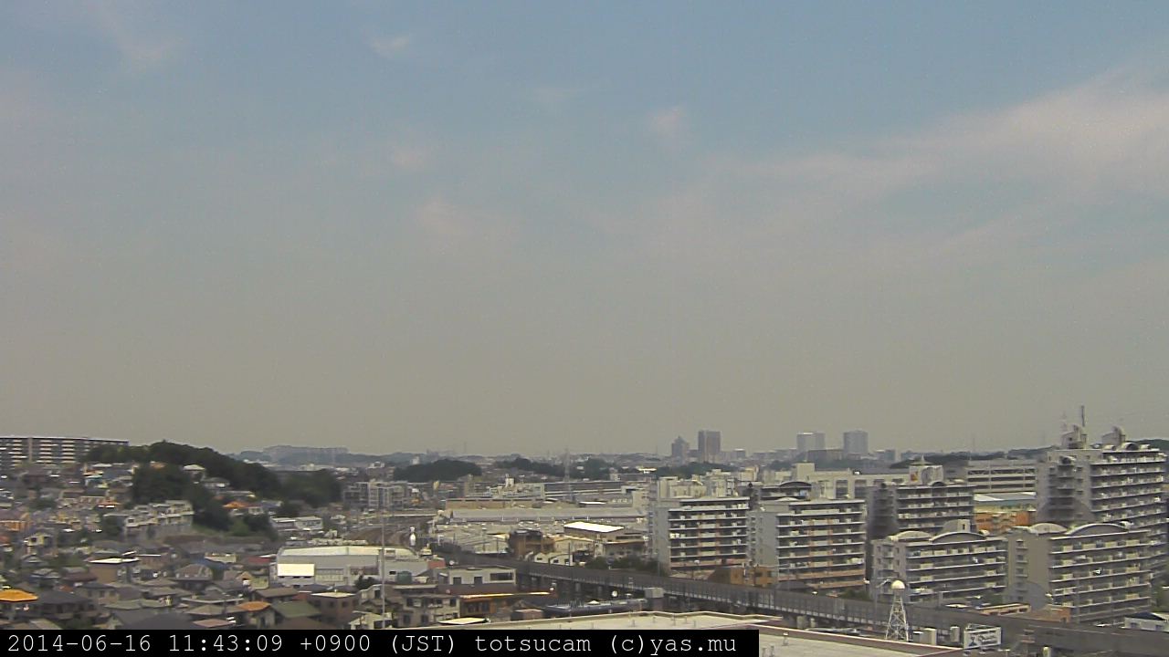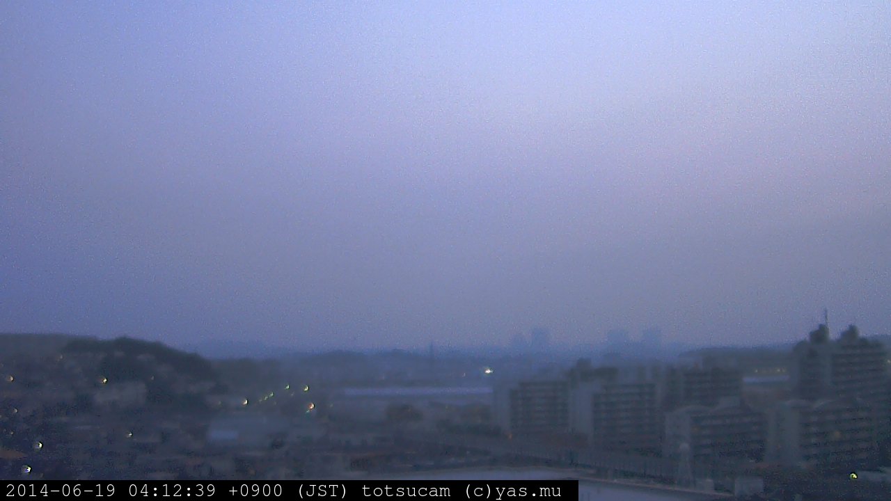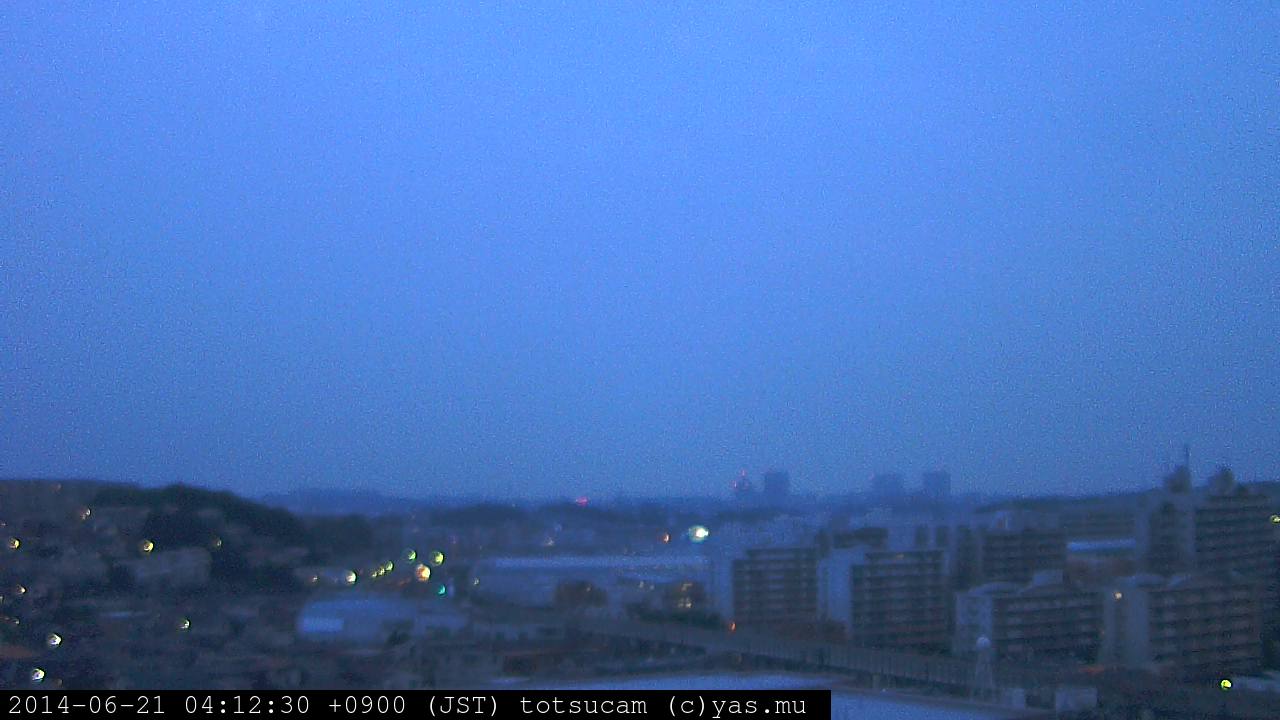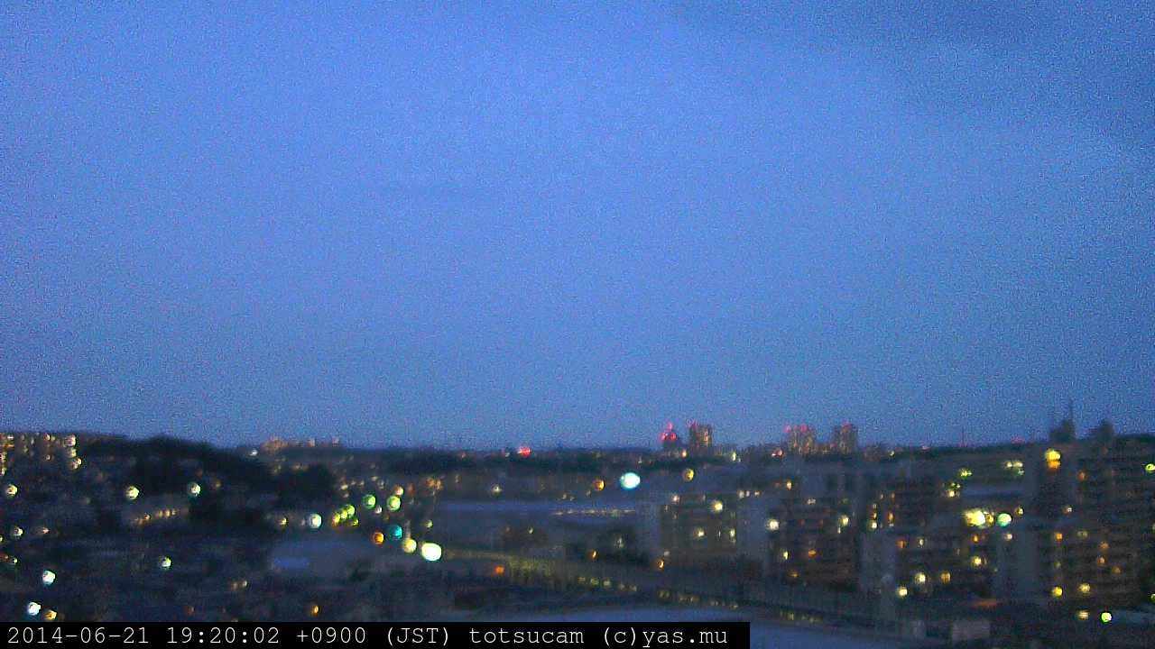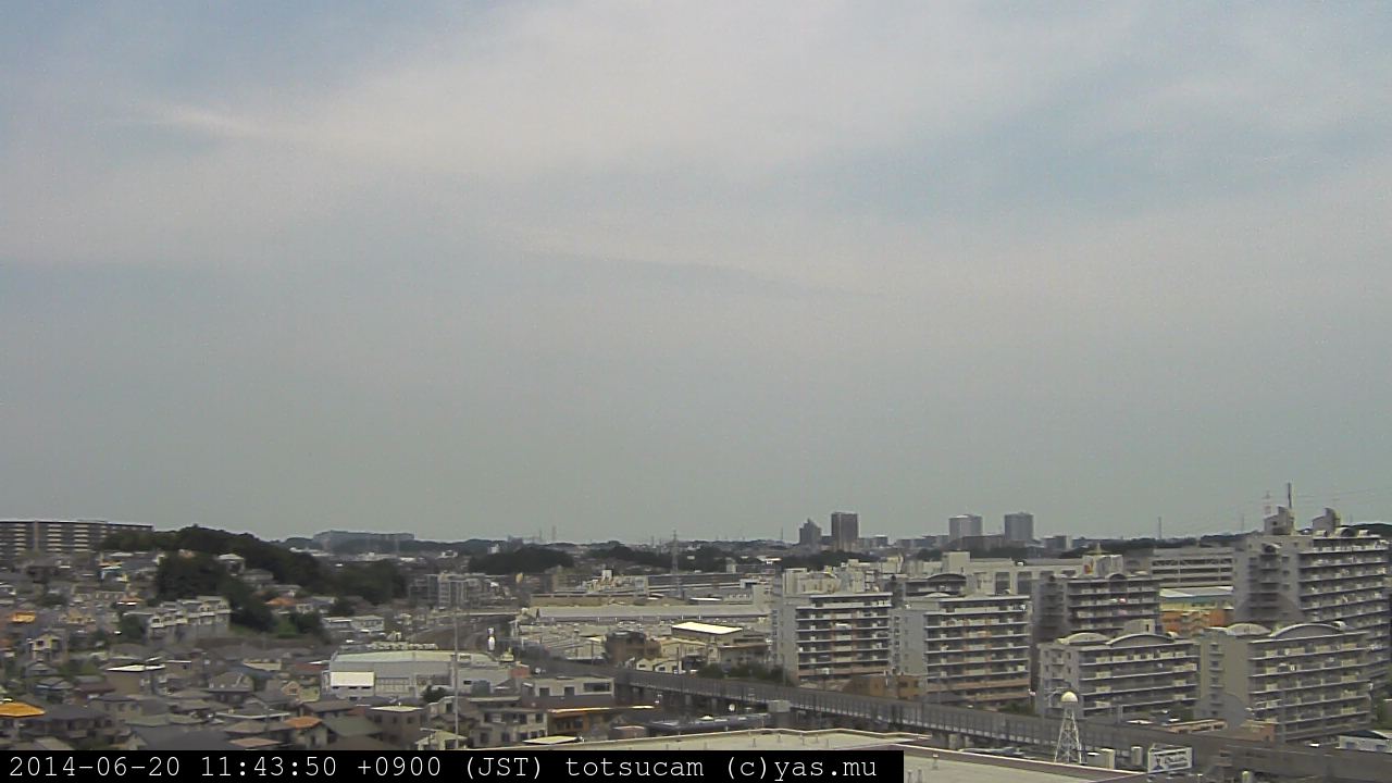 横浜市戸塚駅周辺から 東戸塚方面(北北東)を望む展望カメラの映像です。 左は現在の映像です。 下に並んでいるのは、 7日間に亘る日の出どき、昼間、夕暮れどきの写真(サムネイル)です。 それぞれ、日の出15分前、南中時、日没20分後の写真となっています。 各写真の下にはmpeg形式の動画へのリンクがあります。 それぞれ、日の出、南中、日没の前後1時間の画像です。 右欄にはその日24時間の動画へのリンクがあります。 この7日間以外は日付が一覧表示されています。 日付部分をクリックすると、 その日付から7日分が展開されて表示されます。