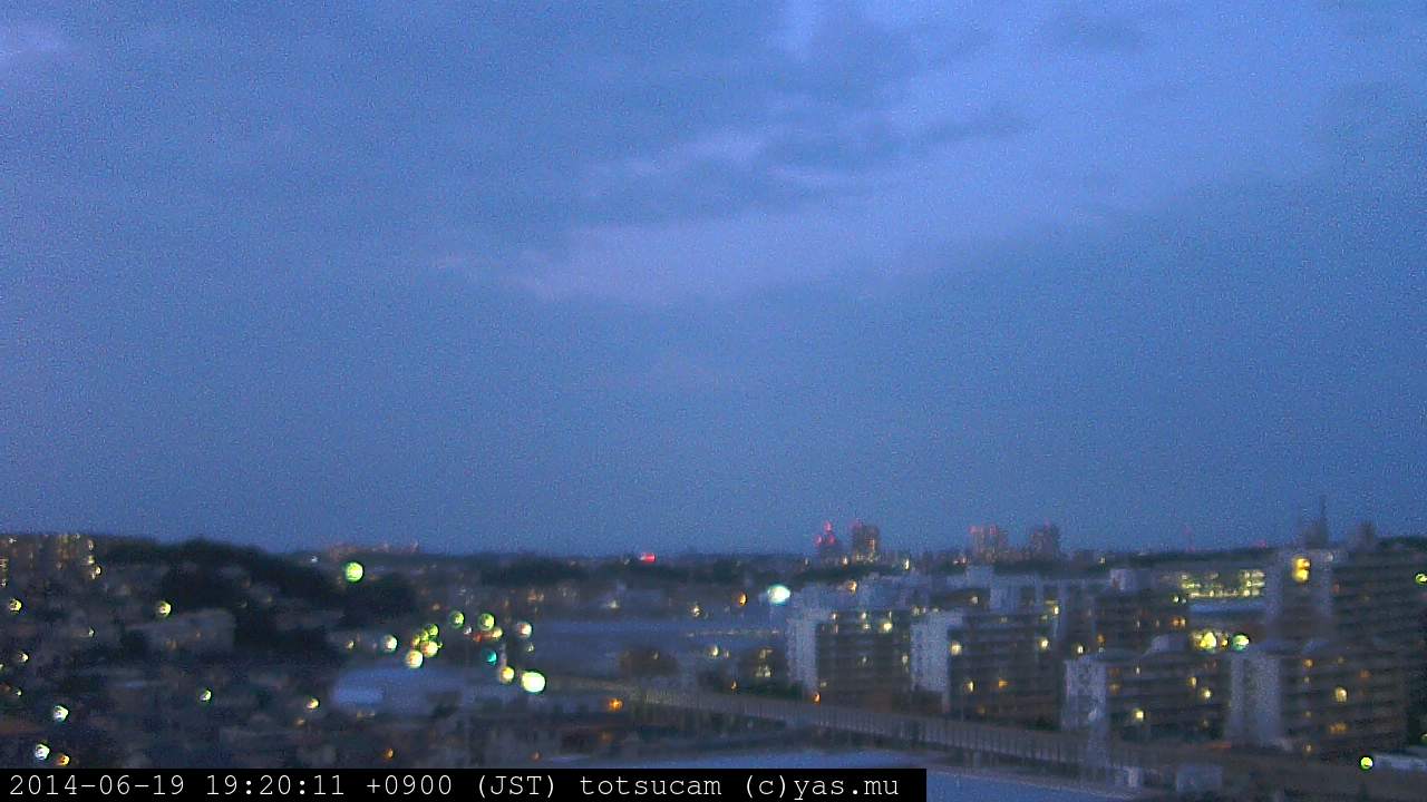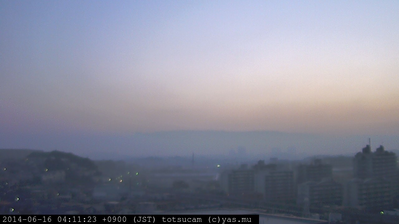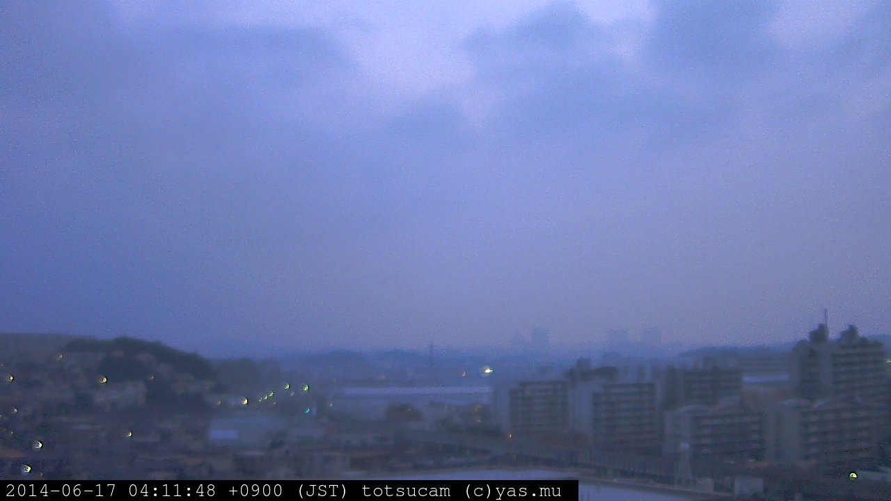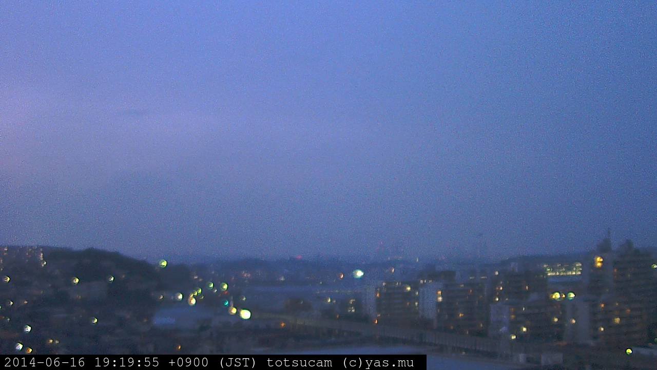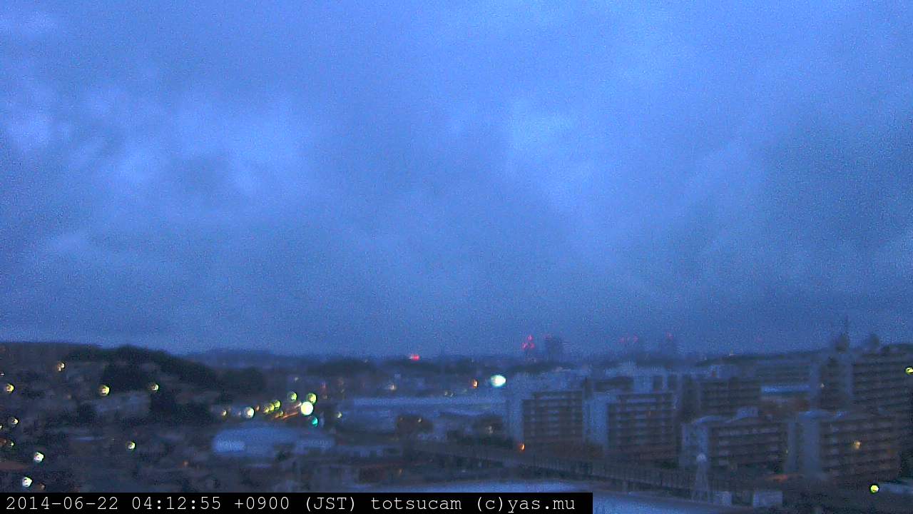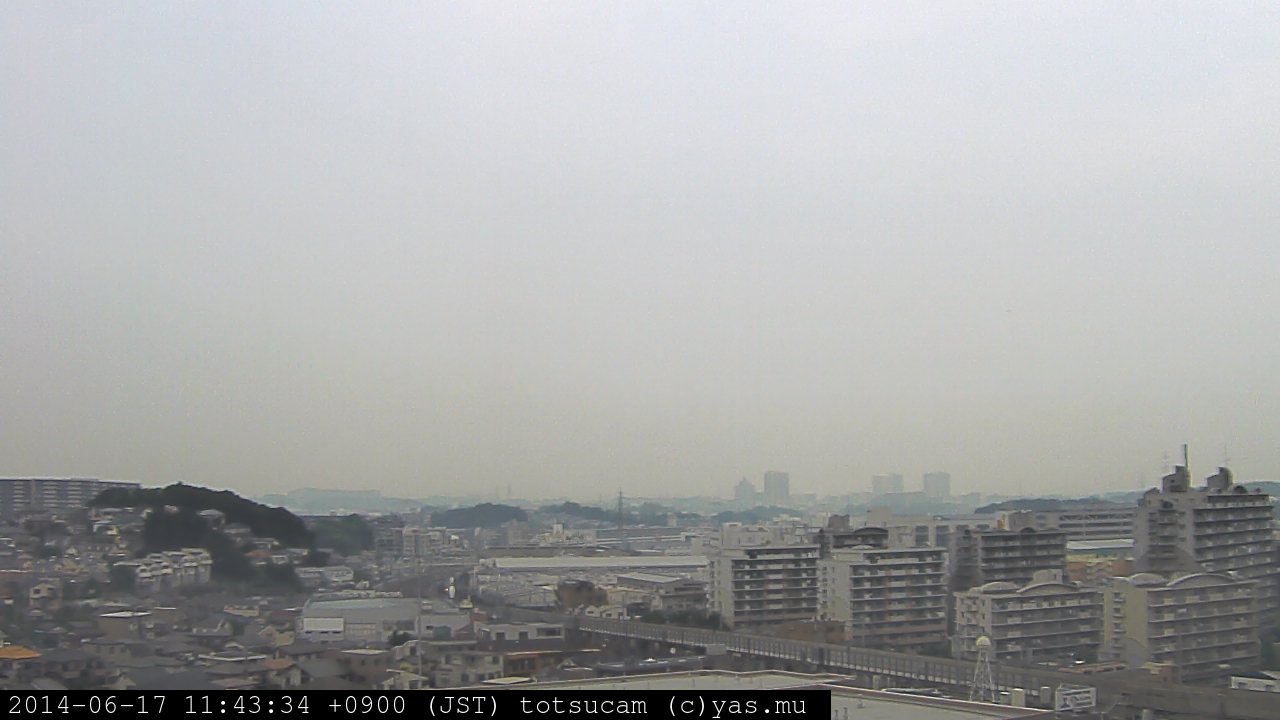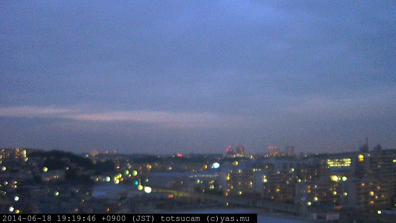 横浜市戸塚駅周辺から 東戸塚方面(北北東)を望む展望カメラの映像です。 左は現在の映像です。 下に並んでいるのは、 7日間に亘る日の出どき、昼間、夕暮れどきの写真(サムネイル)です。 それぞれ、日の出15分前、南中時、日没20分後の写真となっています。 各写真の下にはmpeg形式の動画へのリンクがあります。 それぞれ、日の出、南中、日没の前後1時間の画像です。 右欄にはその日24時間の動画へのリンクがあります。 この7日間以外は日付が一覧表示されています。 日付部分をクリックすると、 その日付から7日分が展開されて表示されます。