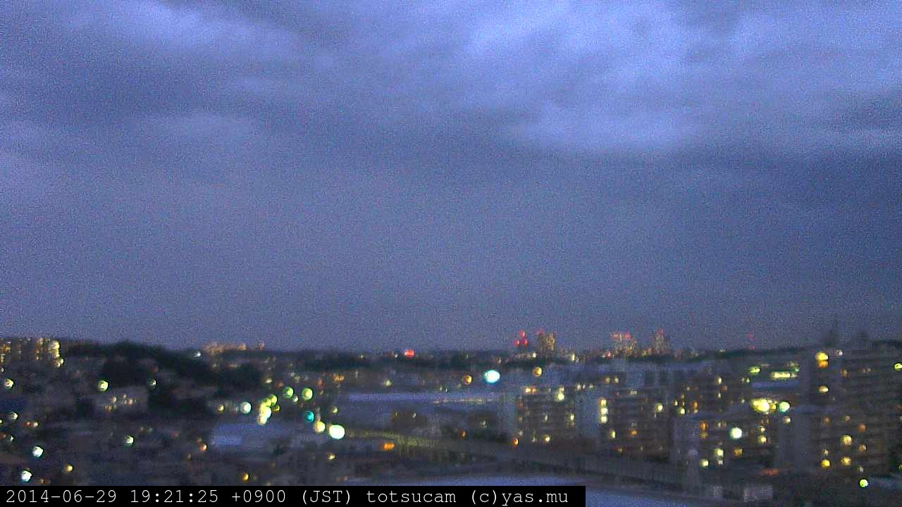 適度に曇った日の雲の動き (例: 2005-10-24) がとても楽しめます。 正面を横切っている高架は横須賀線下りです。 その下に横須賀線上り、東海道線、同貨物線が走っていますが、 高架に隠れていてよく見えません。 夜間は特に中央左寄りの車の動きがよく見えます。