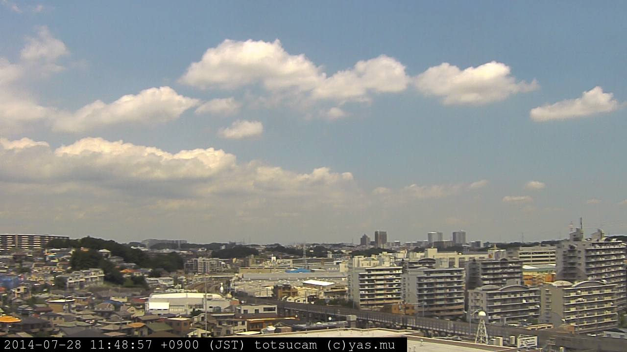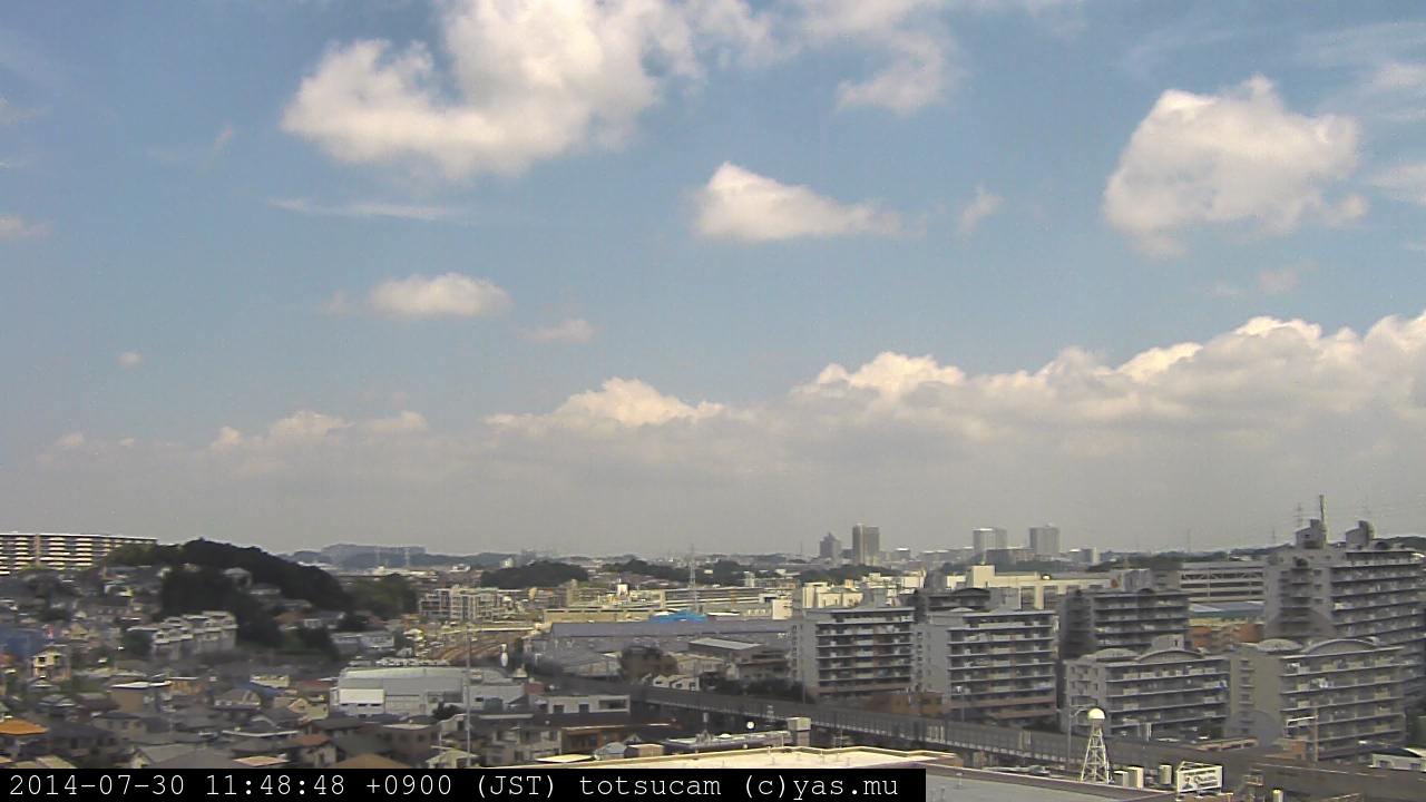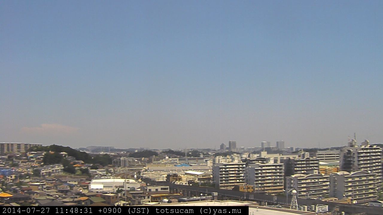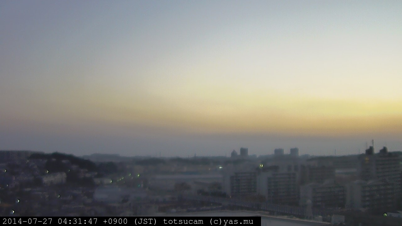 横浜市戸塚駅周辺から 東戸塚方面(北北東)を望む展望カメラの映像です。 左は現在の映像です。 下に並んでいるのは、 7日間に亘る日の出どき、昼間、夕暮れどきの写真(サムネイル)です。 それぞれ、日の出15分前、南中時、日没20分後の写真となっています。 各写真の下にはmpeg形式の動画へのリンクがあります。 それぞれ、日の出、南中、日没の前後1時間の画像です。 右欄にはその日24時間の動画へのリンクがあります。 この7日間以外は日付が一覧表示されています。 日付部分をクリックすると、 その日付から7日分が展開されて表示されます。