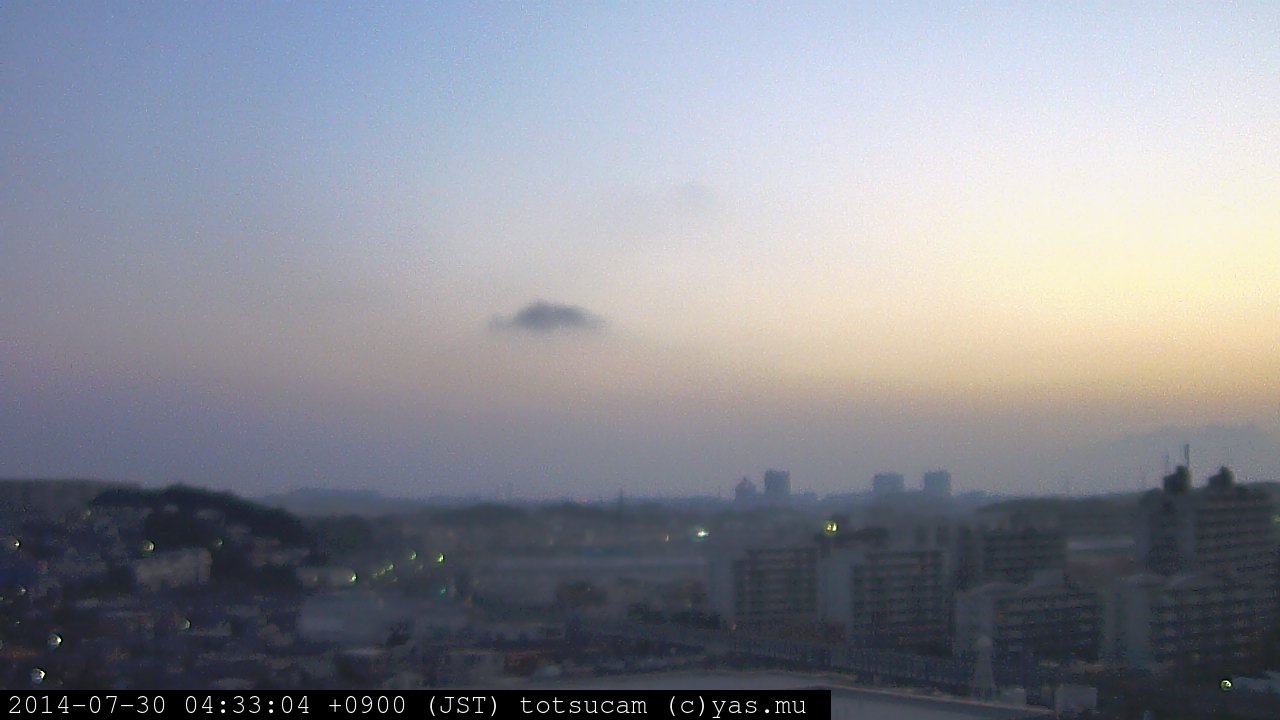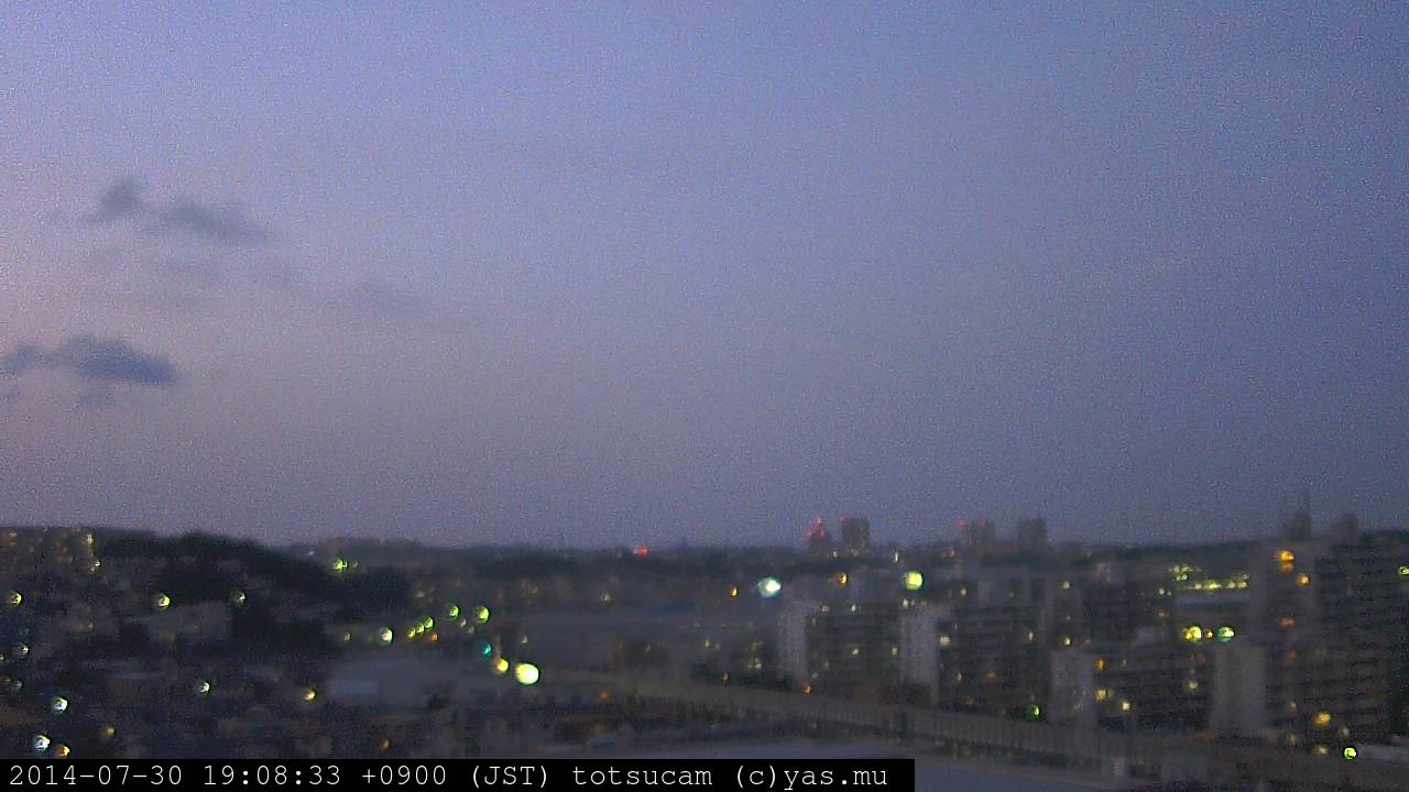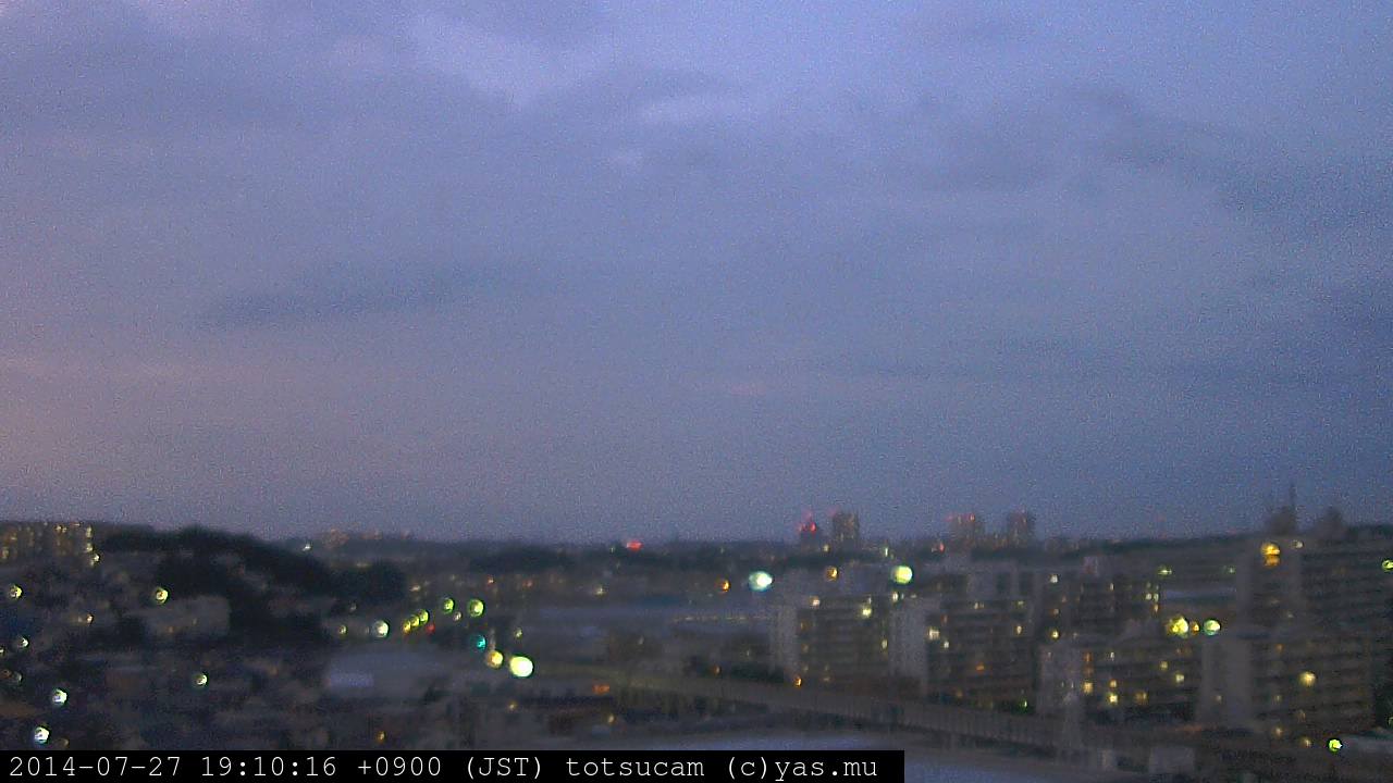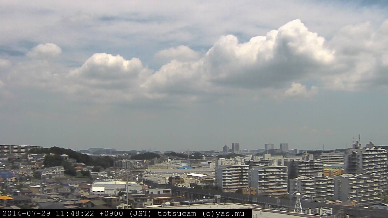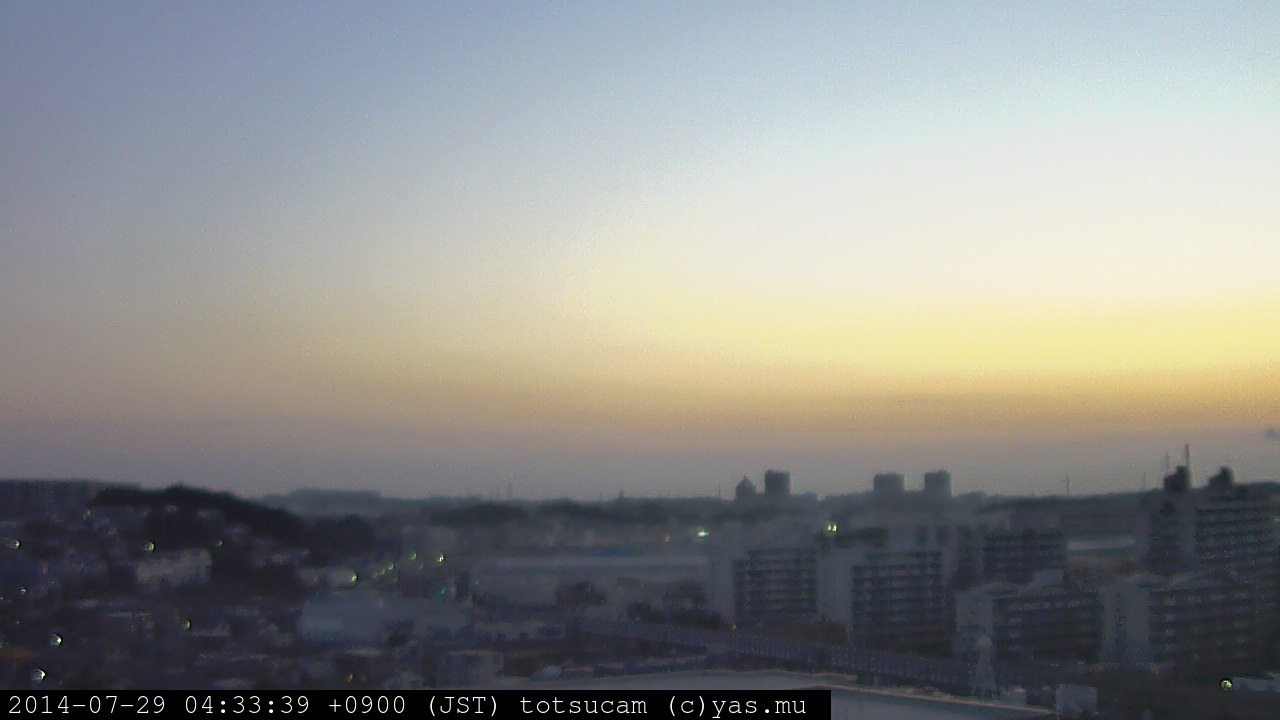 横浜市戸塚駅周辺から 東戸塚方面(北北東)を望む展望カメラの映像です。 左は現在の映像です。 下に並んでいるのは、 7日間に亘る日の出どき、昼間、夕暮れどきの写真(サムネイル)です。 それぞれ、日の出15分前、南中時、日没20分後の写真となっています。 各写真の下にはmpeg形式の動画へのリンクがあります。 それぞれ、日の出、南中、日没の前後1時間の画像です。 右欄にはその日24時間の動画へのリンクがあります。 この7日間以外は日付が一覧表示されています。 日付部分をクリックすると、 その日付から7日分が展開されて表示されます。