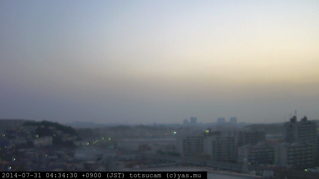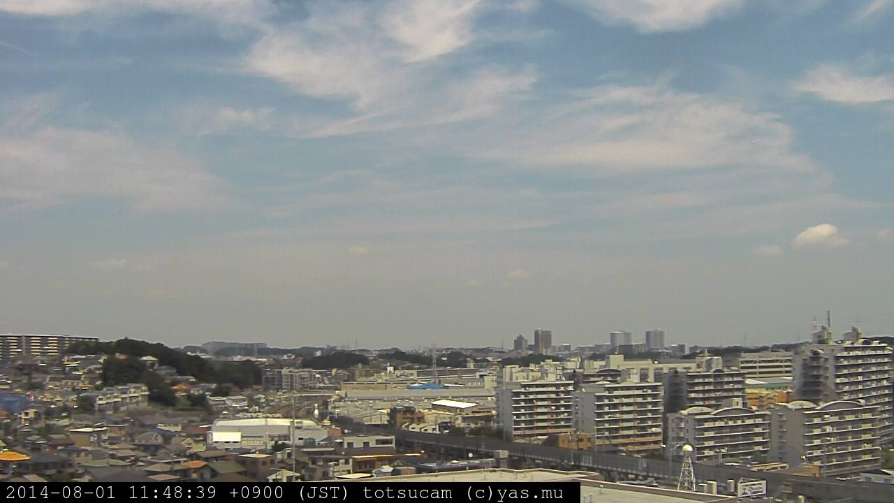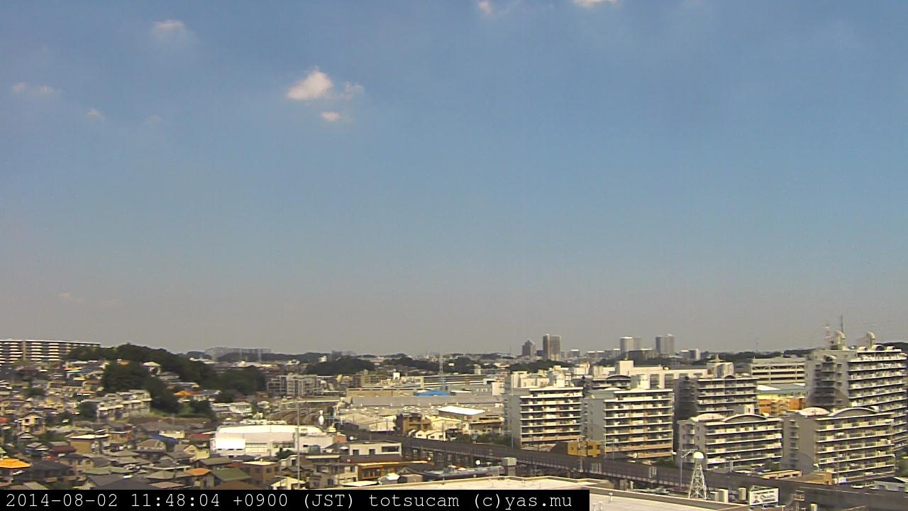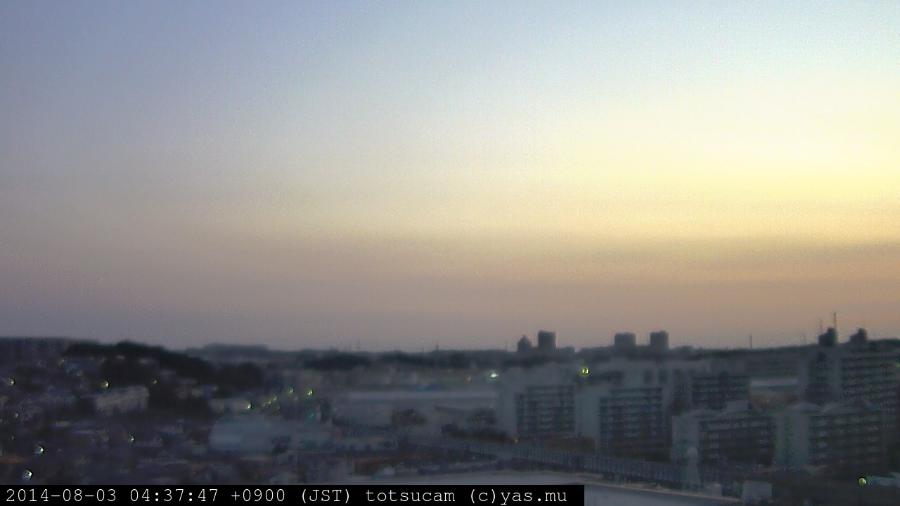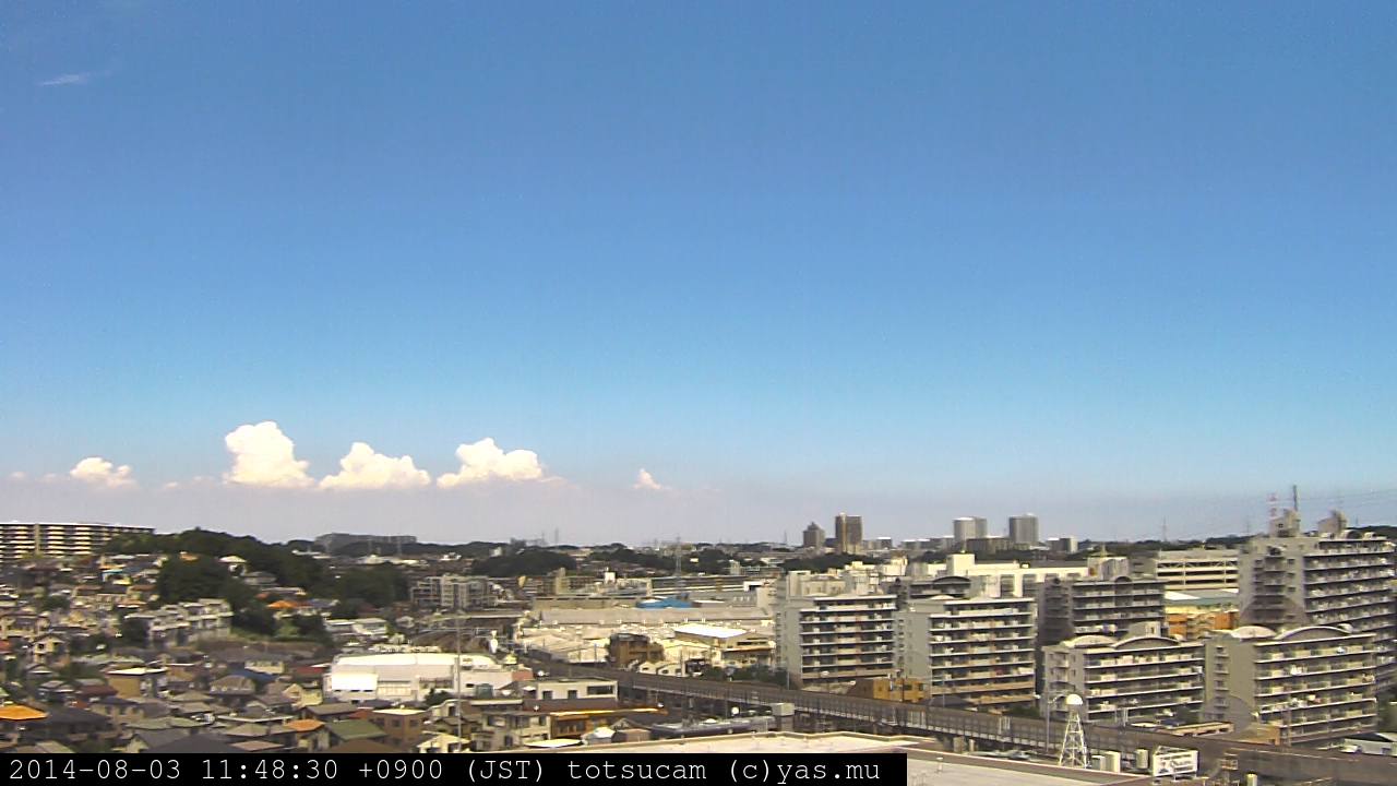 横浜市戸塚駅周辺から 東戸塚方面(北北東)を望む展望カメラの映像です。 左は現在の映像です。 下に並んでいるのは、 7日間に亘る日の出どき、昼間、夕暮れどきの写真(サムネイル)です。 それぞれ、日の出15分前、南中時、日没20分後の写真となっています。 各写真の下にはmpeg形式の動画へのリンクがあります。 それぞれ、日の出、南中、日没の前後1時間の画像です。 右欄にはその日24時間の動画へのリンクがあります。 この7日間以外は日付が一覧表示されています。 日付部分をクリックすると、 その日付から7日分が展開されて表示されます。