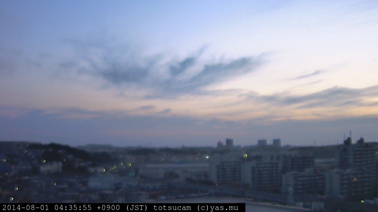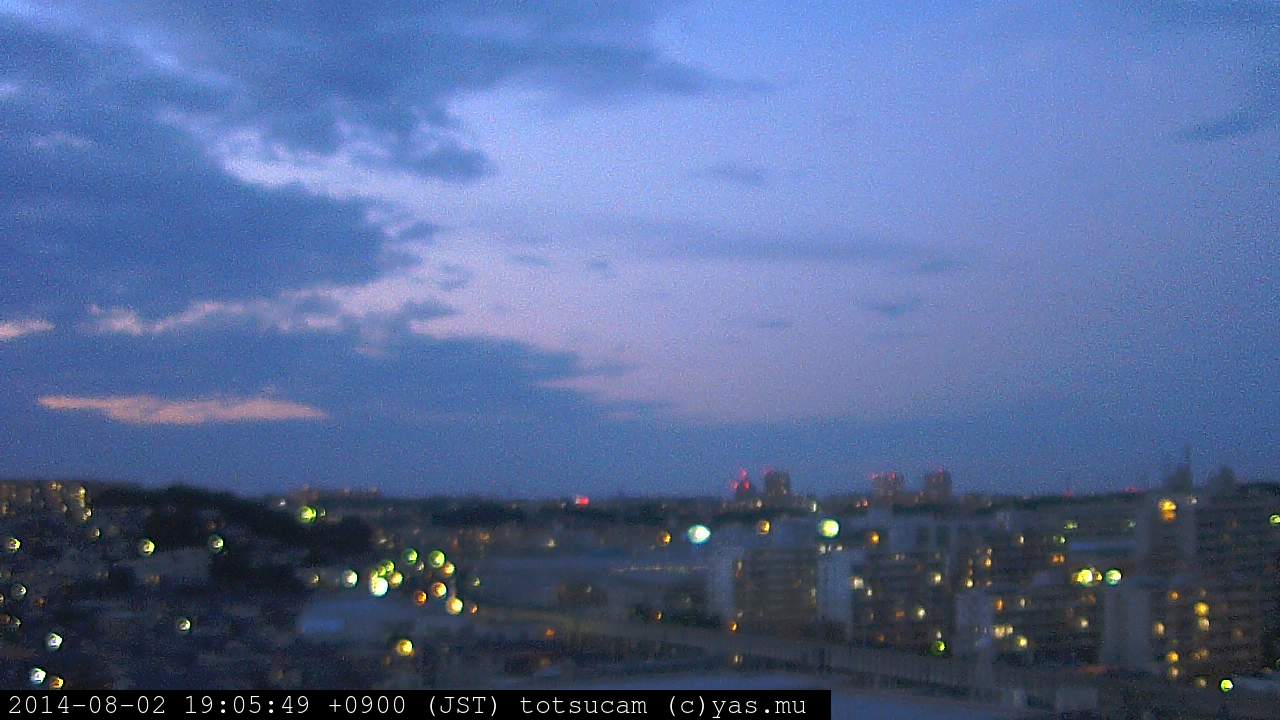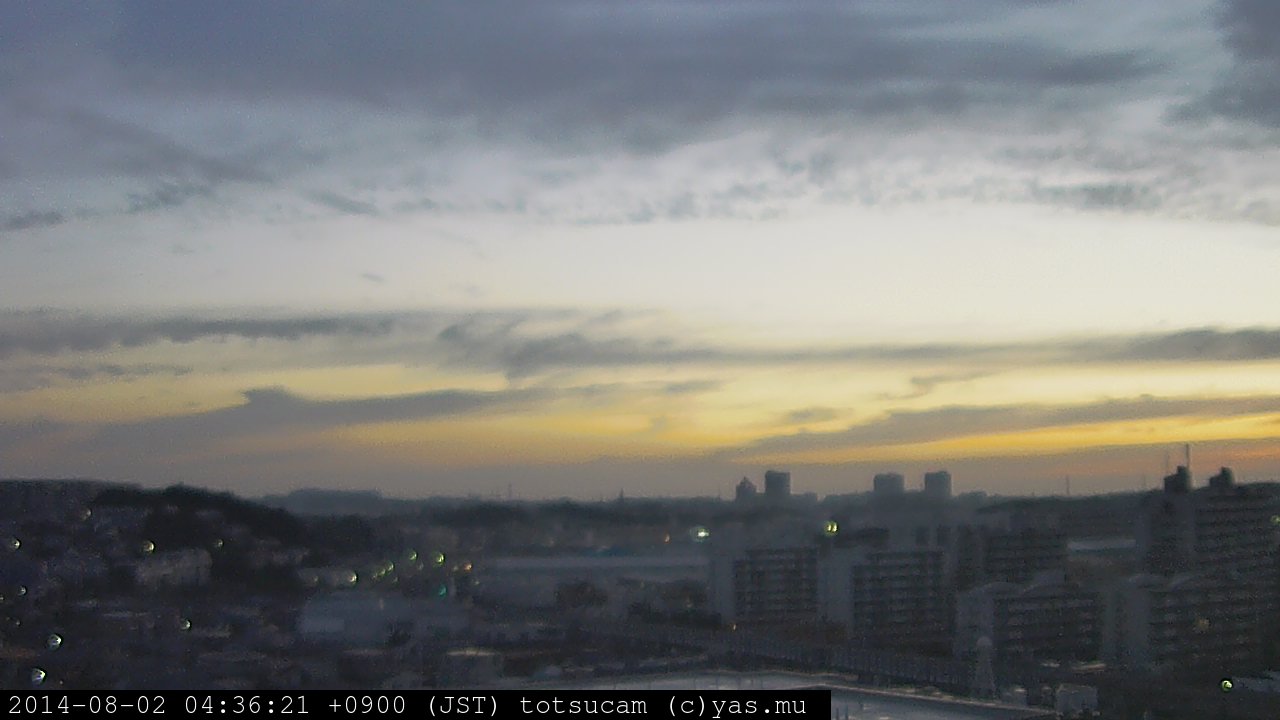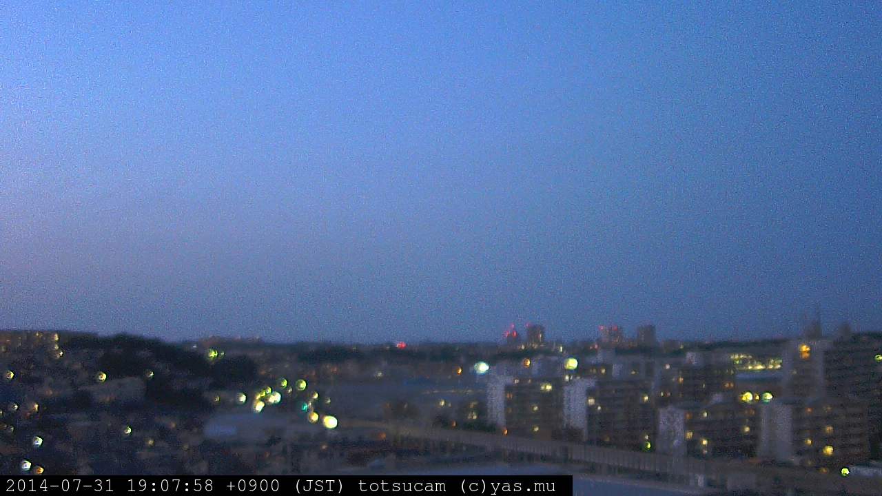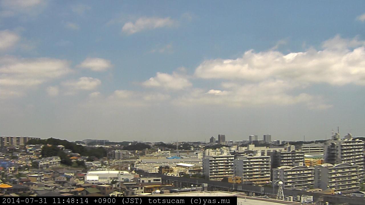 横浜市戸塚駅周辺から 東戸塚方面(北北東)を望む展望カメラの映像です。 左は現在の映像です。 下に並んでいるのは、 7日間に亘る日の出どき、昼間、夕暮れどきの写真(サムネイル)です。 それぞれ、日の出15分前、南中時、日没20分後の写真となっています。 各写真の下にはmpeg形式の動画へのリンクがあります。 それぞれ、日の出、南中、日没の前後1時間の画像です。 右欄にはその日24時間の動画へのリンクがあります。 この7日間以外は日付が一覧表示されています。 日付部分をクリックすると、 その日付から7日分が展開されて表示されます。
