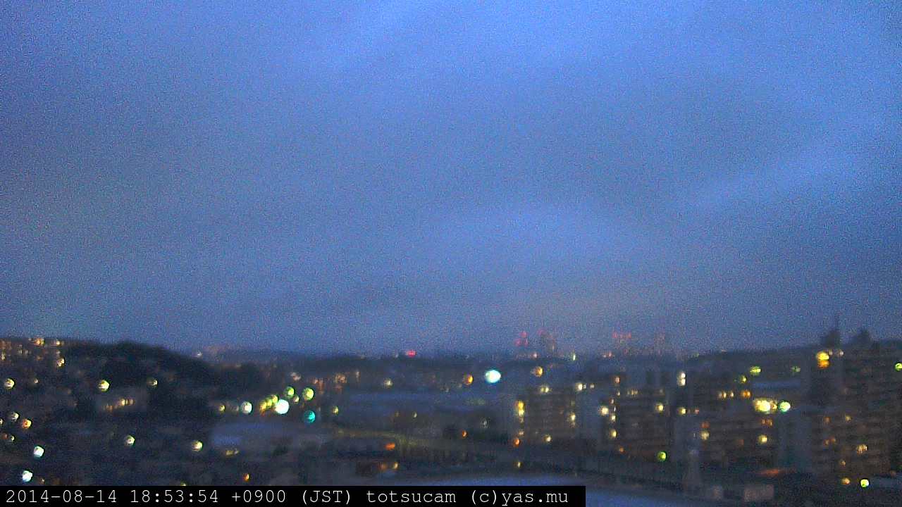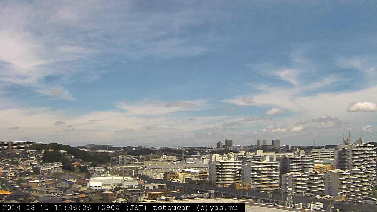 横浜市戸塚駅周辺から 東戸塚方面(北北東)を望む展望カメラの映像です。 左は現在の映像です。 下に並んでいるのは、 7日間に亘る日の出どき、昼間、夕暮れどきの写真(サムネイル)です。 それぞれ、日の出15分前、南中時、日没20分後の写真となっています。 各写真の下にはmpeg形式の動画へのリンクがあります。 それぞれ、日の出、南中、日没の前後1時間の画像です。 右欄にはその日24時間の動画へのリンクがあります。 この7日間以外は日付が一覧表示されています。 日付部分をクリックすると、 その日付から7日分が展開されて表示されます。