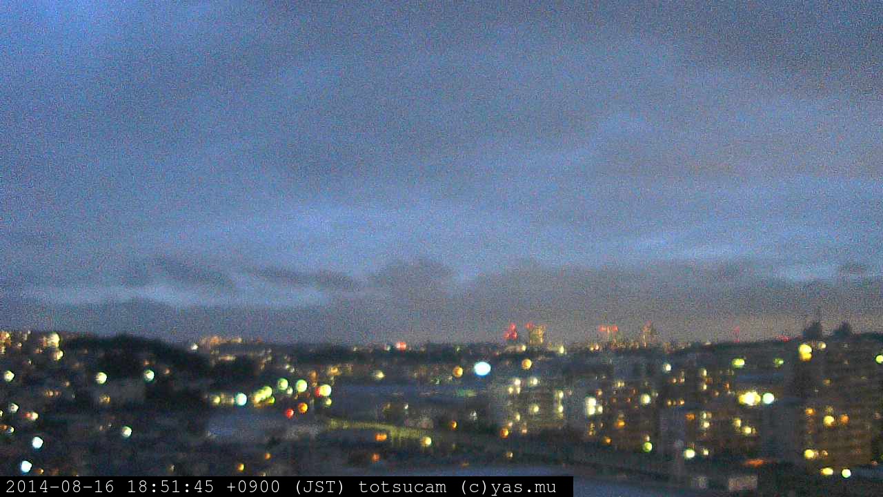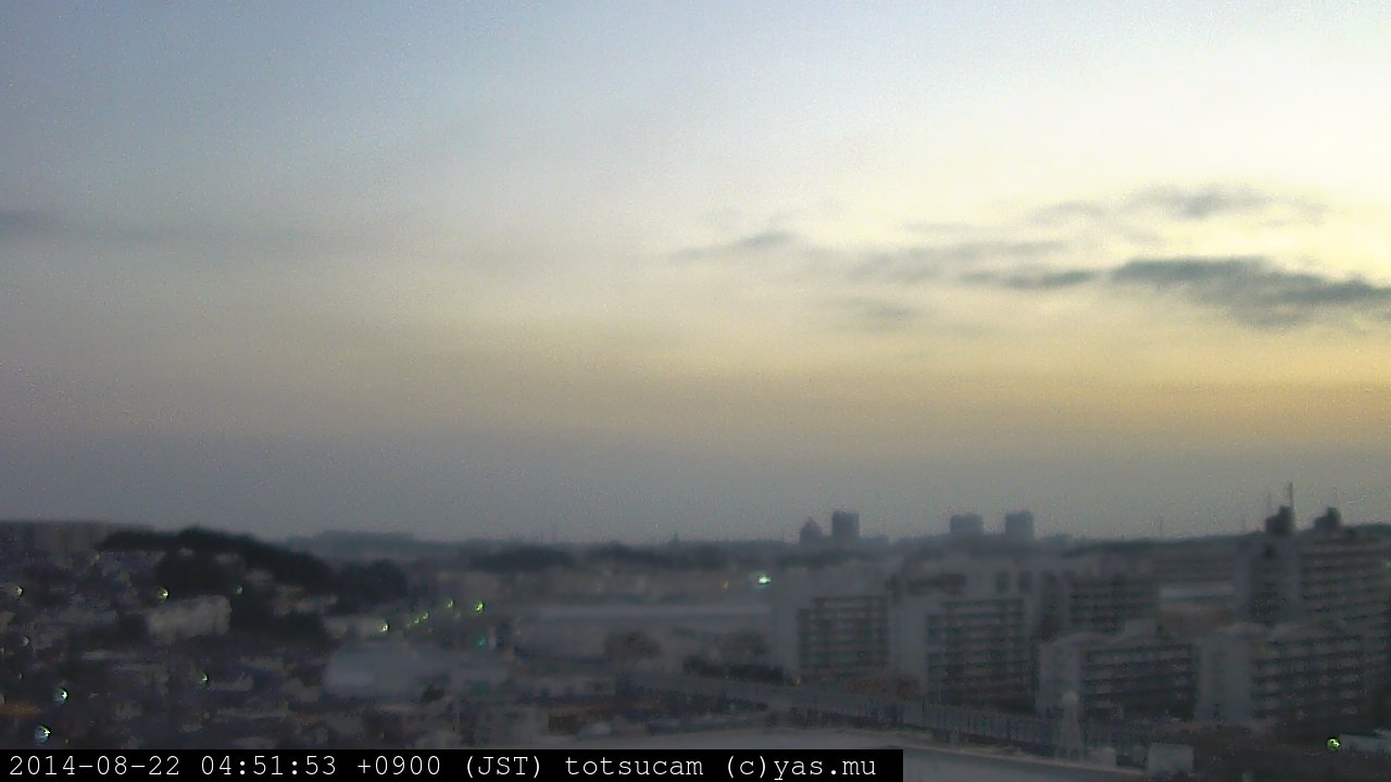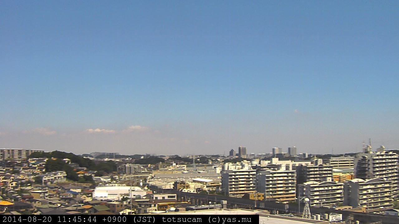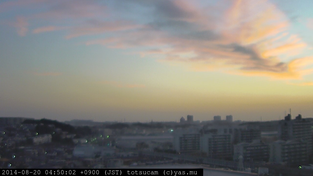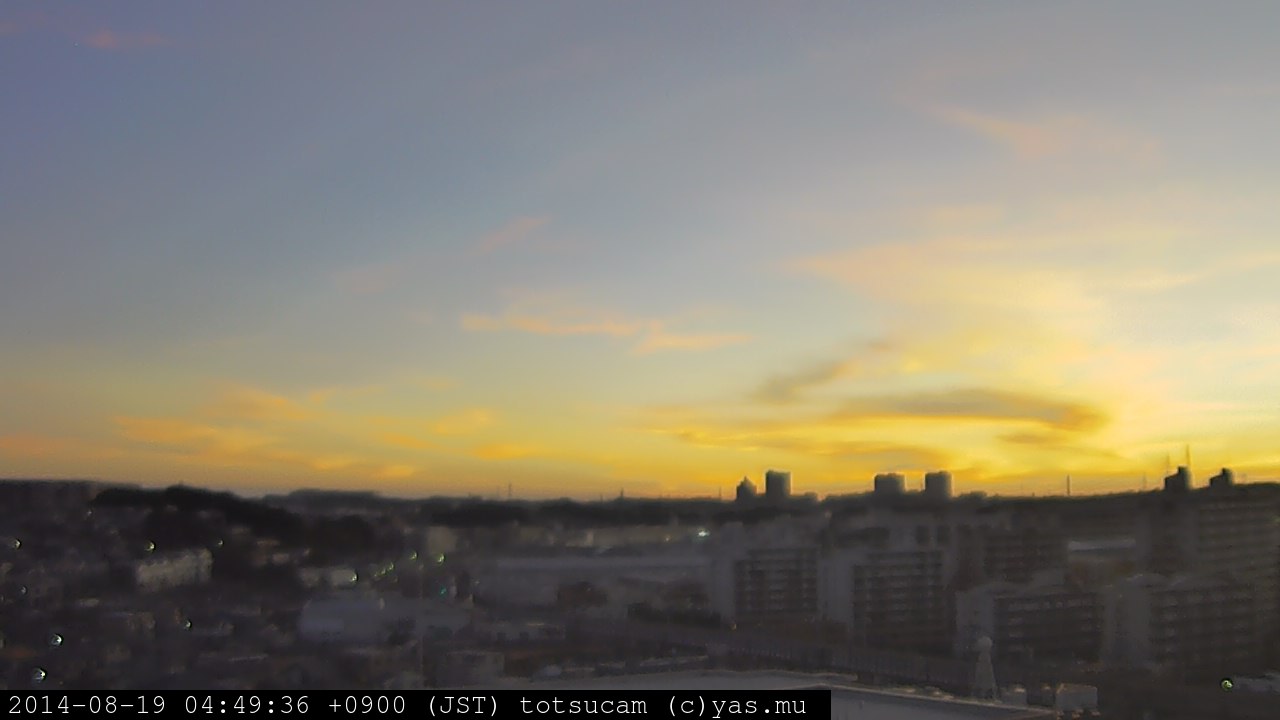 横浜市戸塚駅周辺から 東戸塚方面(北北東)を望む展望カメラの映像です。 左は現在の映像です。 下に並んでいるのは、 7日間に亘る日の出どき、昼間、夕暮れどきの写真(サムネイル)です。 それぞれ、日の出15分前、南中時、日没20分後の写真となっています。 各写真の下にはmpeg形式の動画へのリンクがあります。 それぞれ、日の出、南中、日没の前後1時間の画像です。 右欄にはその日24時間の動画へのリンクがあります。 この7日間以外は日付が一覧表示されています。 日付部分をクリックすると、 その日付から7日分が展開されて表示されます。