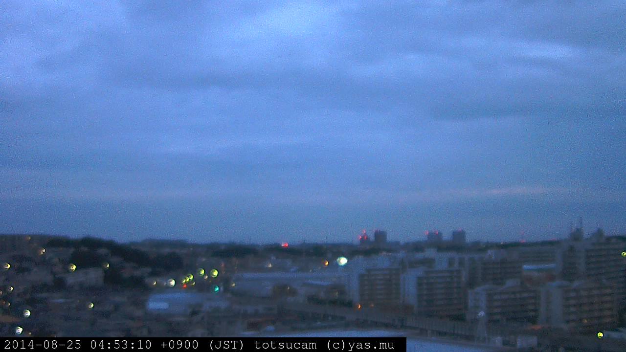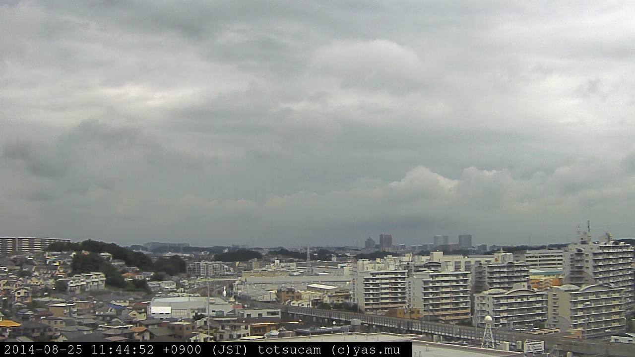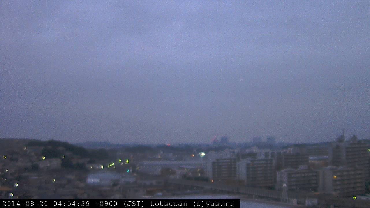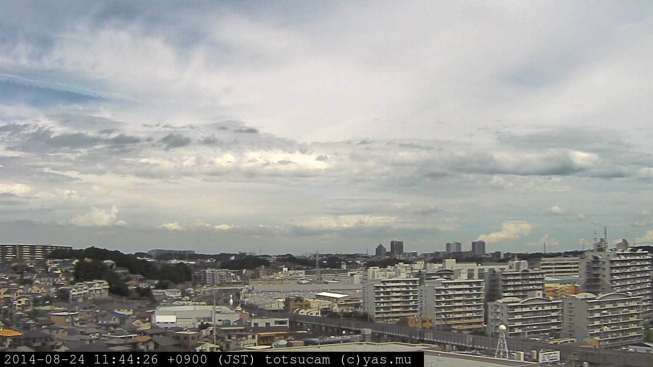 横浜市戸塚駅周辺から 東戸塚方面(北北東)を望む展望カメラの映像です。 左は現在の映像です。 下に並んでいるのは、 7日間に亘る日の出どき、昼間、夕暮れどきの写真(サムネイル)です。 それぞれ、日の出15分前、南中時、日没20分後の写真となっています。 各写真の下にはmpeg形式の動画へのリンクがあります。 それぞれ、日の出、南中、日没の前後1時間の画像です。 右欄にはその日24時間の動画へのリンクがあります。 この7日間以外は日付が一覧表示されています。 日付部分をクリックすると、 その日付から7日分が展開されて表示されます。
