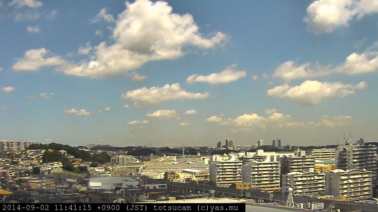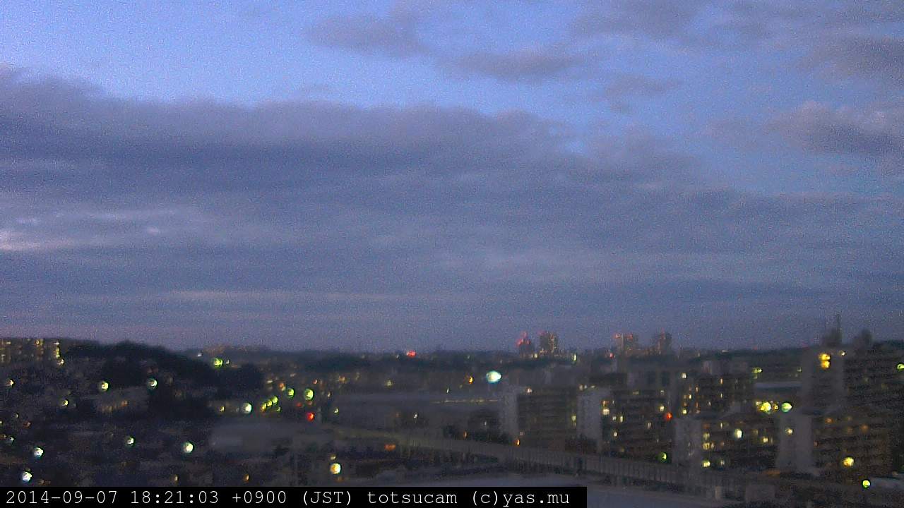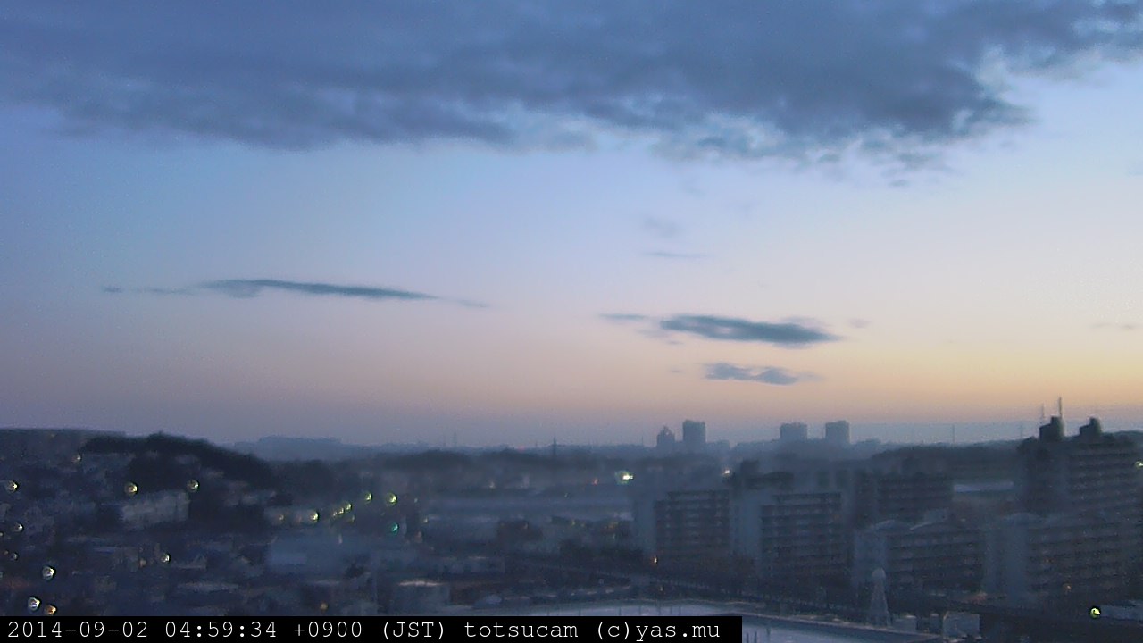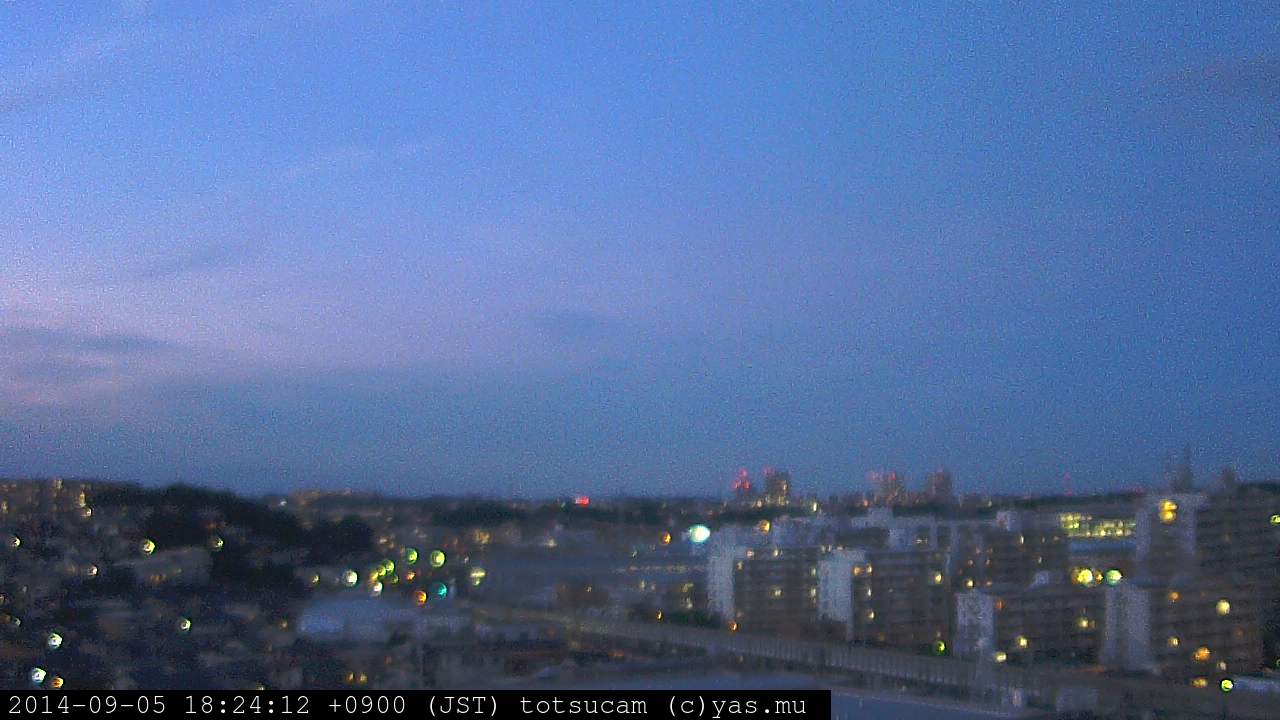 横浜市戸塚駅周辺から 東戸塚方面(北北東)を望む展望カメラの映像です。 左は現在の映像です。 下に並んでいるのは、 7日間に亘る日の出どき、昼間、夕暮れどきの写真(サムネイル)です。 それぞれ、日の出15分前、南中時、日没20分後の写真となっています。 各写真の下にはmpeg形式の動画へのリンクがあります。 それぞれ、日の出、南中、日没の前後1時間の画像です。 右欄にはその日24時間の動画へのリンクがあります。 この7日間以外は日付が一覧表示されています。 日付部分をクリックすると、 その日付から7日分が展開されて表示されます。