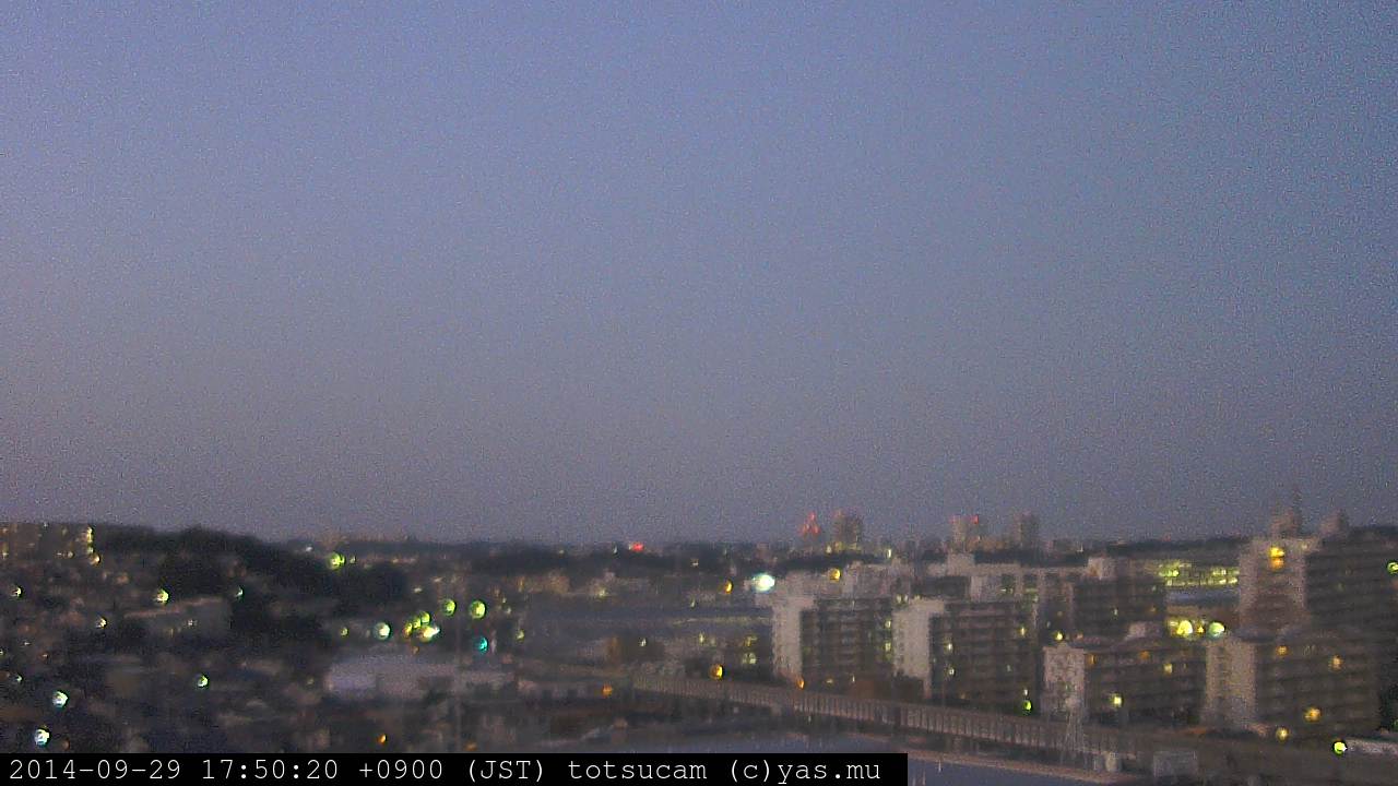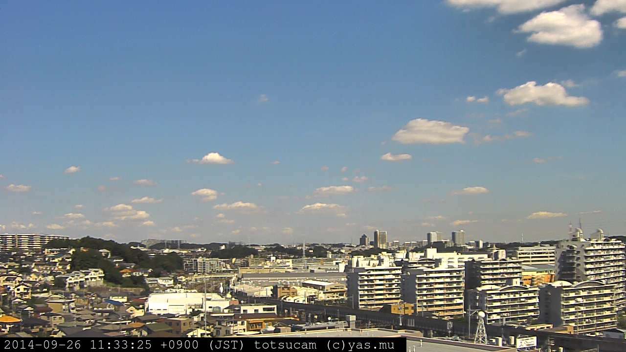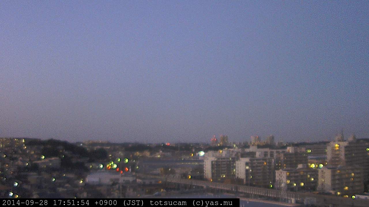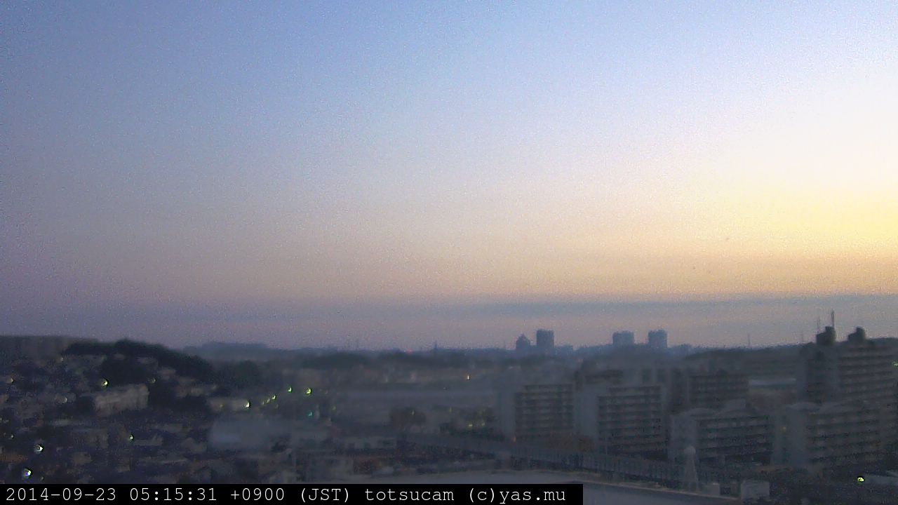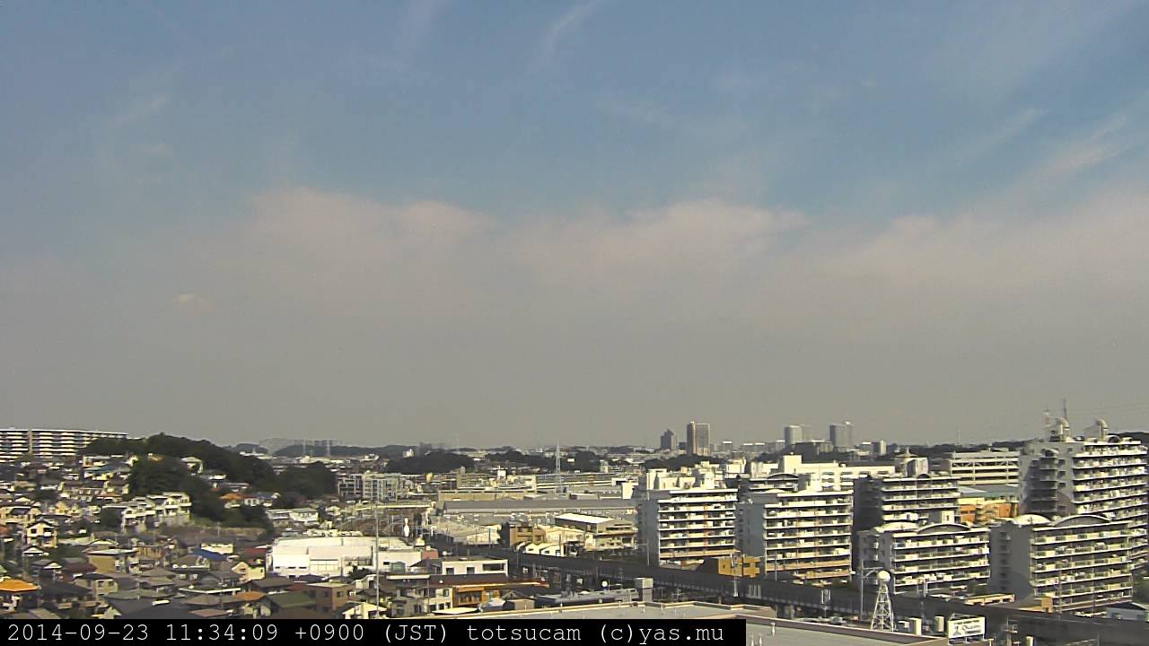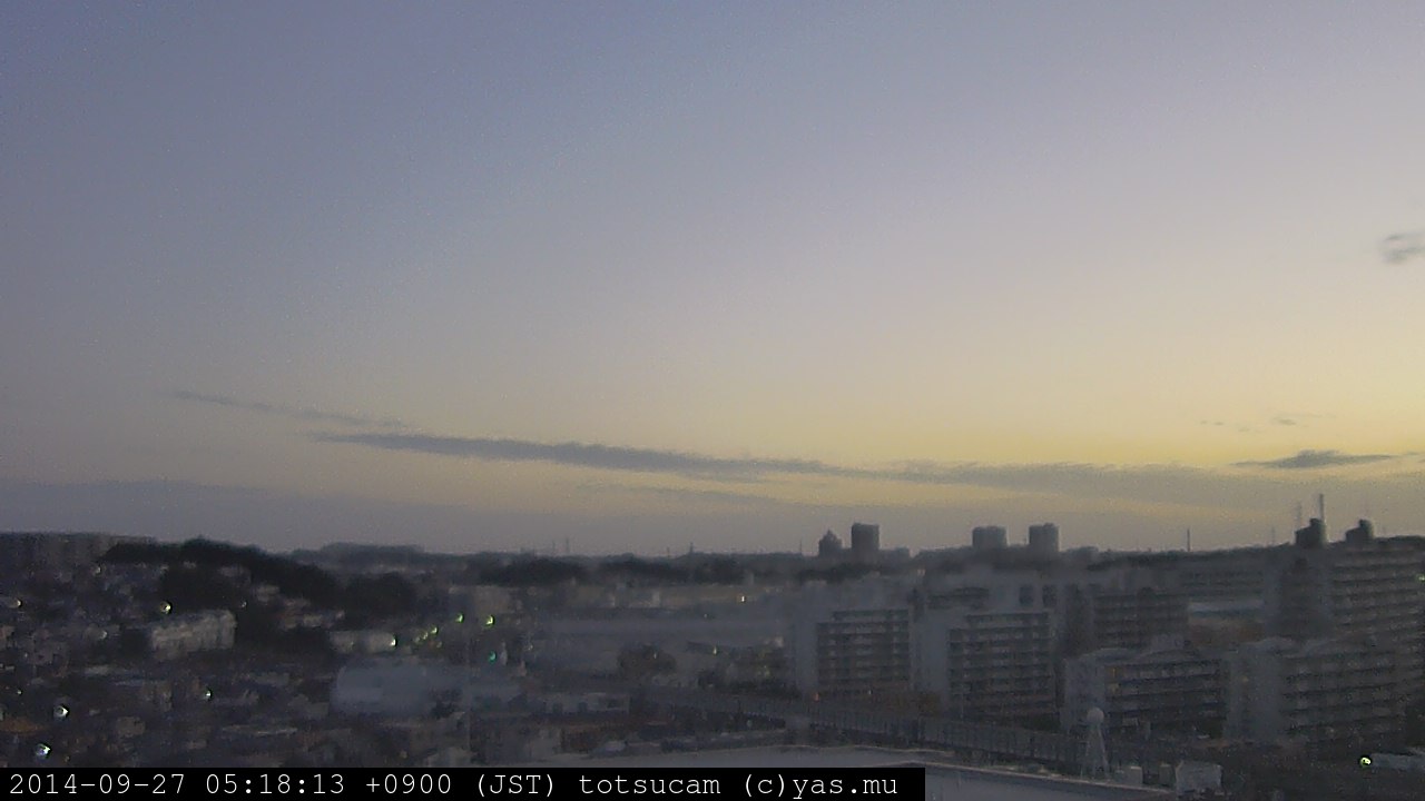 横浜市戸塚駅周辺から 東戸塚方面(北北東)を望む展望カメラの映像です。 左は現在の映像です。 下に並んでいるのは、 7日間に亘る日の出どき、昼間、夕暮れどきの写真(サムネイル)です。 それぞれ、日の出15分前、南中時、日没20分後の写真となっています。 各写真の下にはmpeg形式の動画へのリンクがあります。 それぞれ、日の出、南中、日没の前後1時間の画像です。 右欄にはその日24時間の動画へのリンクがあります。 この7日間以外は日付が一覧表示されています。 日付部分をクリックすると、 その日付から7日分が展開されて表示されます。