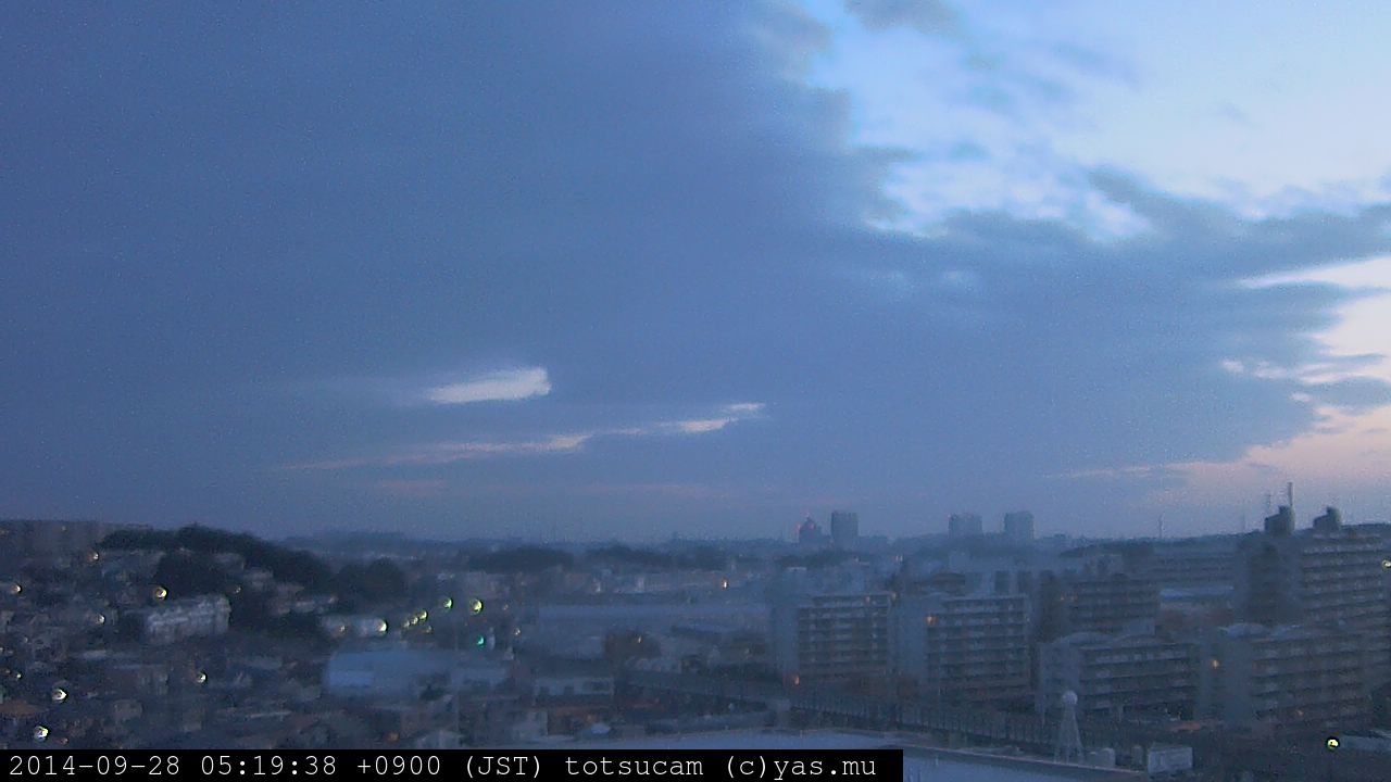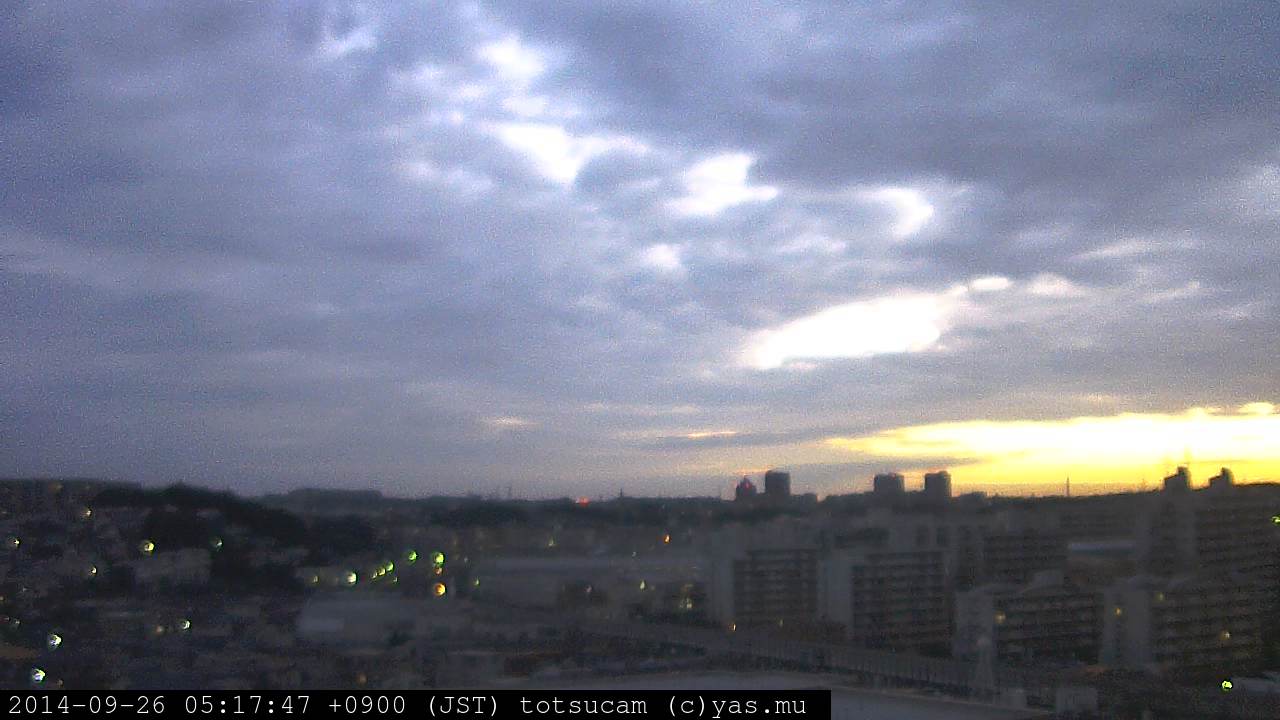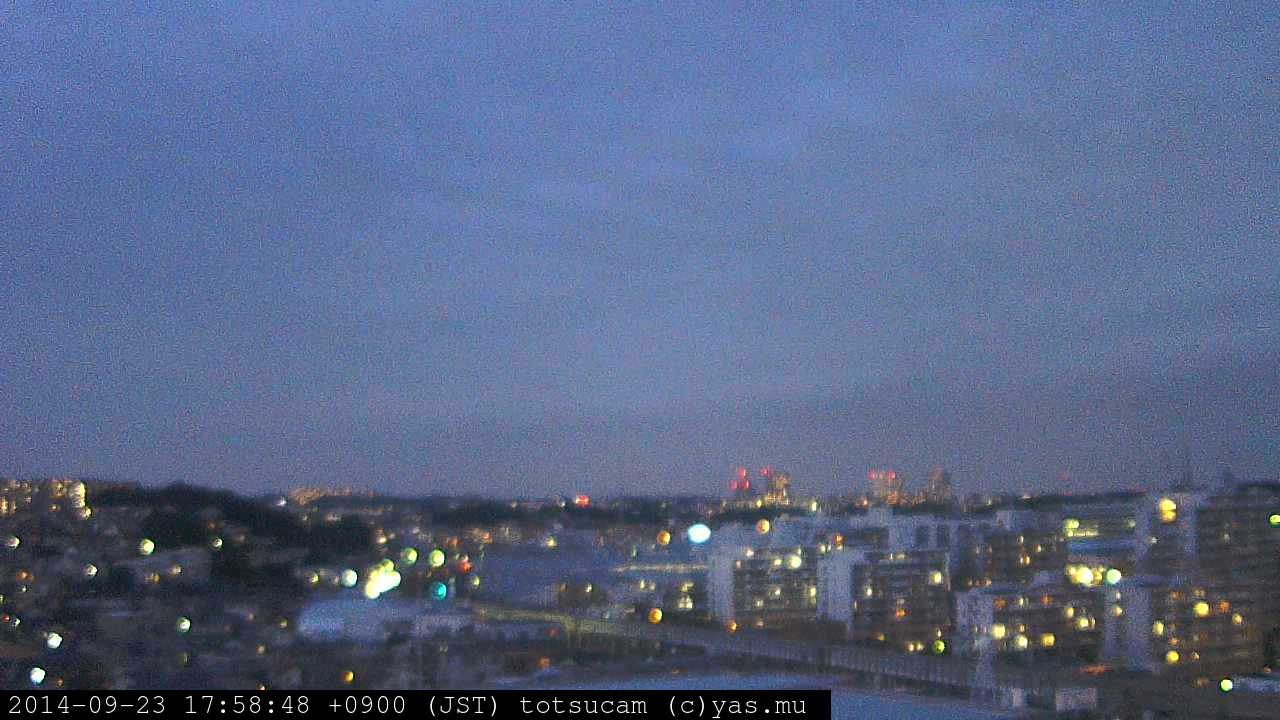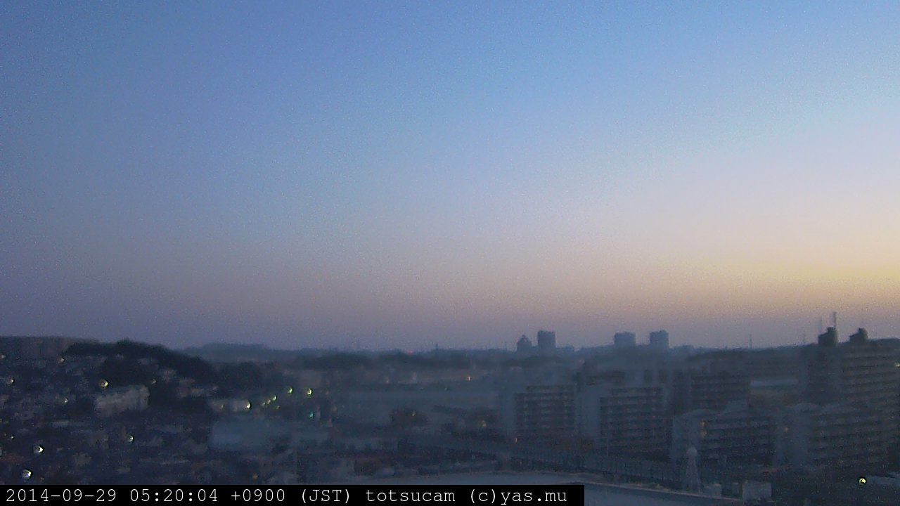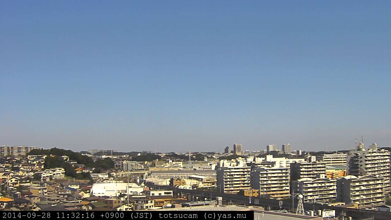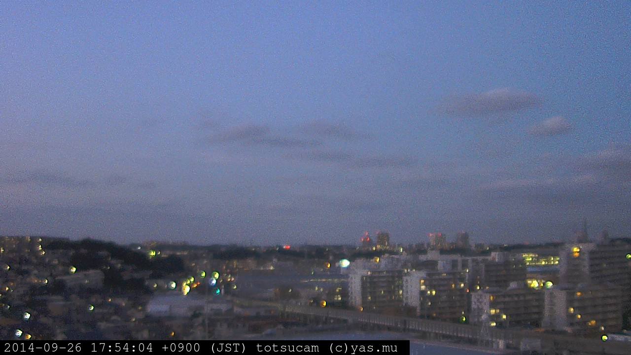 横浜市戸塚駅周辺から 東戸塚方面(北北東)を望む展望カメラの映像です。 左は現在の映像です。 下に並んでいるのは、 7日間に亘る日の出どき、昼間、夕暮れどきの写真(サムネイル)です。 それぞれ、日の出15分前、南中時、日没20分後の写真となっています。 各写真の下にはmpeg形式の動画へのリンクがあります。 それぞれ、日の出、南中、日没の前後1時間の画像です。 右欄にはその日24時間の動画へのリンクがあります。 この7日間以外は日付が一覧表示されています。 日付部分をクリックすると、 その日付から7日分が展開されて表示されます。