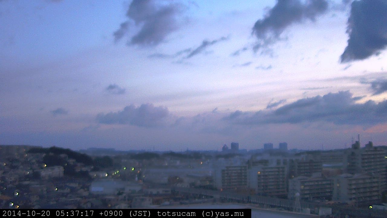 横浜市戸塚駅周辺から 東戸塚方面(北北東)を望む展望カメラの映像です。 左は現在の映像です。 下に並んでいるのは、 7日間に亘る日の出どき、昼間、夕暮れどきの写真(サムネイル)です。 それぞれ、日の出15分前、南中時、日没20分後の写真となっています。 各写真の下にはmpeg形式の動画へのリンクがあります。 それぞれ、日の出、南中、日没の前後1時間の画像です。 右欄にはその日24時間の動画へのリンクがあります。 この7日間以外は日付が一覧表示されています。 日付部分をクリックすると、 その日付から7日分が展開されて表示されます。