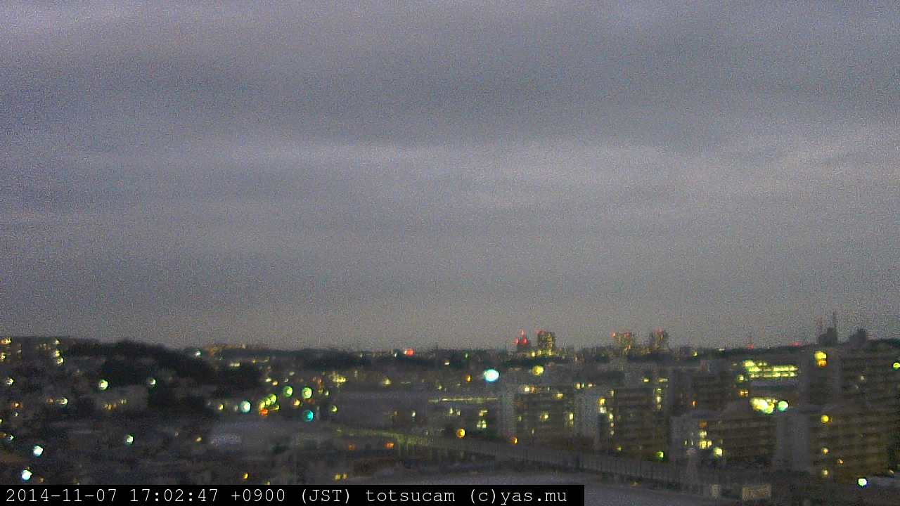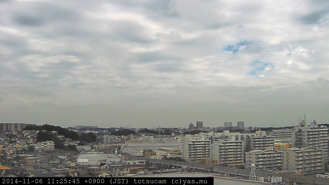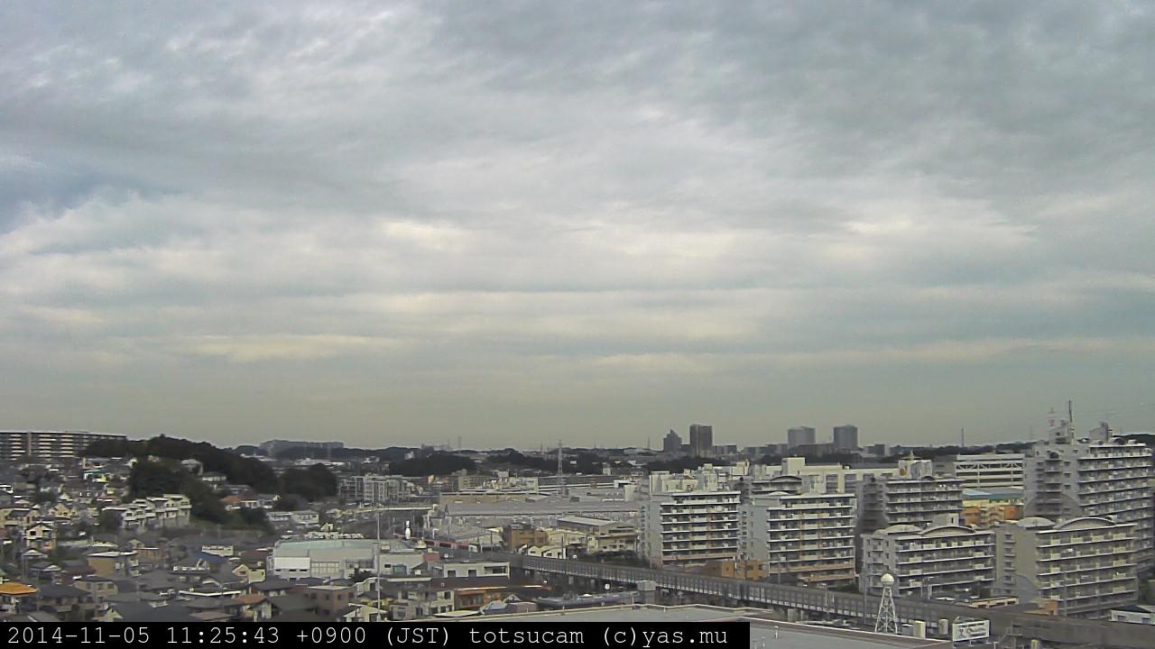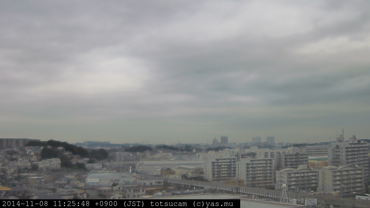 適度に曇った日の雲の動き (例: 2005-10-24) がとても楽しめます。 正面を横切っている高架は横須賀線下りです。 その下に横須賀線上り、東海道線、同貨物線が走っていますが、 高架に隠れていてよく見えません。 夜間は特に中央左寄りの車の動きがよく見えます。