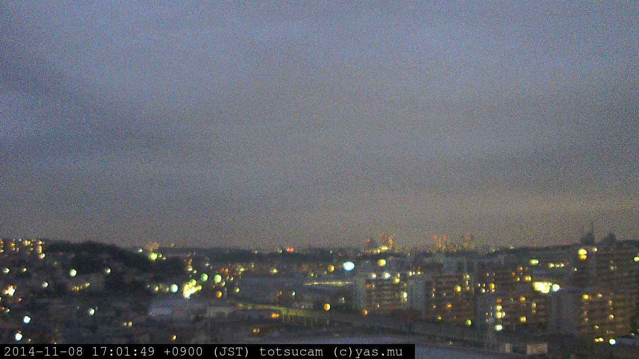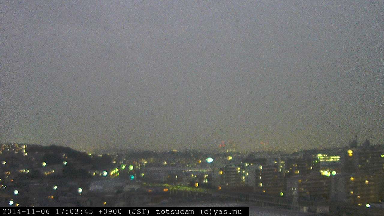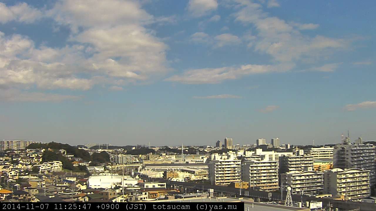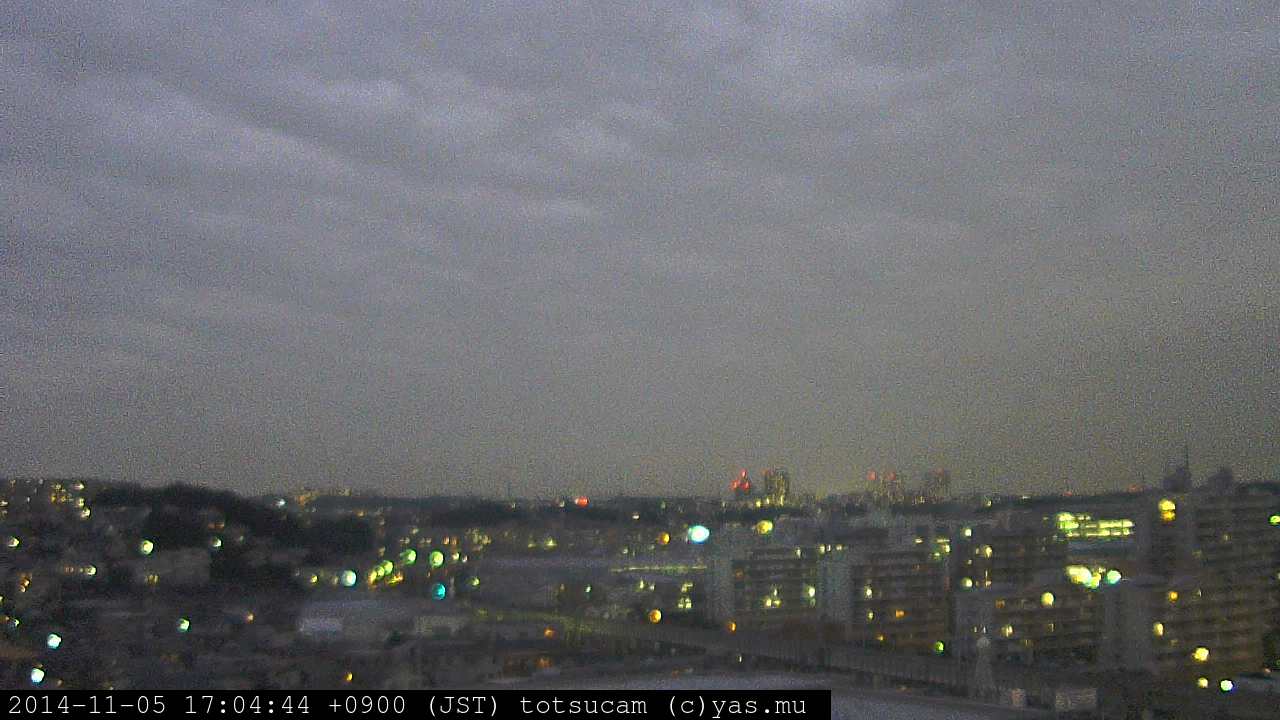 適度に曇った日の雲の動き (例: 2005-10-24) がとても楽しめます。 正面を横切っている高架は横須賀線下りです。 その下に横須賀線上り、東海道線、同貨物線が走っていますが、 高架に隠れていてよく見えません。 夜間は特に中央左寄りの車の動きがよく見えます。