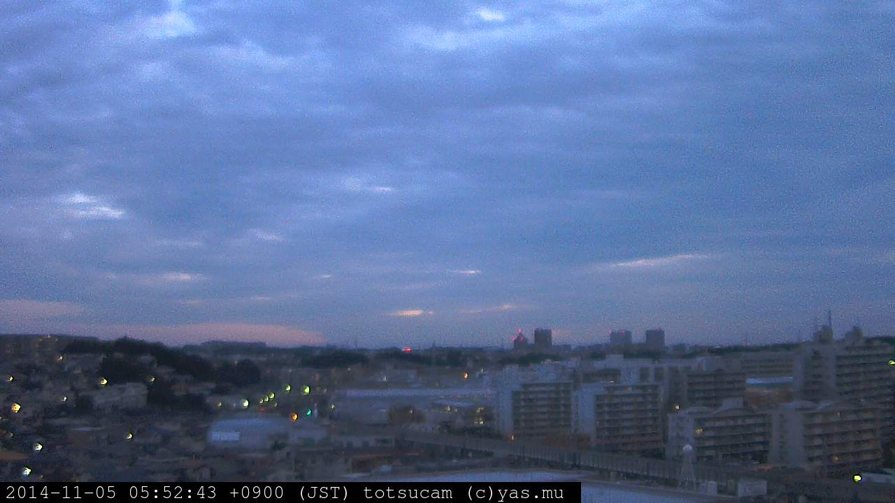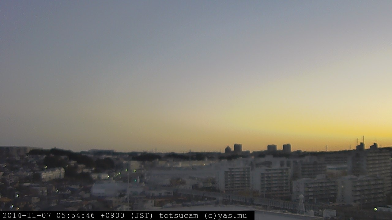 横浜市戸塚駅周辺から 東戸塚方面(北北東)を望む展望カメラの映像です。 左は現在の映像です。 下に並んでいるのは、 7日間に亘る日の出どき、昼間、夕暮れどきの写真(サムネイル)です。 それぞれ、日の出15分前、南中時、日没20分後の写真となっています。 各写真の下にはmpeg形式の動画へのリンクがあります。 それぞれ、日の出、南中、日没の前後1時間の画像です。 右欄にはその日24時間の動画へのリンクがあります。 この7日間以外は日付が一覧表示されています。 日付部分をクリックすると、 その日付から7日分が展開されて表示されます。