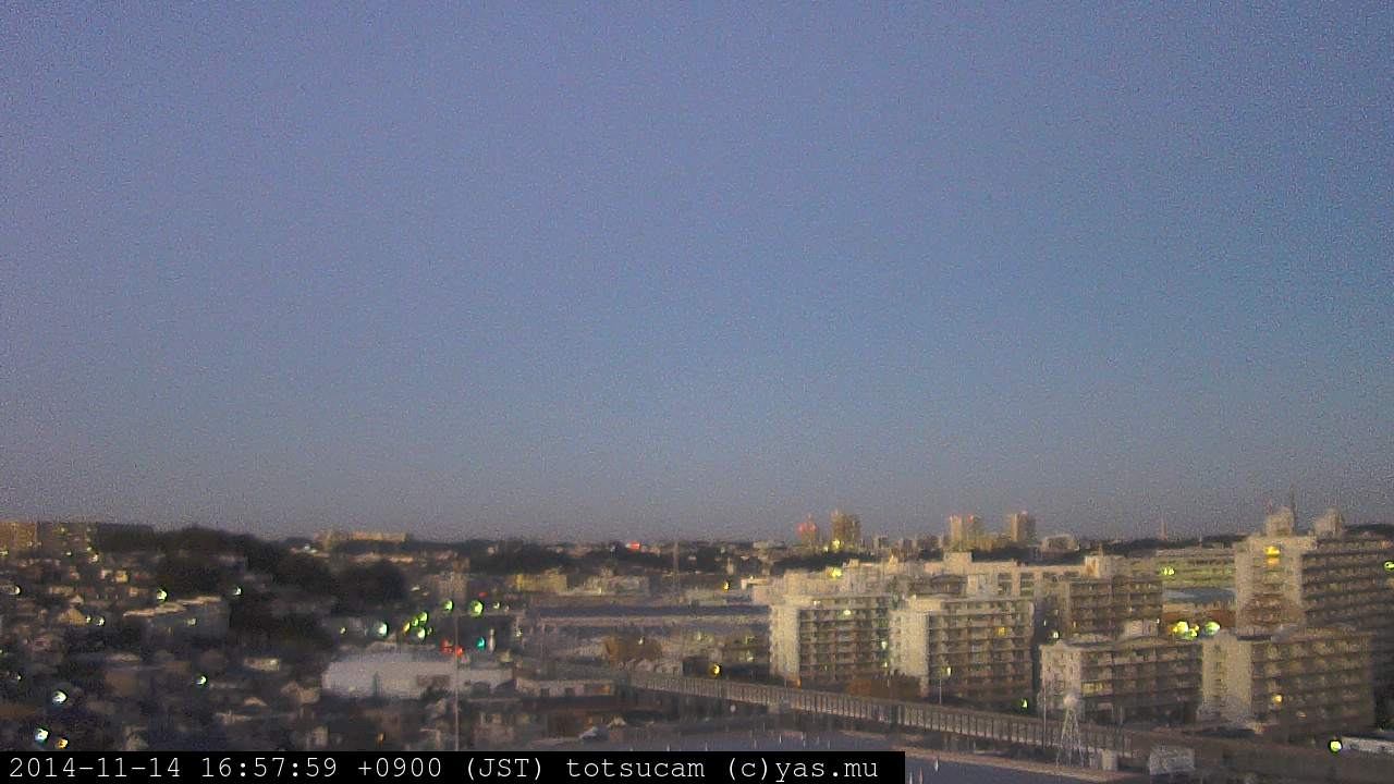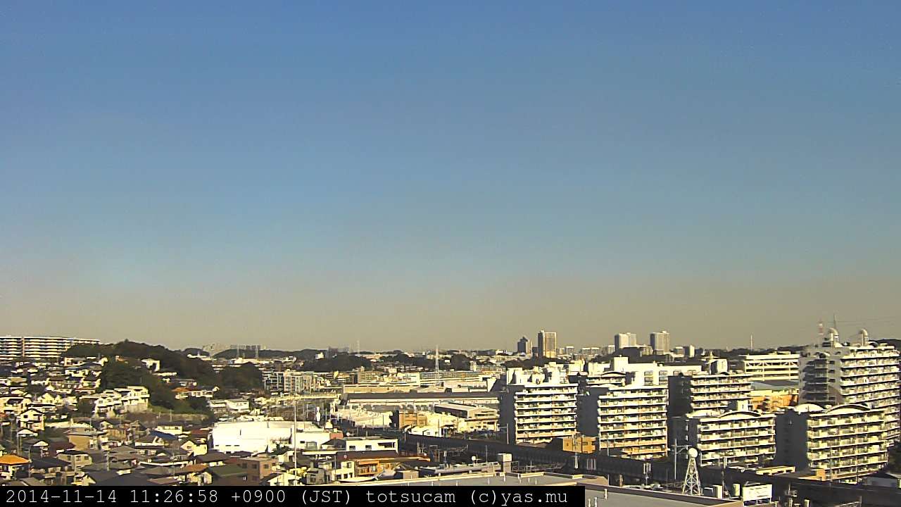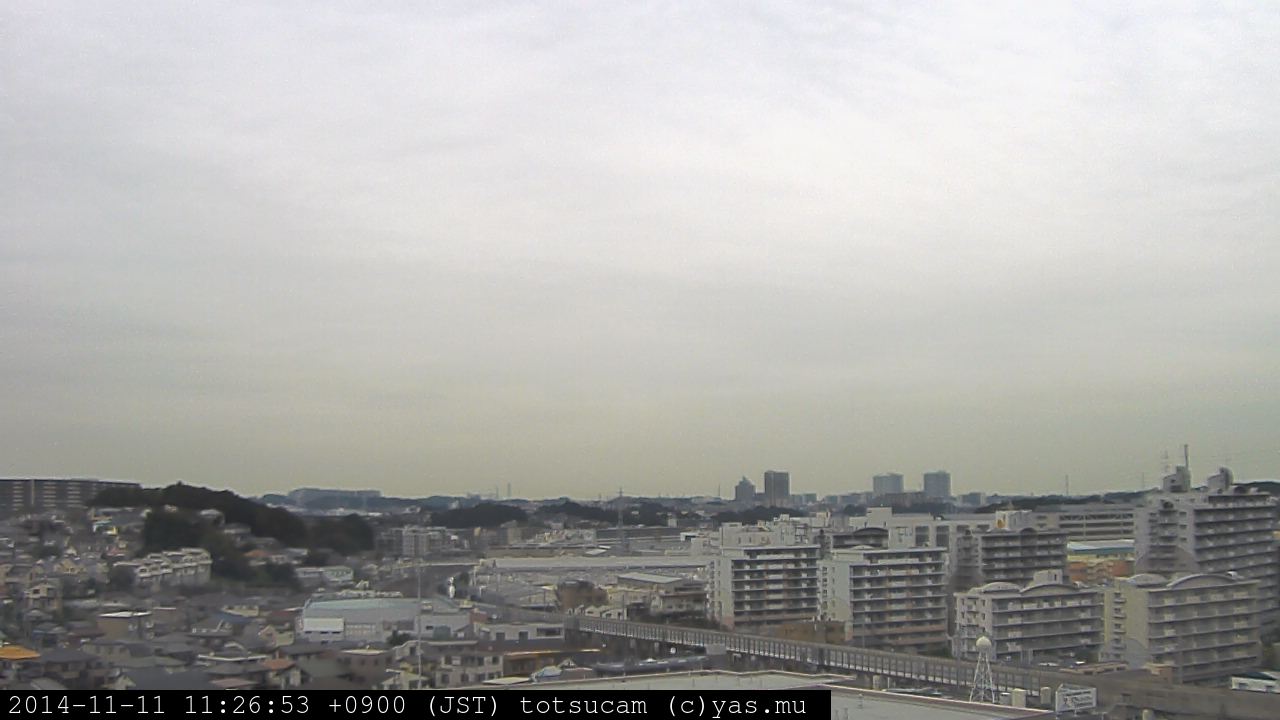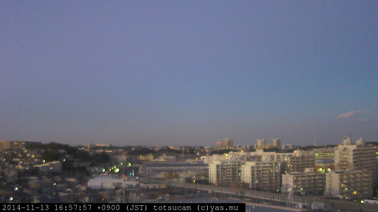 適度に曇った日の雲の動き (例: 2005-10-24) がとても楽しめます。 正面を横切っている高架は横須賀線下りです。 その下に横須賀線上り、東海道線、同貨物線が走っていますが、 高架に隠れていてよく見えません。 夜間は特に中央左寄りの車の動きがよく見えます。