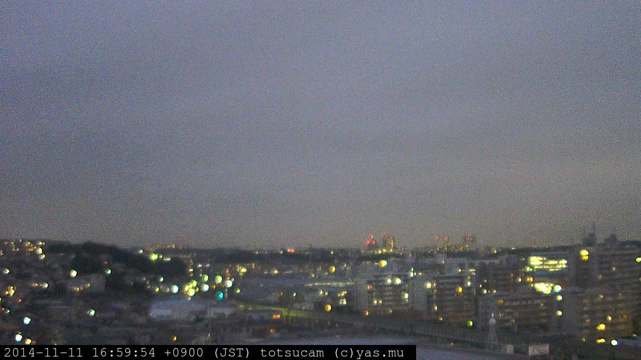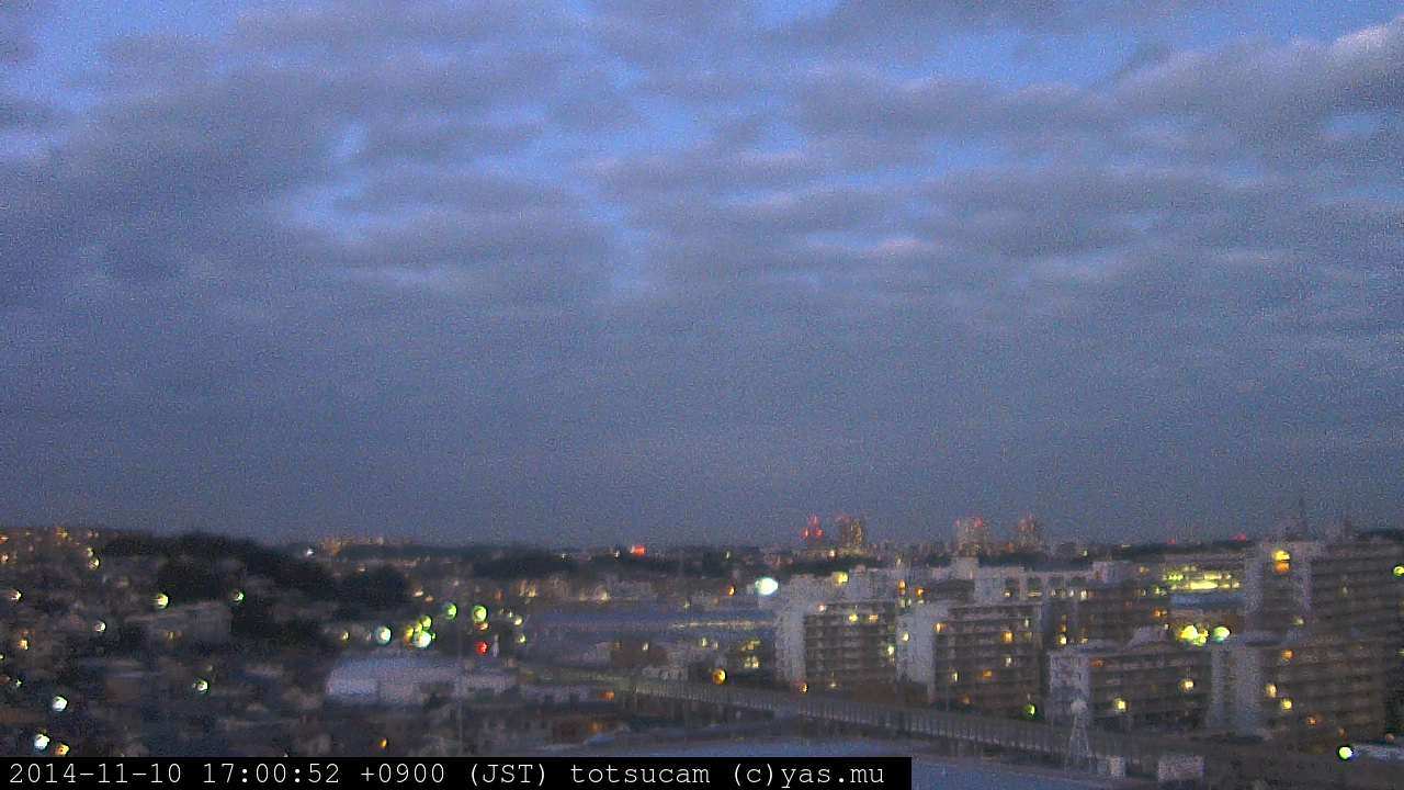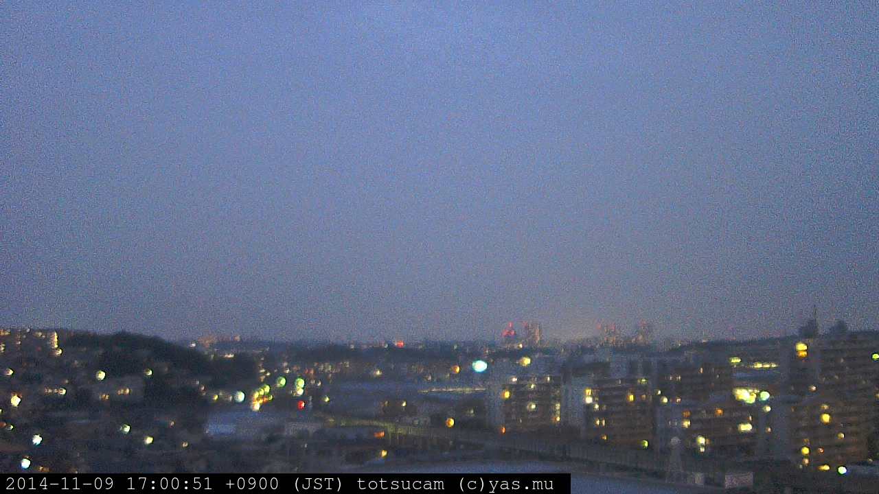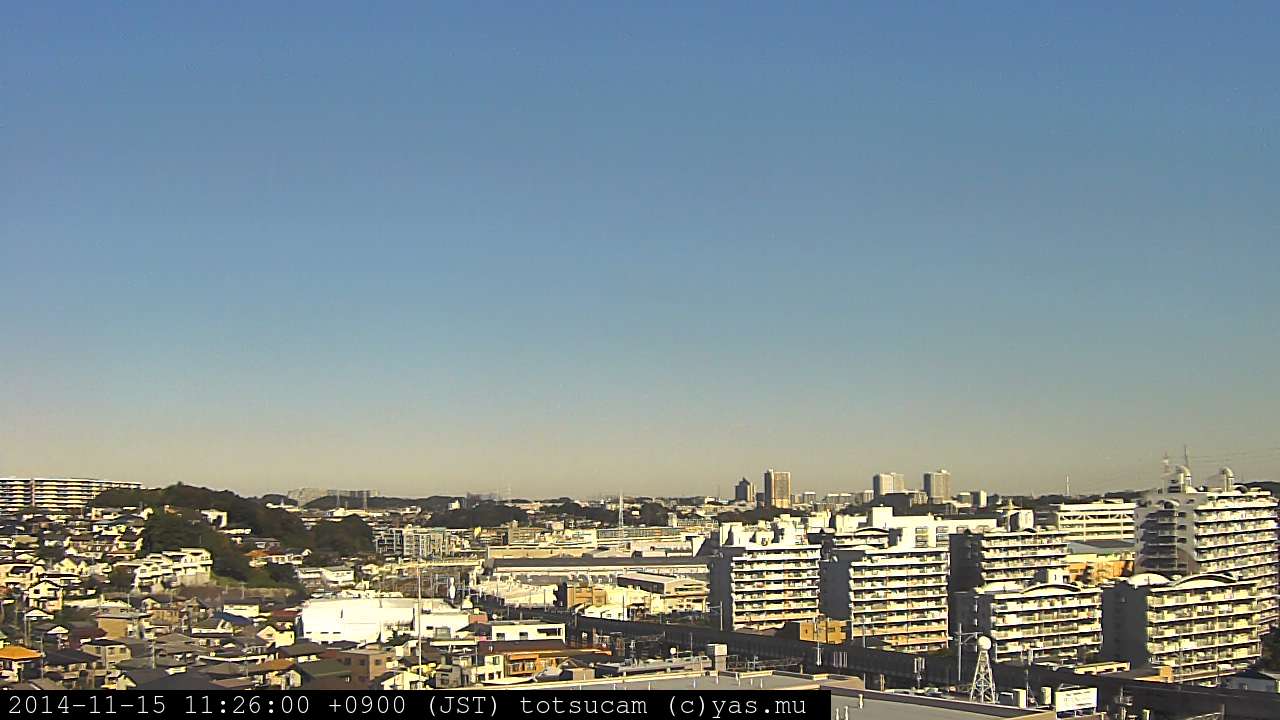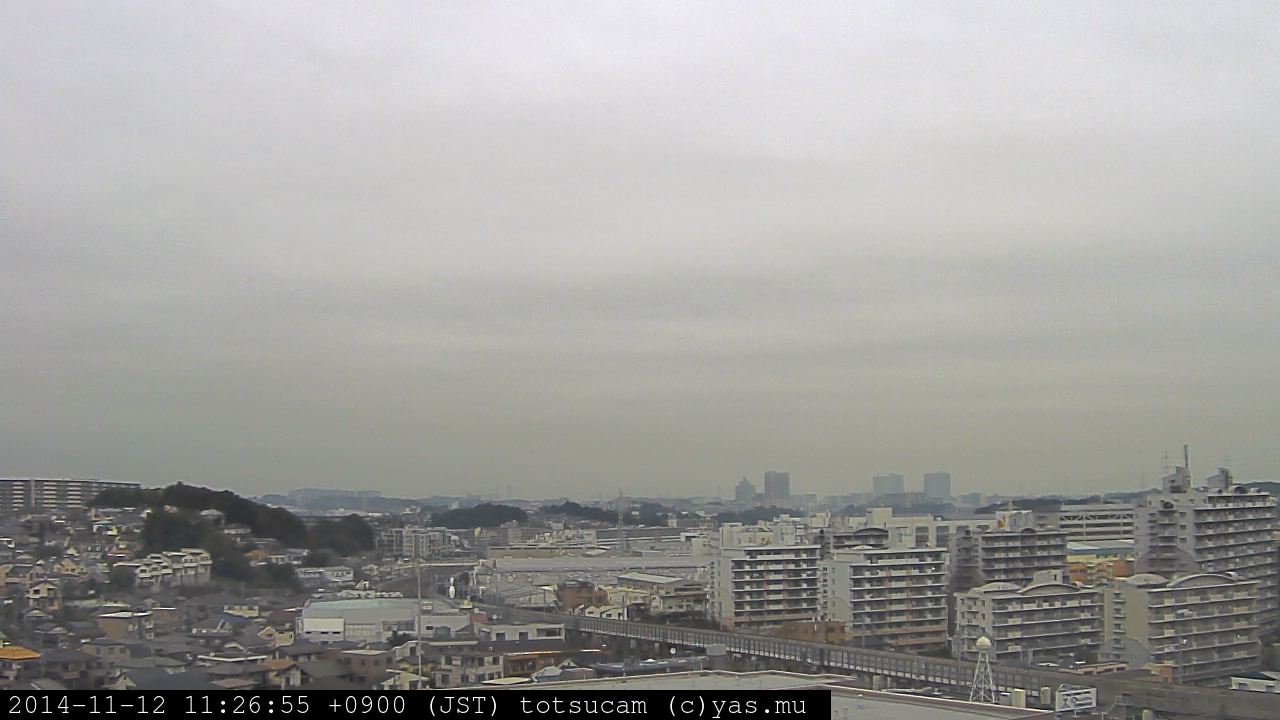適度に曇った日の雲の動き (例: 2005-10-24) がとても楽しめます。 正面を横切っている高架は横須賀線下りです。 その下に横須賀線上り、東海道線、同貨物線が走っていますが、 高架に隠れていてよく見えません。 夜間は特に中央左寄りの車の動きがよく見えます。