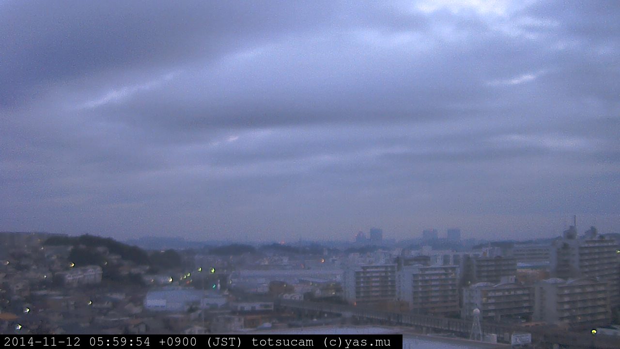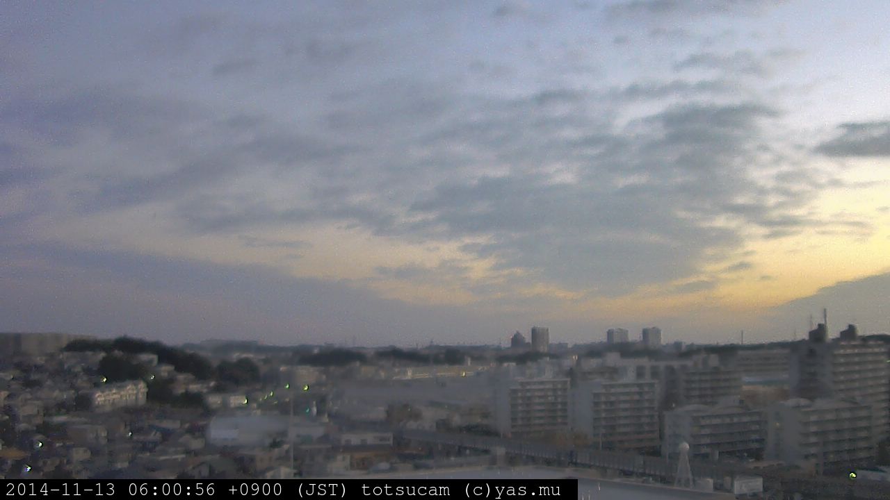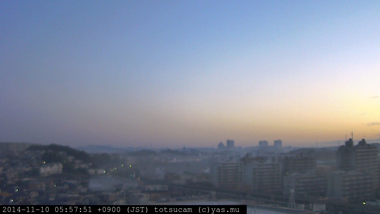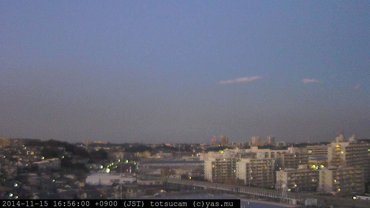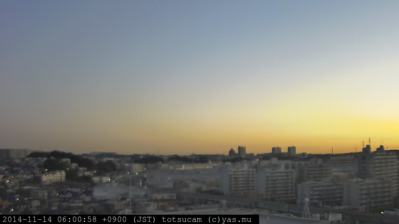 横浜市戸塚駅周辺から 東戸塚方面(北北東)を望む展望カメラの映像です。 左は現在の映像です。 下に並んでいるのは、 7日間に亘る日の出どき、昼間、夕暮れどきの写真(サムネイル)です。 それぞれ、日の出15分前、南中時、日没20分後の写真となっています。 各写真の下にはmpeg形式の動画へのリンクがあります。 それぞれ、日の出、南中、日没の前後1時間の画像です。 右欄にはその日24時間の動画へのリンクがあります。 この7日間以外は日付が一覧表示されています。 日付部分をクリックすると、 その日付から7日分が展開されて表示されます。