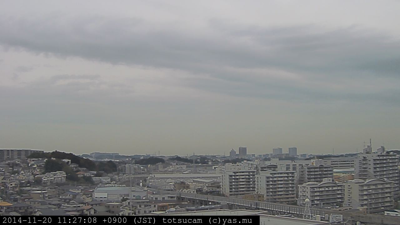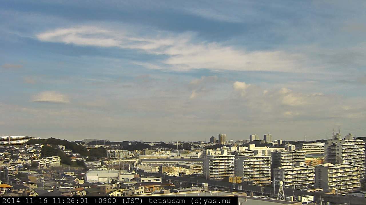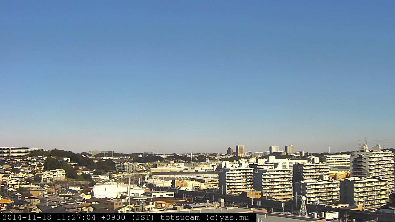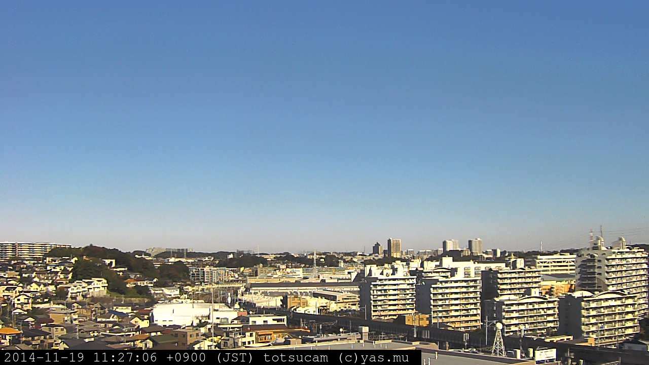 適度に曇った日の雲の動き (例: 2005-10-24) がとても楽しめます。 正面を横切っている高架は横須賀線下りです。 その下に横須賀線上り、東海道線、同貨物線が走っていますが、 高架に隠れていてよく見えません。 夜間は特に中央左寄りの車の動きがよく見えます。