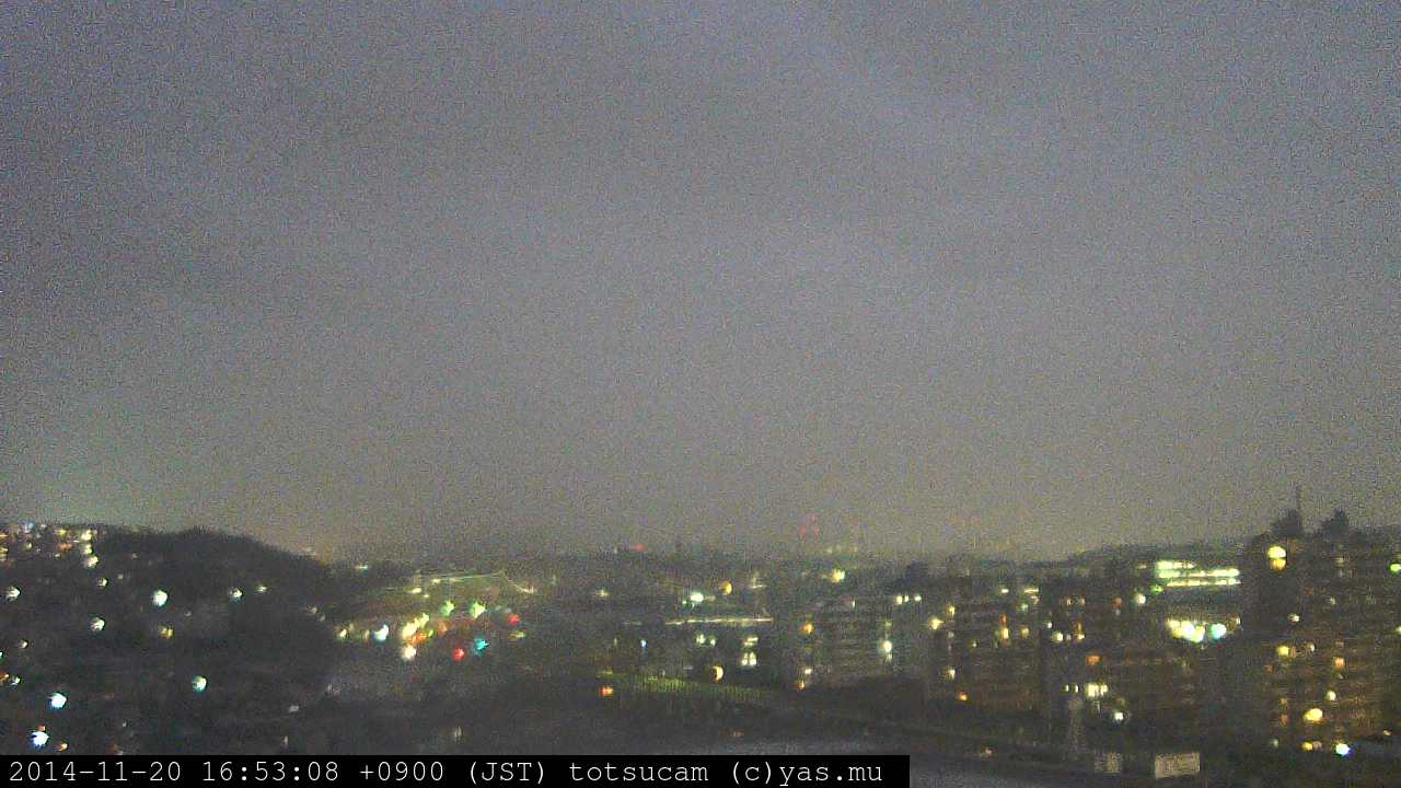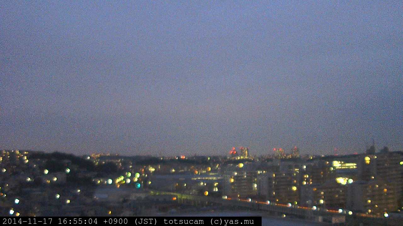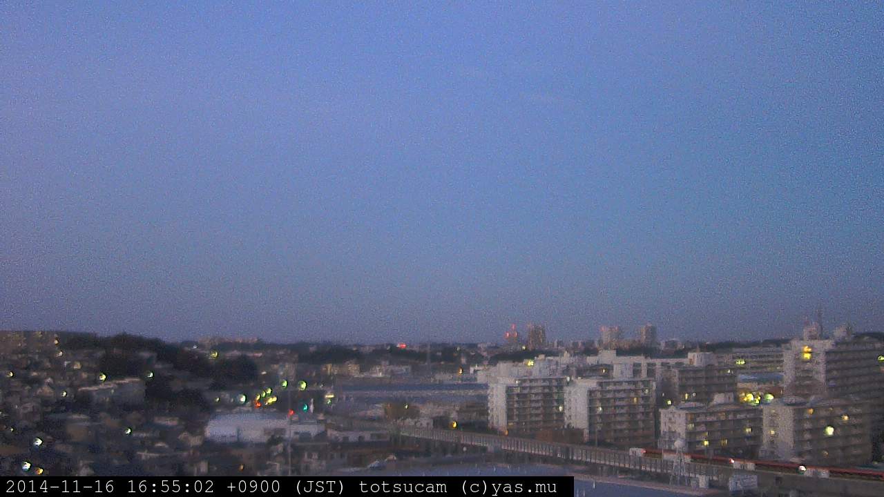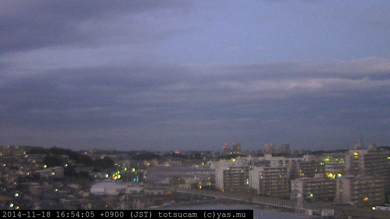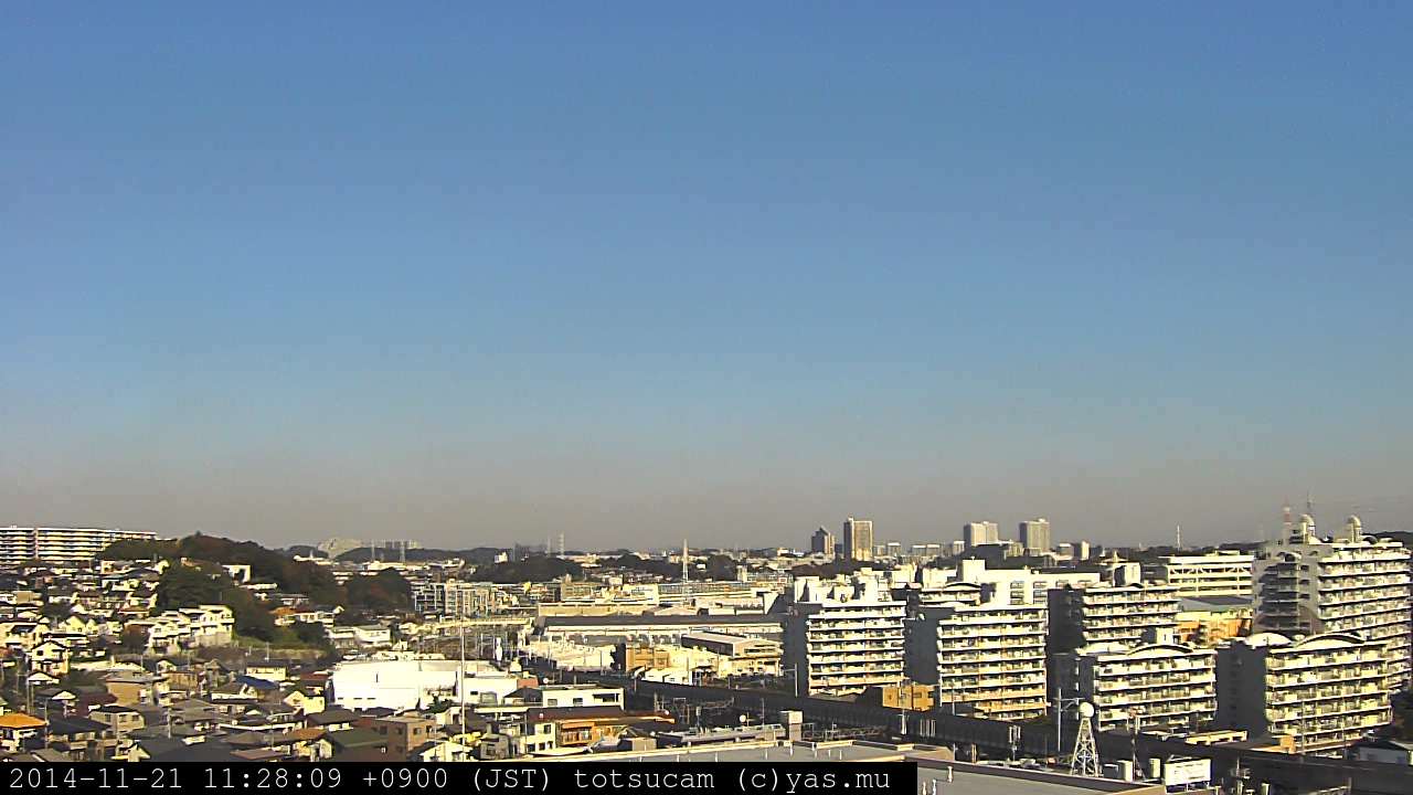 適度に曇った日の雲の動き (例: 2005-10-24) がとても楽しめます。 正面を横切っている高架は横須賀線下りです。 その下に横須賀線上り、東海道線、同貨物線が走っていますが、 高架に隠れていてよく見えません。 夜間は特に中央左寄りの車の動きがよく見えます。