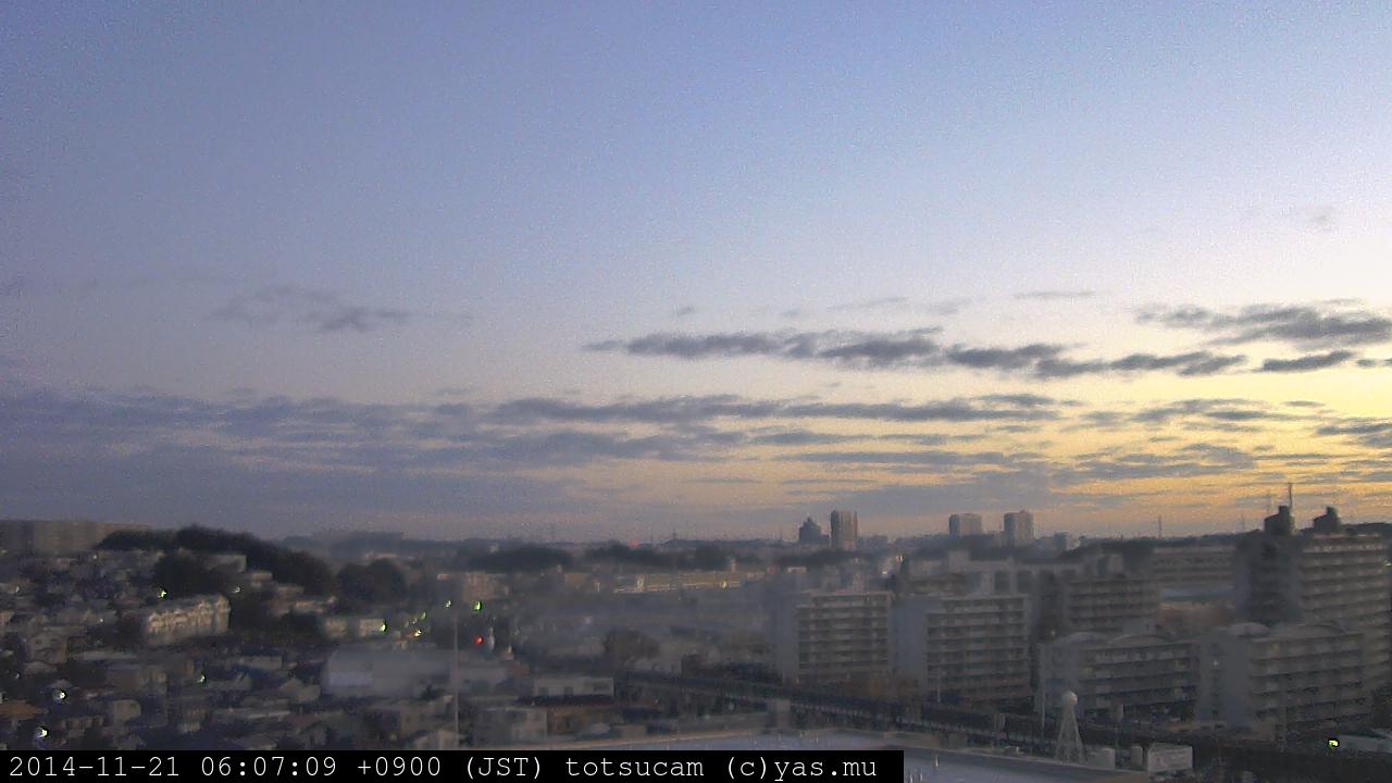 横浜市戸塚駅周辺から 東戸塚方面(北北東)を望む展望カメラの映像です。 左は現在の映像です。 下に並んでいるのは、 7日間に亘る日の出どき、昼間、夕暮れどきの写真(サムネイル)です。 それぞれ、日の出15分前、南中時、日没20分後の写真となっています。 各写真の下にはmpeg形式の動画へのリンクがあります。 それぞれ、日の出、南中、日没の前後1時間の画像です。 右欄にはその日24時間の動画へのリンクがあります。 この7日間以外は日付が一覧表示されています。 日付部分をクリックすると、 その日付から7日分が展開されて表示されます。