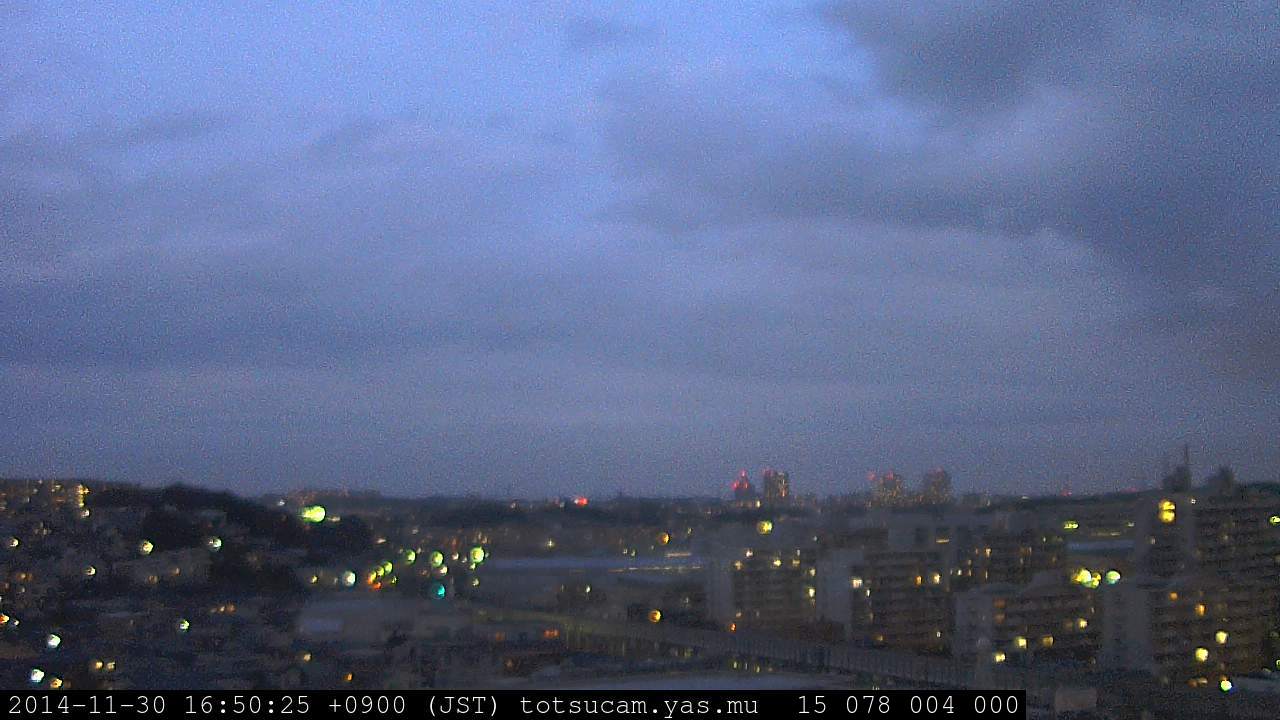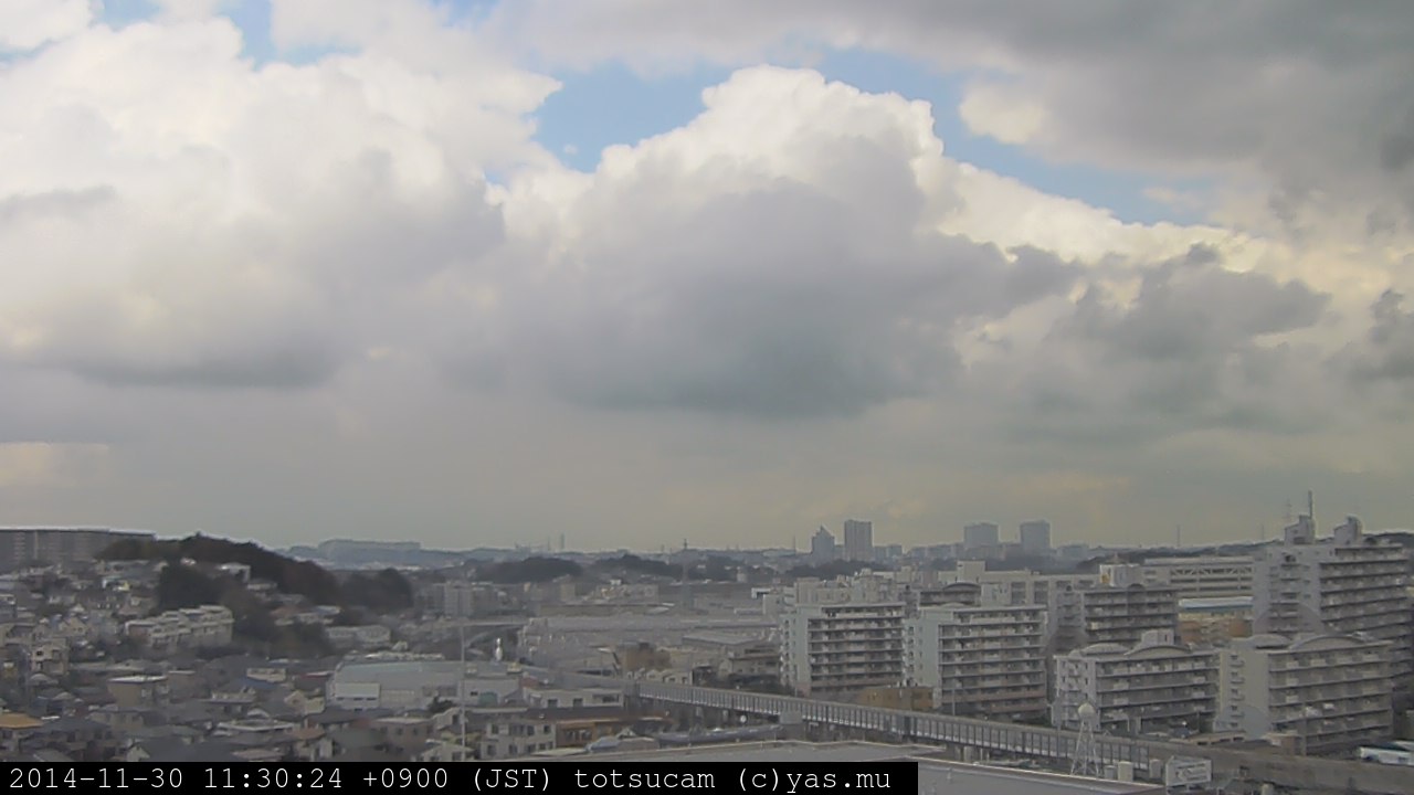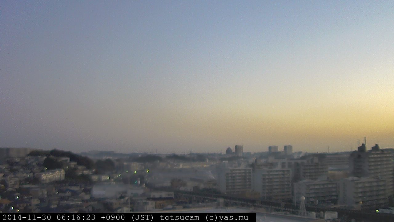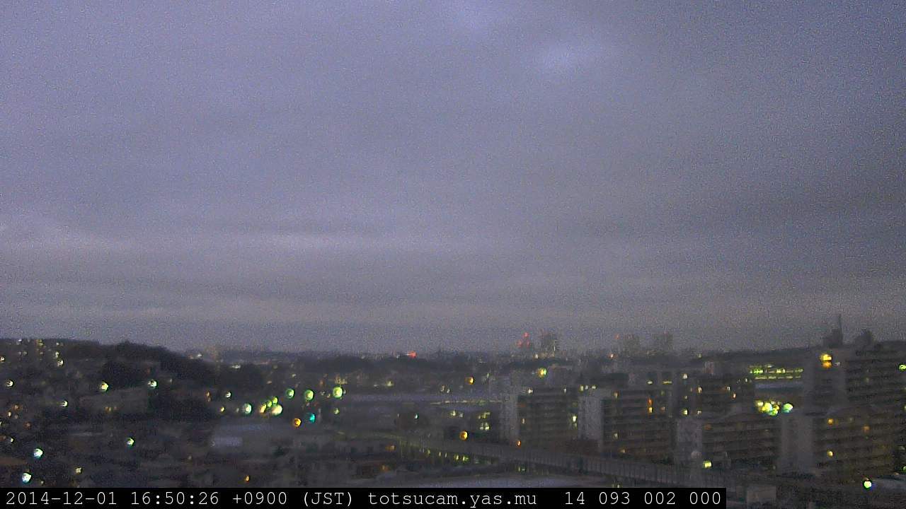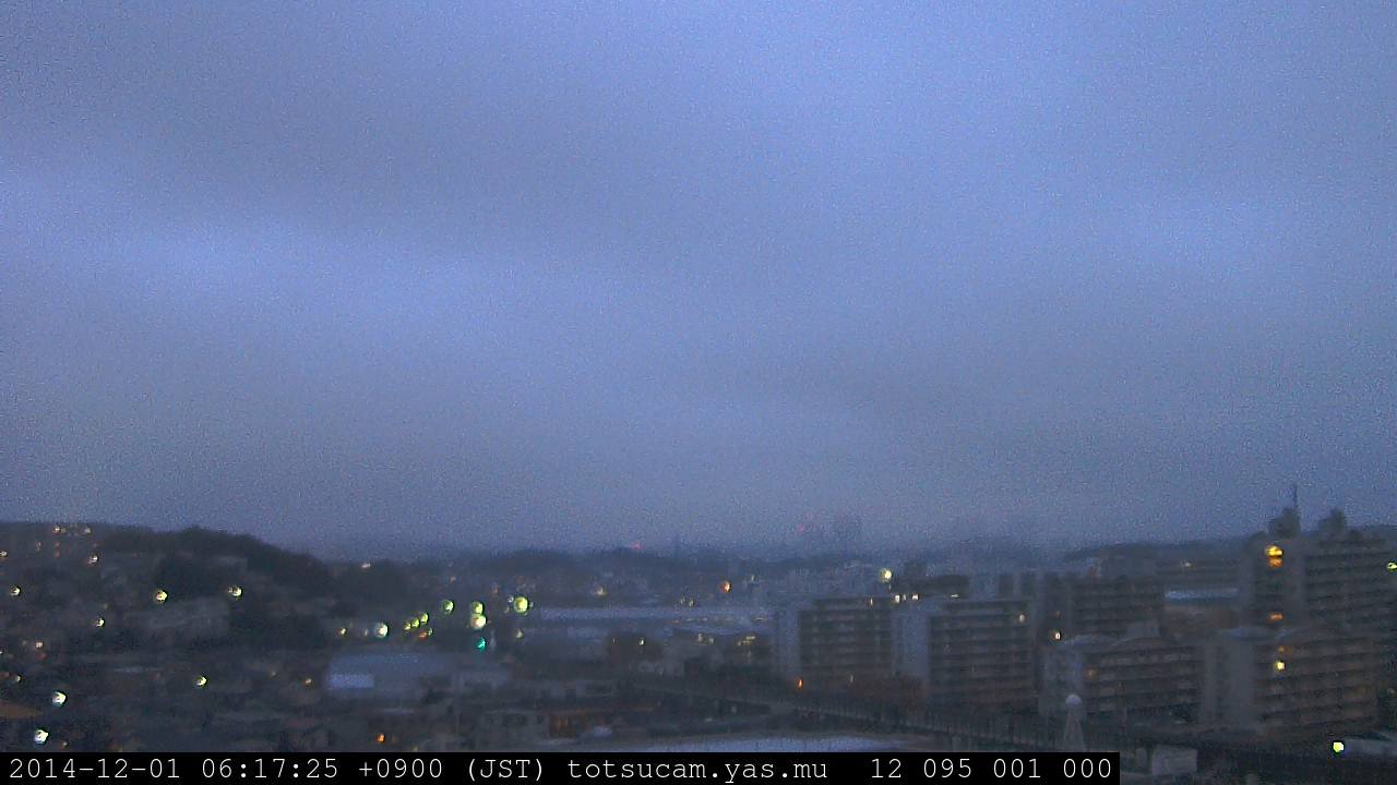横浜市戸塚駅周辺から 東戸塚方面(北北東)を望む展望カメラの映像です。 左は現在の映像です。 下に並んでいるのは、 7日間に亘る日の出どき、昼間、夕暮れどきの写真(サムネイル)です。 それぞれ、日の出15分前、南中時、日没20分後の写真となっています。 各写真の下にはmpeg形式の動画へのリンクがあります。 それぞれ、日の出、南中、日没の前後1時間の画像です。 右欄にはその日24時間の動画へのリンクがあります。 この7日間以外は日付が一覧表示されています。 日付部分をクリックすると、 その日付から7日分が展開されて表示されます。