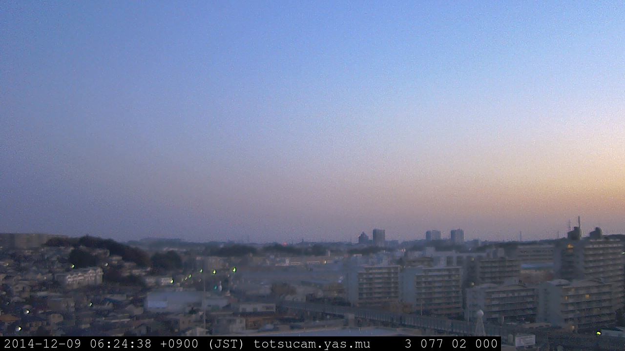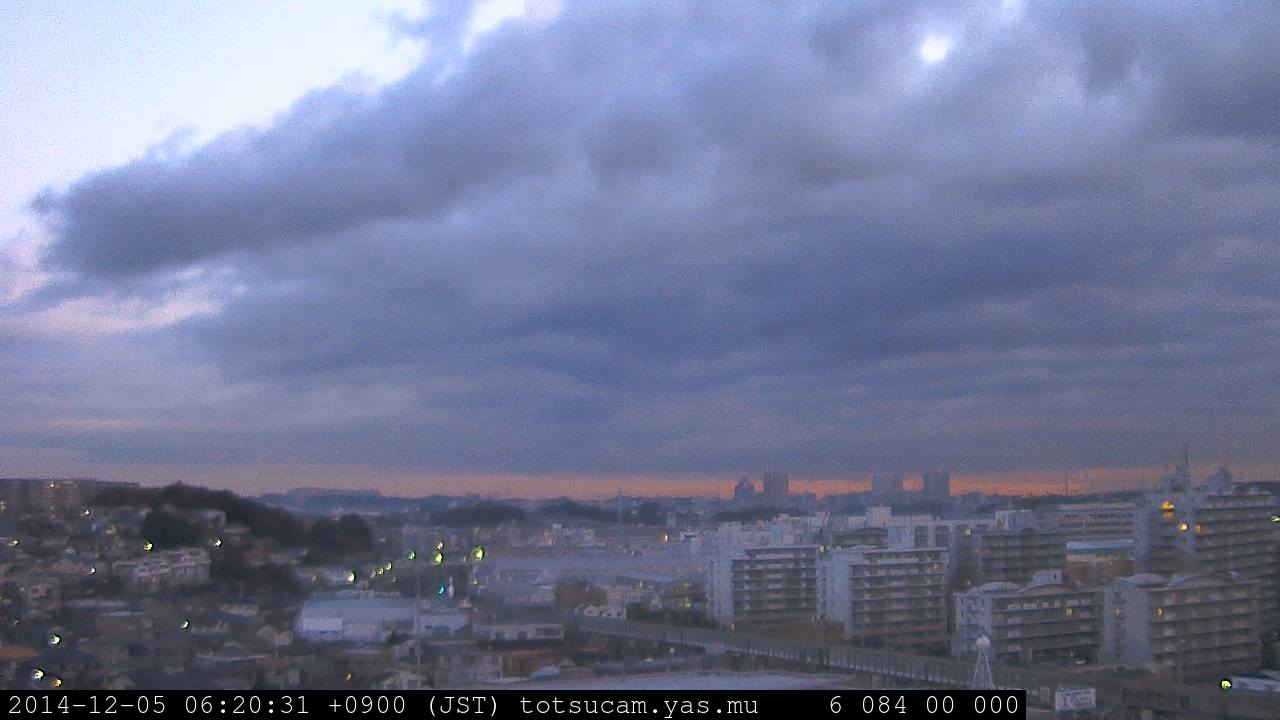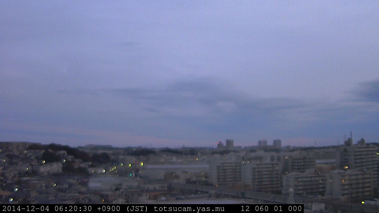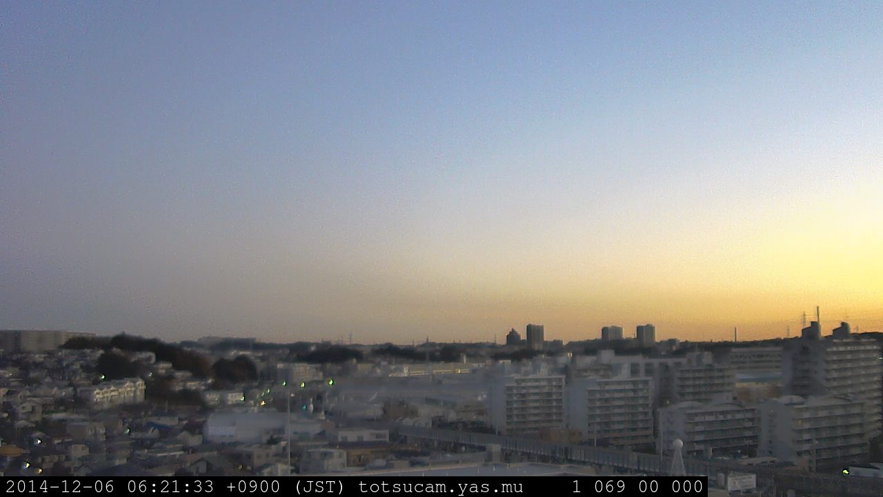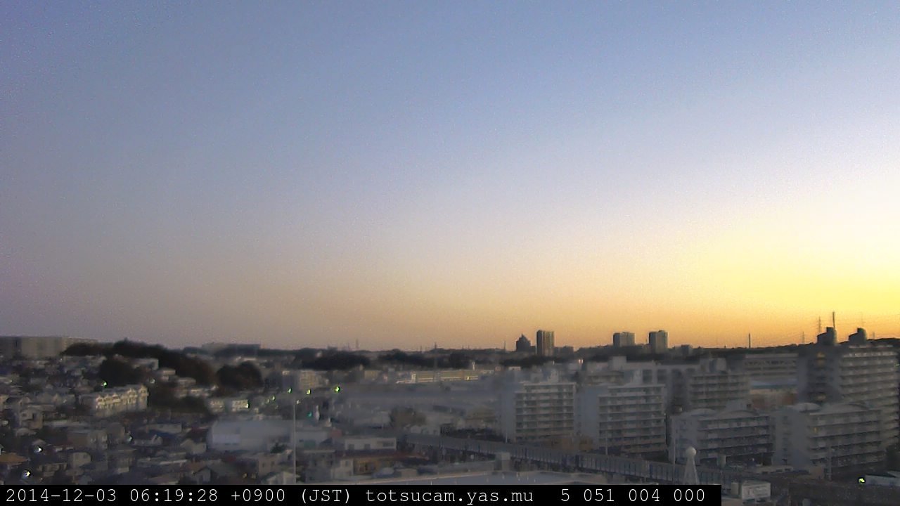 横浜市戸塚駅周辺から 東戸塚方面(北北東)を望む展望カメラの映像です。 左は現在の映像です。 下に並んでいるのは、 7日間に亘る日の出どき、昼間、夕暮れどきの写真(サムネイル)です。 それぞれ、日の出15分前、南中時、日没20分後の写真となっています。 各写真の下にはmpeg形式の動画へのリンクがあります。 それぞれ、日の出、南中、日没の前後1時間の画像です。 右欄にはその日24時間の動画へのリンクがあります。 この7日間以外は日付が一覧表示されています。 日付部分をクリックすると、 その日付から7日分が展開されて表示されます。