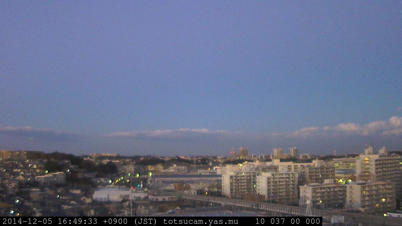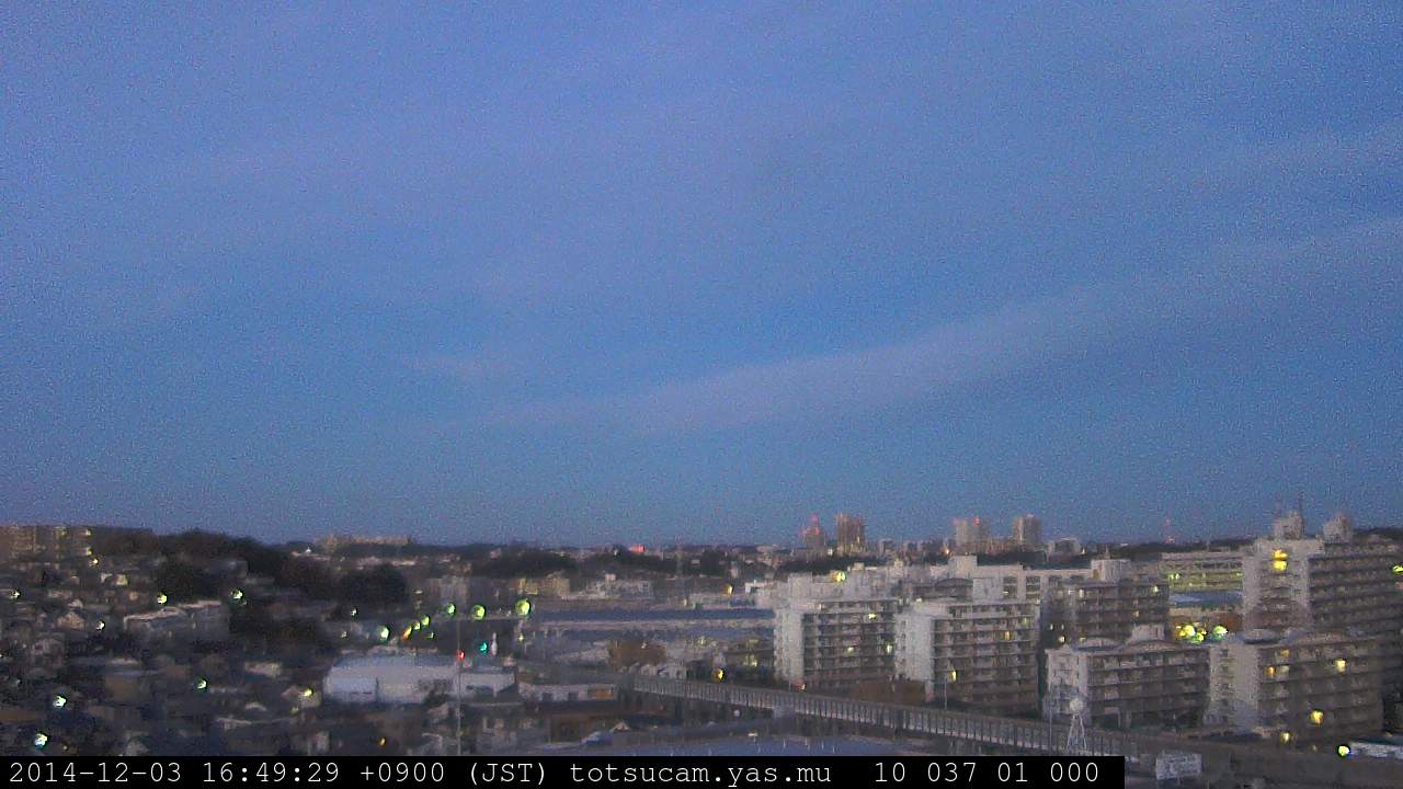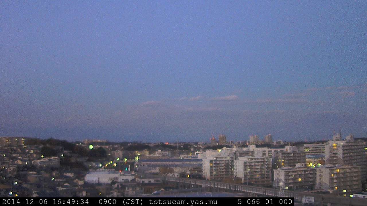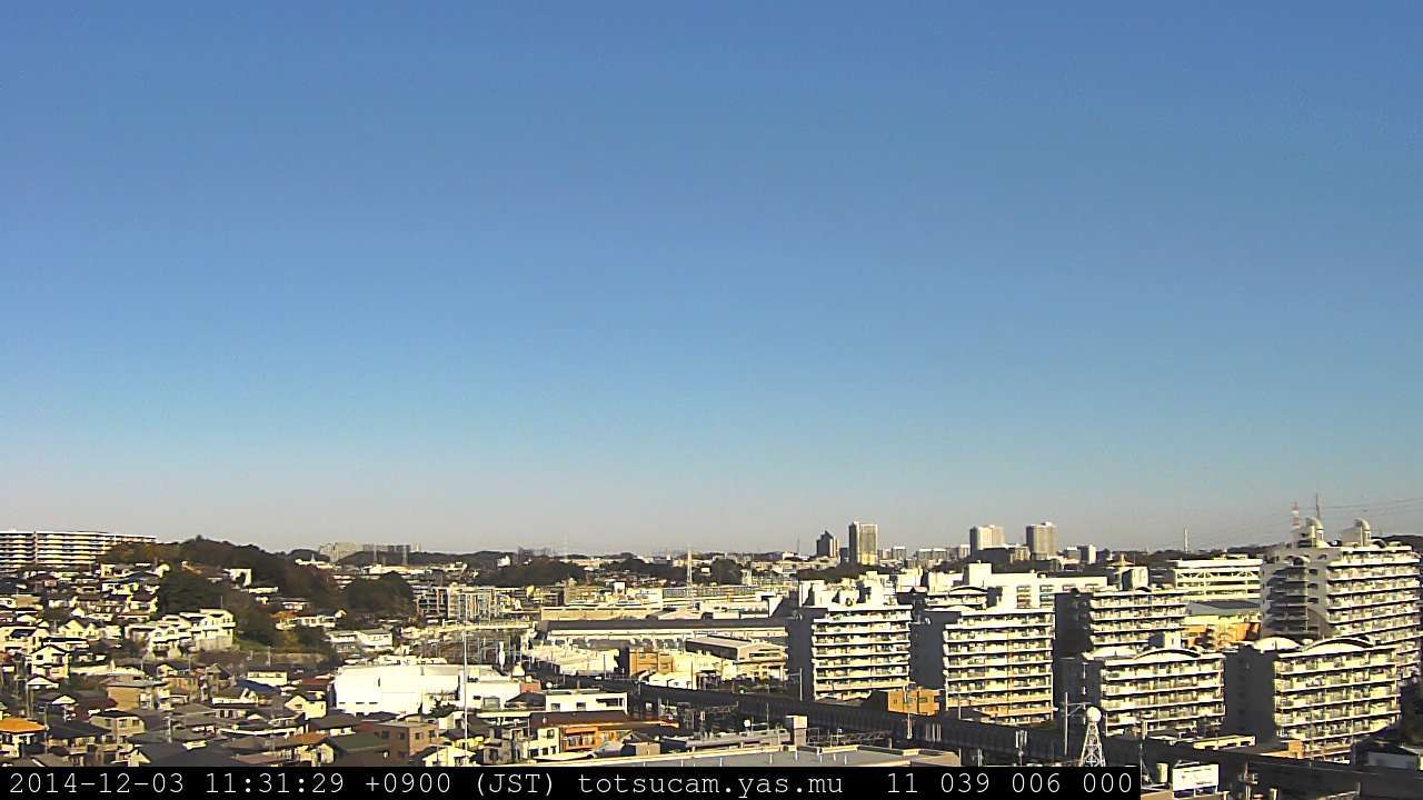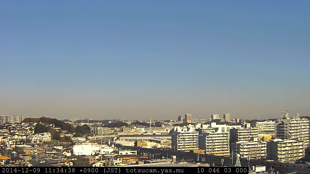 横浜市戸塚駅周辺から 東戸塚方面(北北東)を望む展望カメラの映像です。 左は現在の映像です。 下に並んでいるのは、 7日間に亘る日の出どき、昼間、夕暮れどきの写真(サムネイル)です。 それぞれ、日の出15分前、南中時、日没20分後の写真となっています。 各写真の下にはmpeg形式の動画へのリンクがあります。 それぞれ、日の出、南中、日没の前後1時間の画像です。 右欄にはその日24時間の動画へのリンクがあります。 この7日間以外は日付が一覧表示されています。 日付部分をクリックすると、 その日付から7日分が展開されて表示されます。