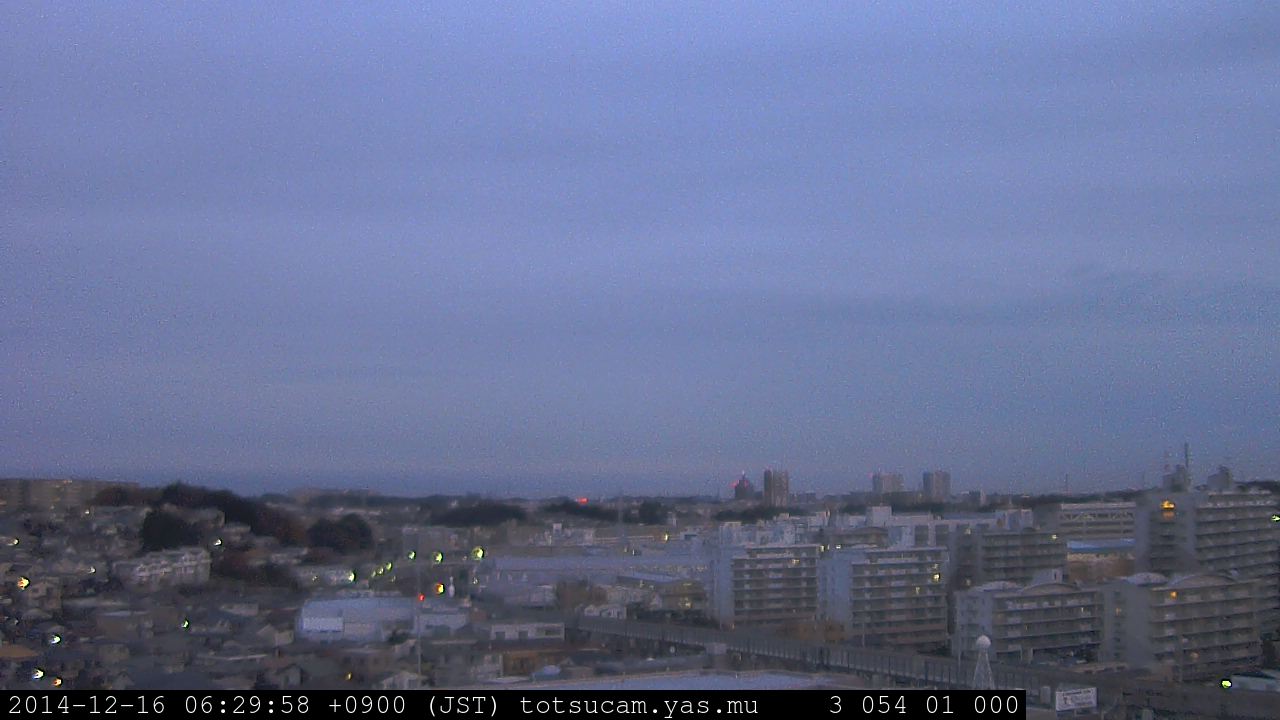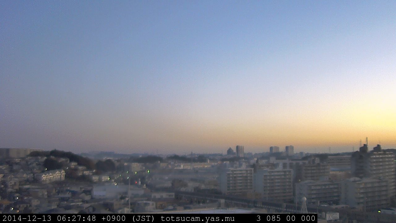 横浜市戸塚駅周辺から 東戸塚方面(北北東)を望む展望カメラの映像です。 左は現在の映像です。 下に並んでいるのは、 7日間に亘る日の出どき、昼間、夕暮れどきの写真(サムネイル)です。 それぞれ、日の出15分前、南中時、日没20分後の写真となっています。 各写真の下にはmpeg形式の動画へのリンクがあります。 それぞれ、日の出、南中、日没の前後1時間の画像です。 右欄にはその日24時間の動画へのリンクがあります。 この7日間以外は日付が一覧表示されています。 日付部分をクリックすると、 その日付から7日分が展開されて表示されます。