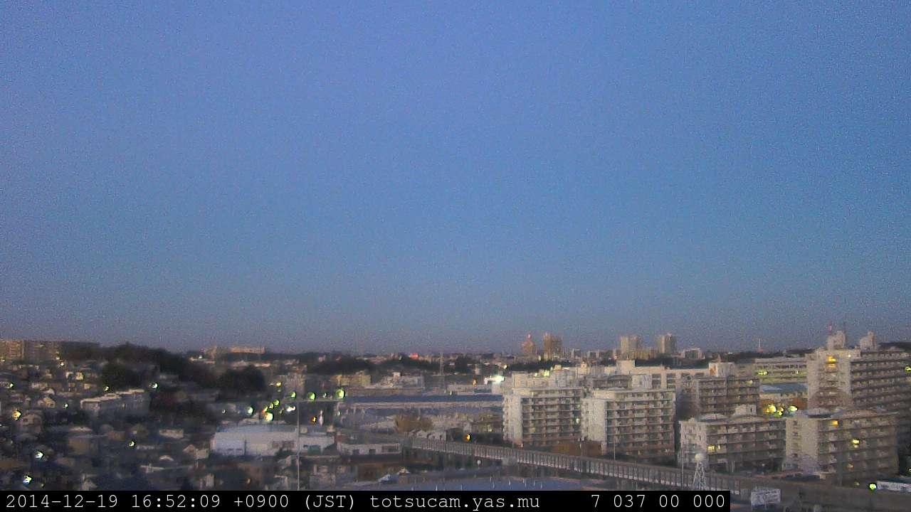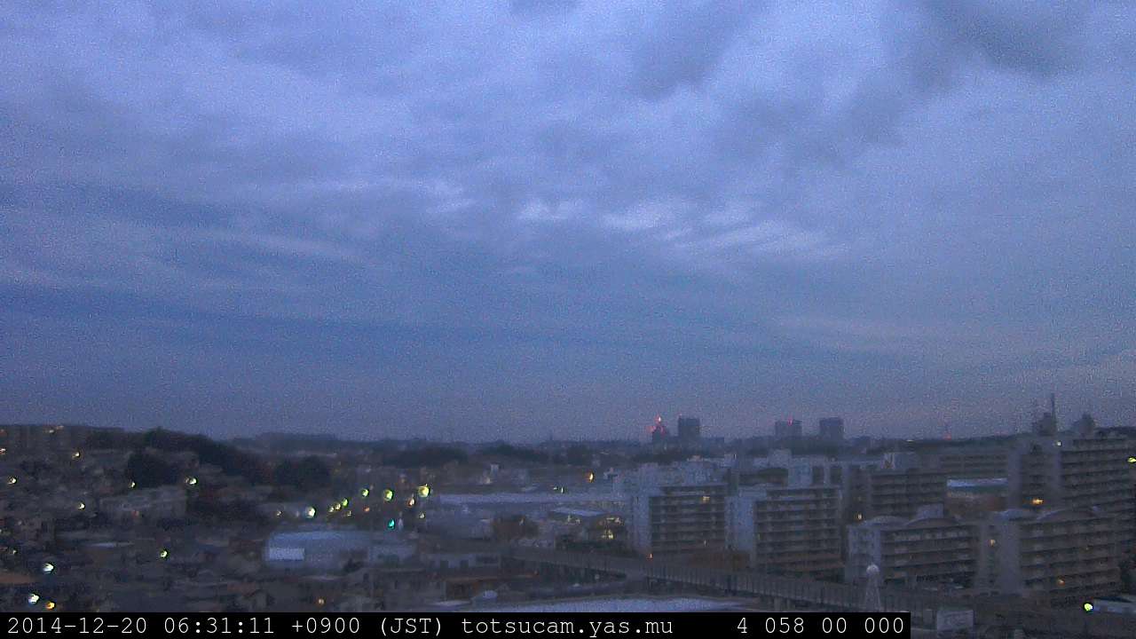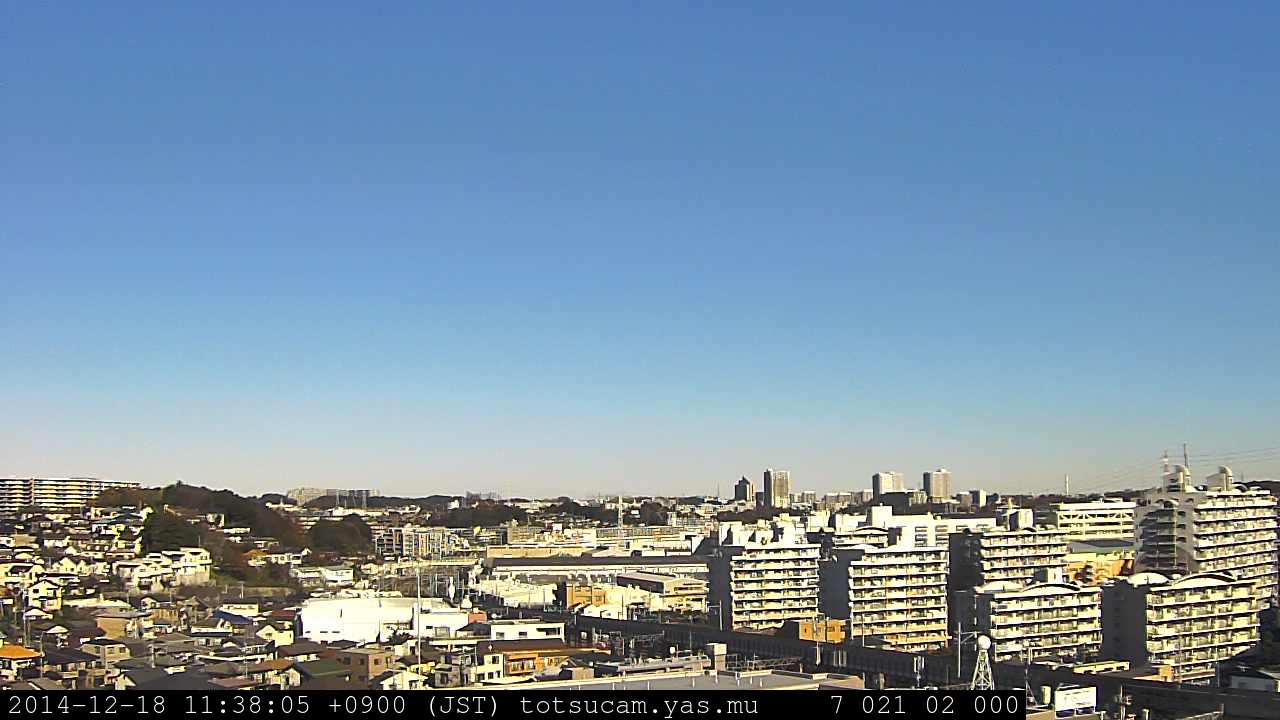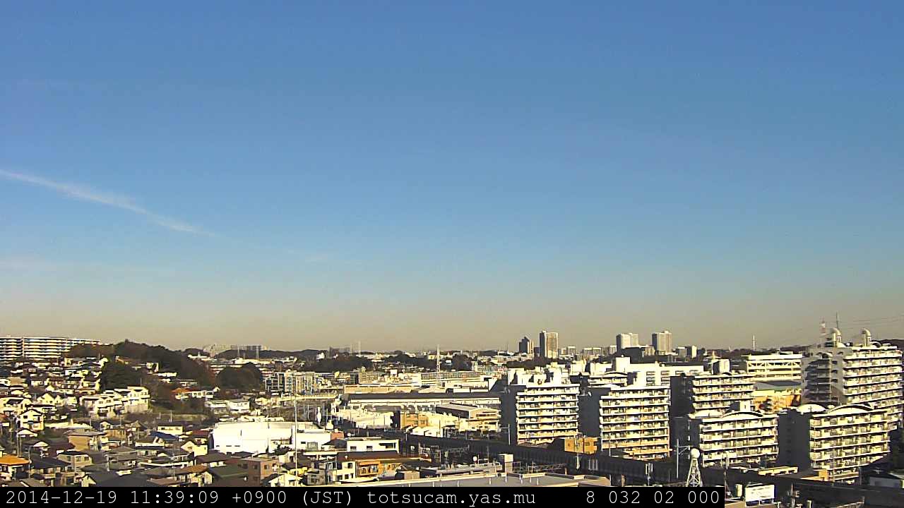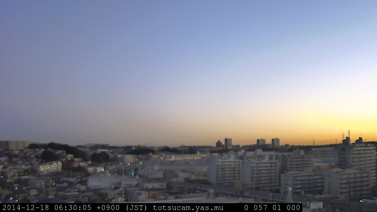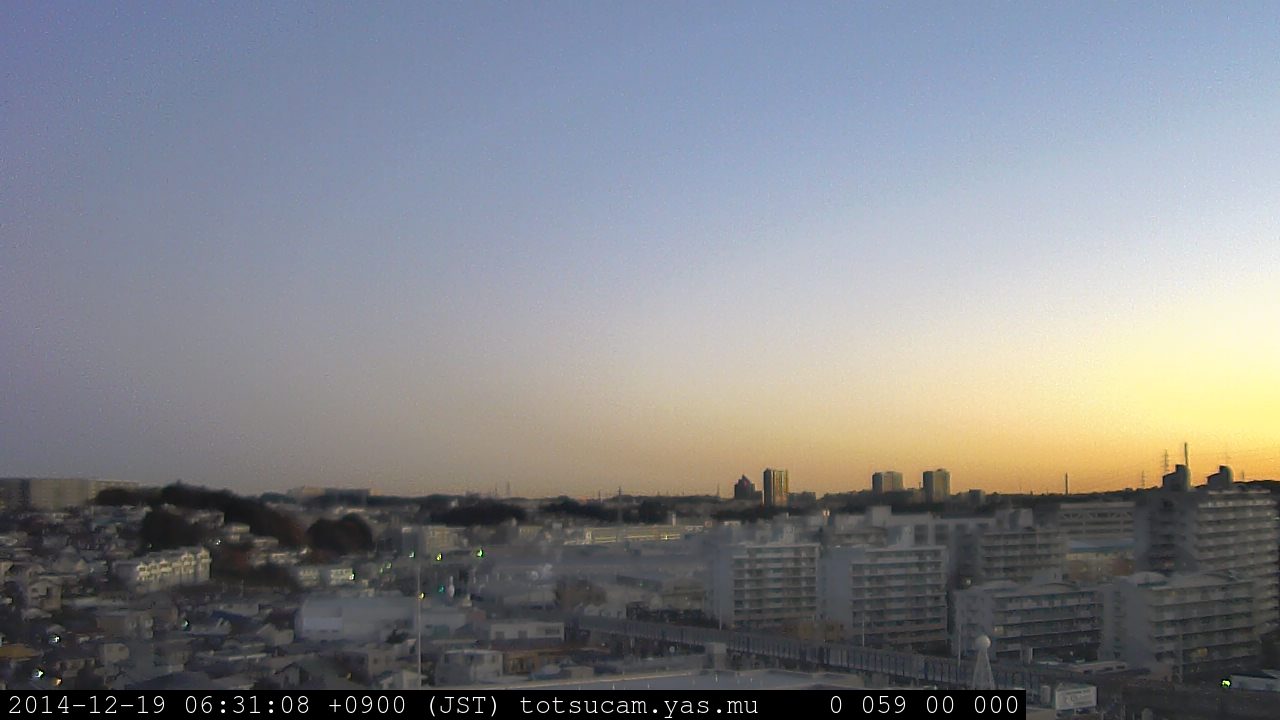 横浜市戸塚駅周辺から 東戸塚方面(北北東)を望む展望カメラの映像です。 左は現在の映像です。 下に並んでいるのは、 7日間に亘る日の出どき、昼間、夕暮れどきの写真(サムネイル)です。 それぞれ、日の出15分前、南中時、日没20分後の写真となっています。 各写真の下にはmpeg形式の動画へのリンクがあります。 それぞれ、日の出、南中、日没の前後1時間の画像です。 右欄にはその日24時間の動画へのリンクがあります。 この7日間以外は日付が一覧表示されています。 日付部分をクリックすると、 その日付から7日分が展開されて表示されます。