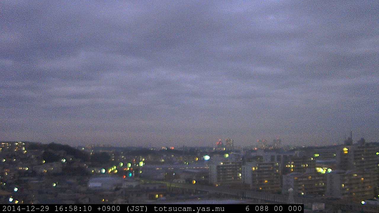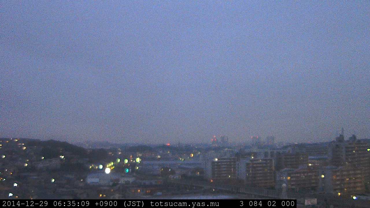 横浜市戸塚駅周辺から 東戸塚方面(北北東)を望む展望カメラの映像です。 左は現在の映像です。 下に並んでいるのは、 7日間に亘る日の出どき、昼間、夕暮れどきの写真(サムネイル)です。 それぞれ、日の出15分前、南中時、日没20分後の写真となっています。 各写真の下にはmpeg形式の動画へのリンクがあります。 それぞれ、日の出、南中、日没の前後1時間の画像です。 右欄にはその日24時間の動画へのリンクがあります。 この7日間以外は日付が一覧表示されています。 日付部分をクリックすると、 その日付から7日分が展開されて表示されます。