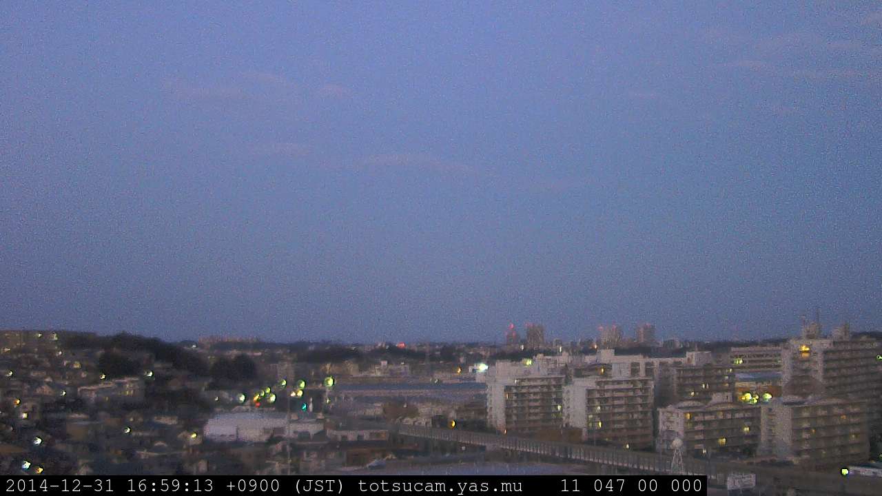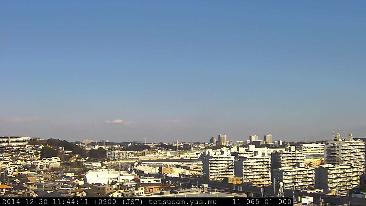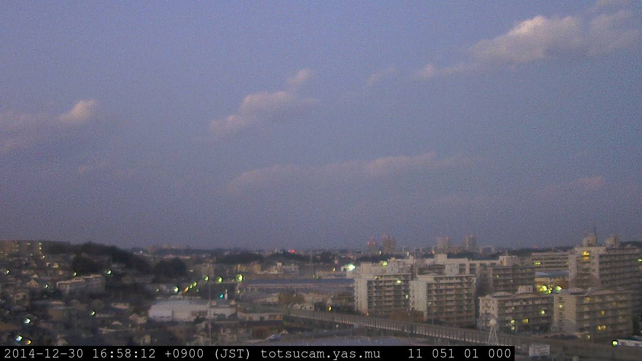 適度に曇った日の雲の動き (例: 2005-10-24) がとても楽しめます。 正面を横切っている高架は横須賀線下りです。 その下に横須賀線上り、東海道線、同貨物線が走っていますが、 高架に隠れていてよく見えません。 夜間は特に中央左寄りの車の動きがよく見えます。