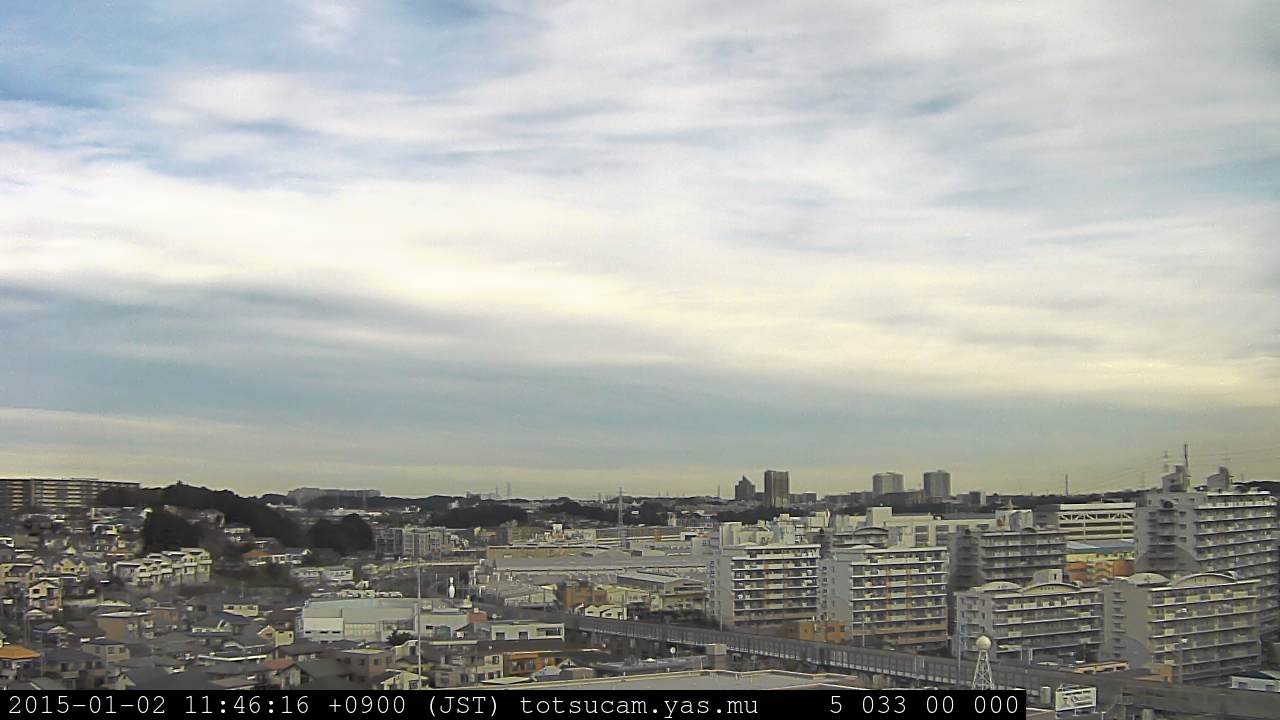 適度に曇った日の雲の動き (例: 2005-10-24) がとても楽しめます。 正面を横切っている高架は横須賀線下りです。 その下に横須賀線上り、東海道線、同貨物線が走っていますが、 高架に隠れていてよく見えません。 夜間は特に中央左寄りの車の動きがよく見えます。