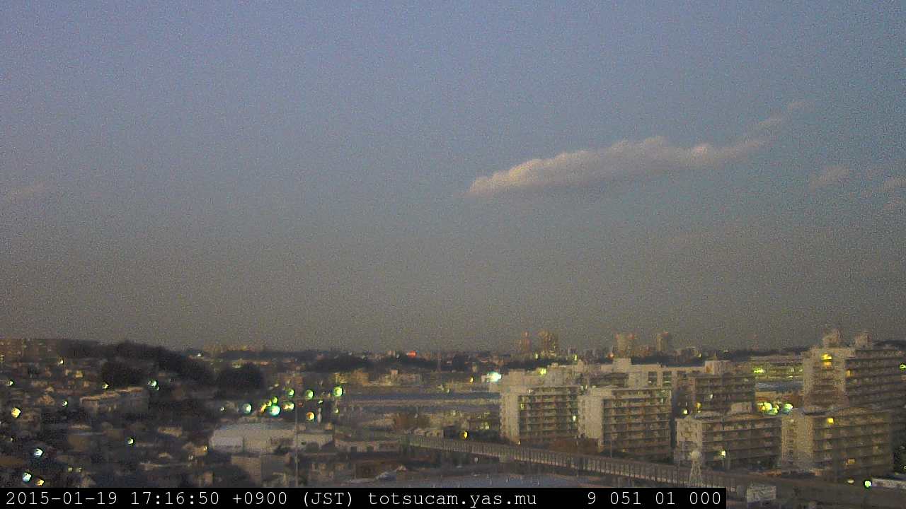 適度に曇った日の雲の動き (例: 2005-10-24) がとても楽しめます。 正面を横切っている高架は横須賀線下りです。 その下に横須賀線上り、東海道線、同貨物線が走っていますが、 高架に隠れていてよく見えません。 夜間は特に中央左寄りの車の動きがよく見えます。