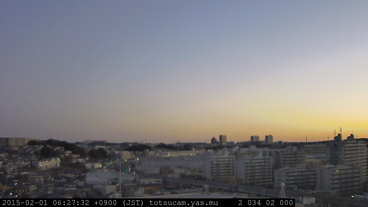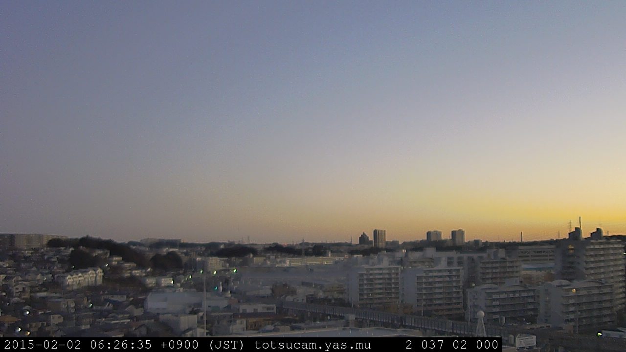 横浜市戸塚駅周辺から 東戸塚方面(北北東)を望む展望カメラの映像です。 左は現在の映像です。 下に並んでいるのは、 7日間に亘る日の出どき、昼間、夕暮れどきの写真(サムネイル)です。 それぞれ、日の出15分前、南中時、日没20分後の写真となっています。 各写真の下にはmpeg形式の動画へのリンクがあります。 それぞれ、日の出、南中、日没の前後1時間の画像です。 右欄にはその日24時間の動画へのリンクがあります。 この7日間以外は日付が一覧表示されています。 日付部分をクリックすると、 その日付から7日分が展開されて表示されます。