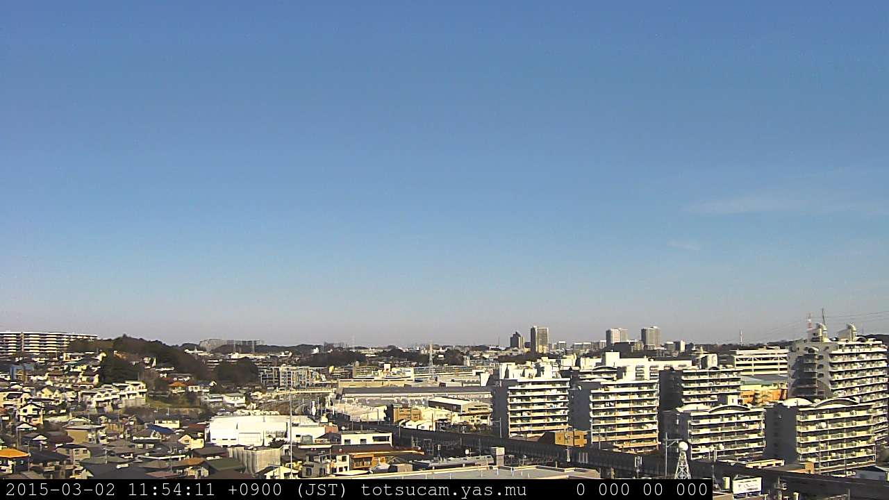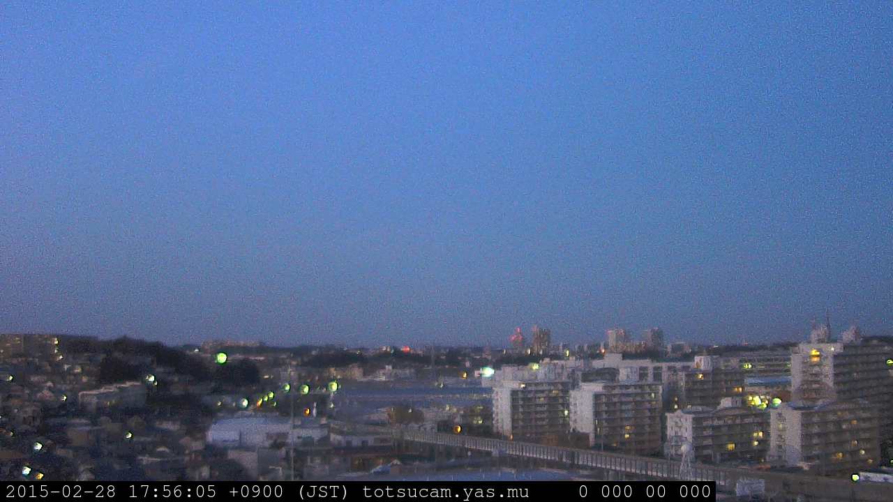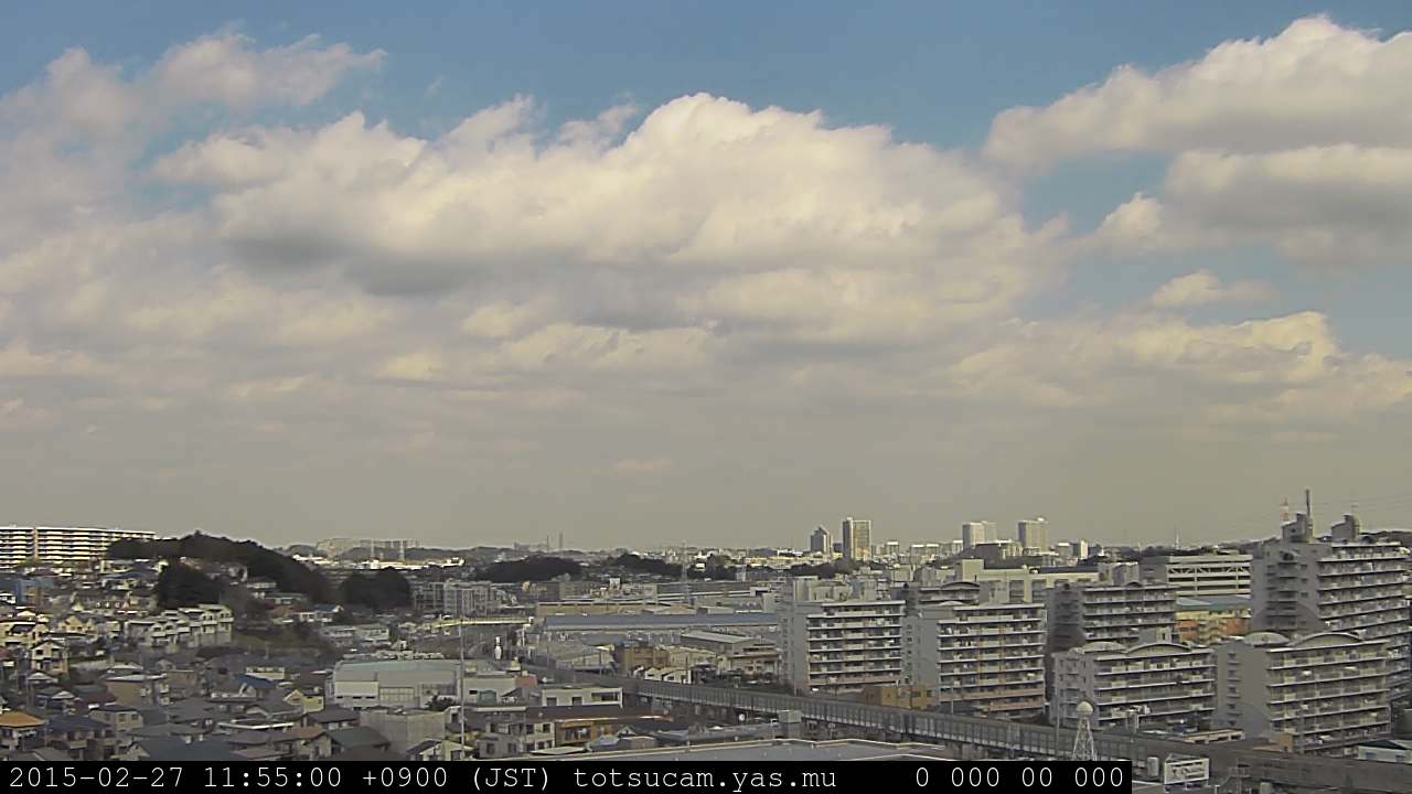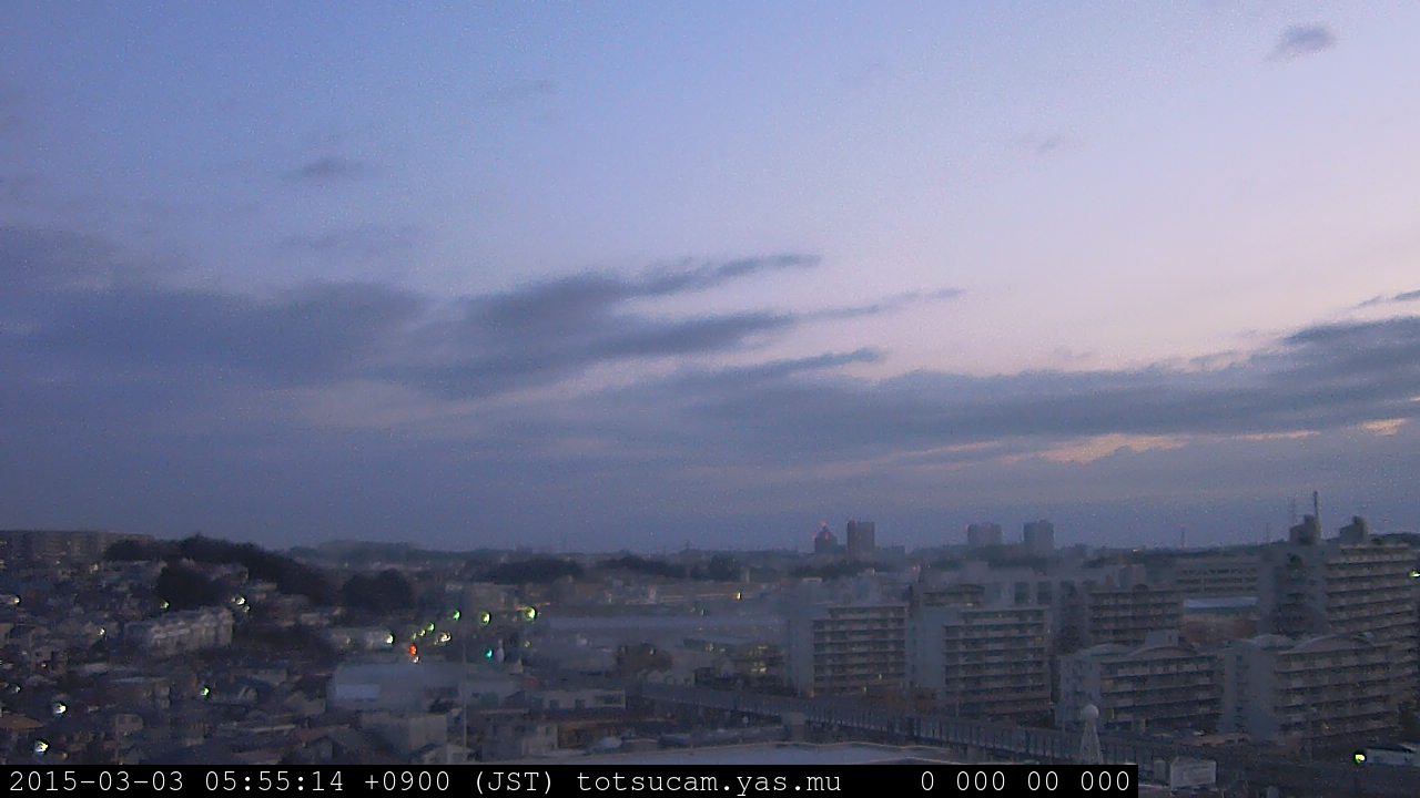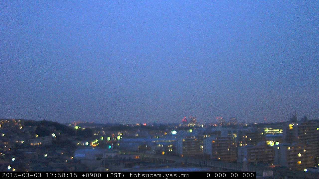 横浜市戸塚駅周辺から 東戸塚方面(北北東)を望む展望カメラの映像です。 左は現在の映像です。 下に並んでいるのは、 7日間に亘る日の出どき、昼間、夕暮れどきの写真(サムネイル)です。 それぞれ、日の出15分前、南中時、日没20分後の写真となっています。 各写真の下にはmpeg形式の動画へのリンクがあります。 それぞれ、日の出、南中、日没の前後1時間の画像です。 右欄にはその日24時間の動画へのリンクがあります。 この7日間以外は日付が一覧表示されています。 日付部分をクリックすると、 その日付から7日分が展開されて表示されます。