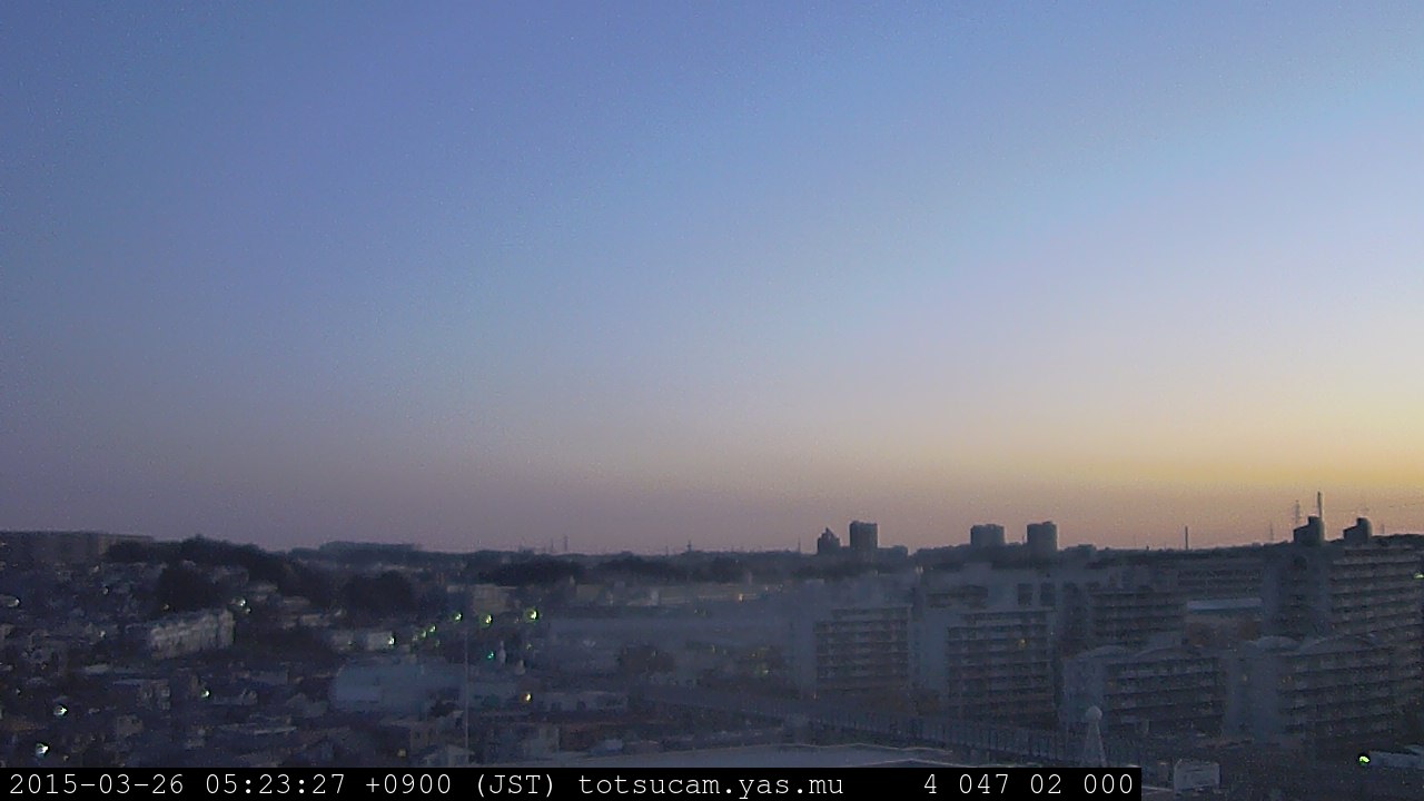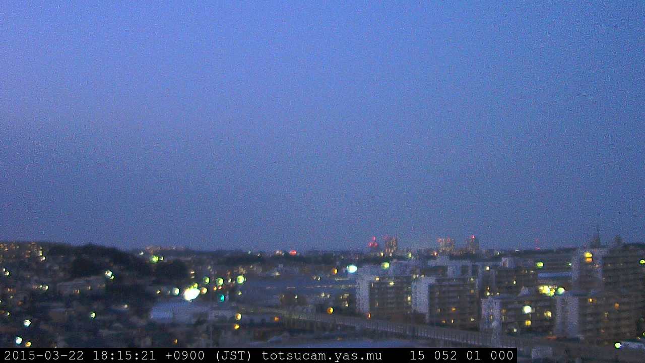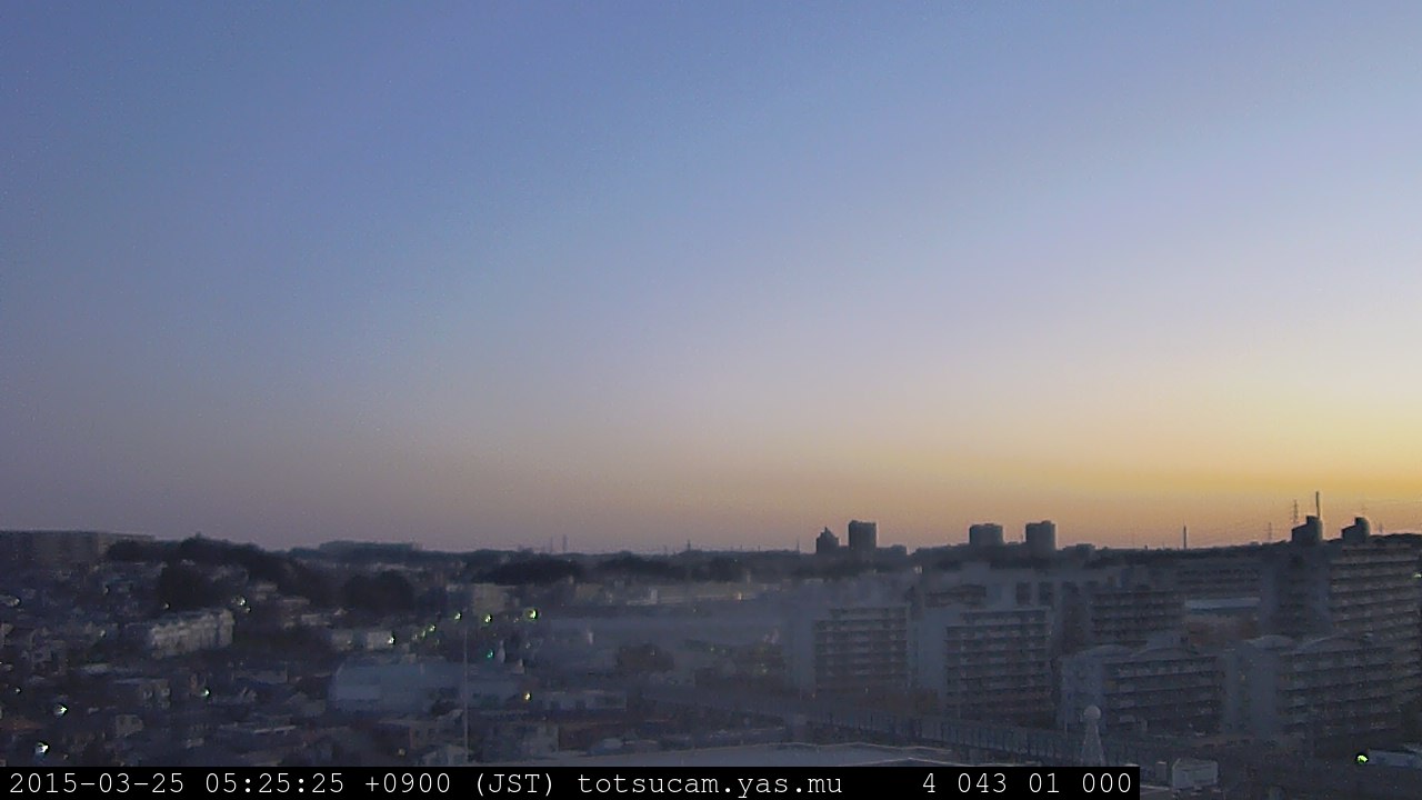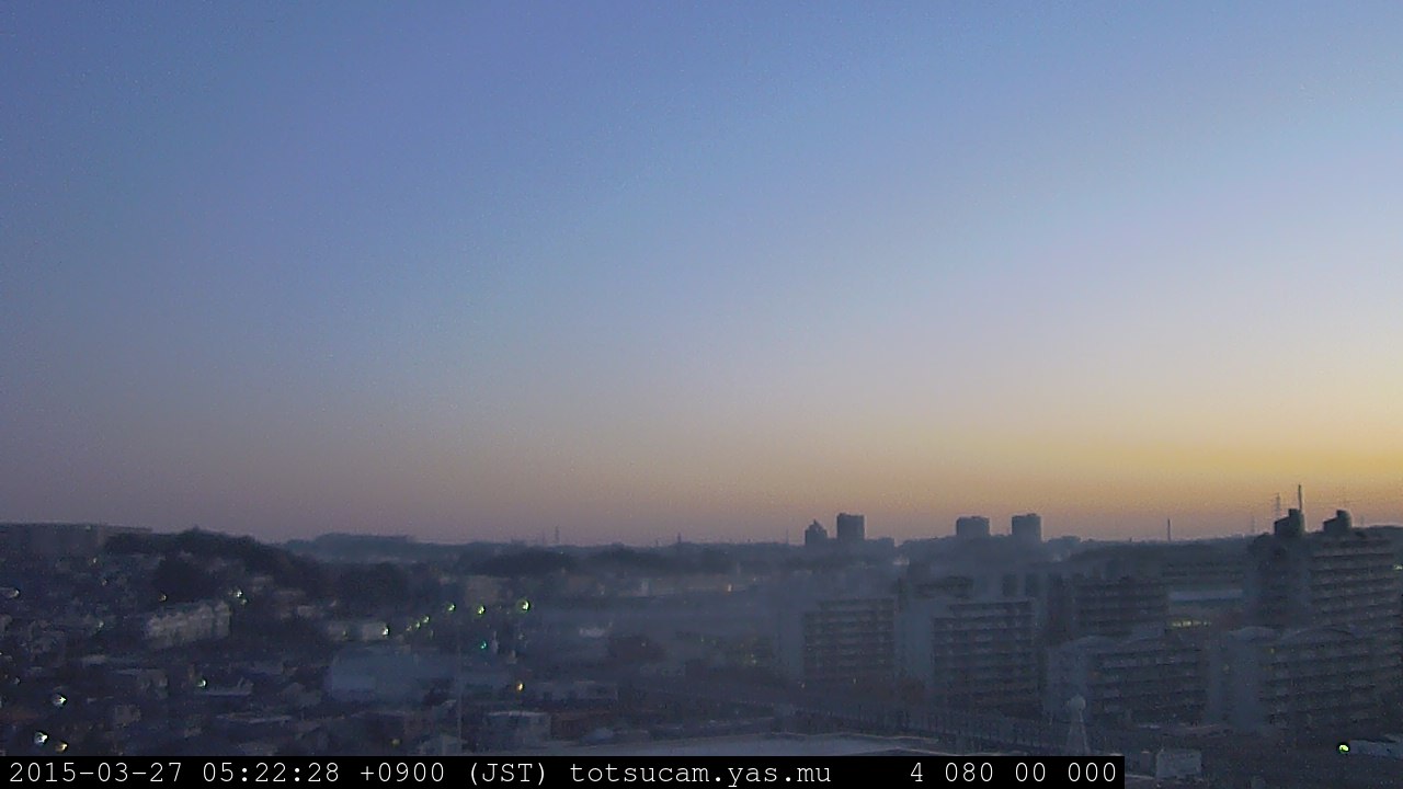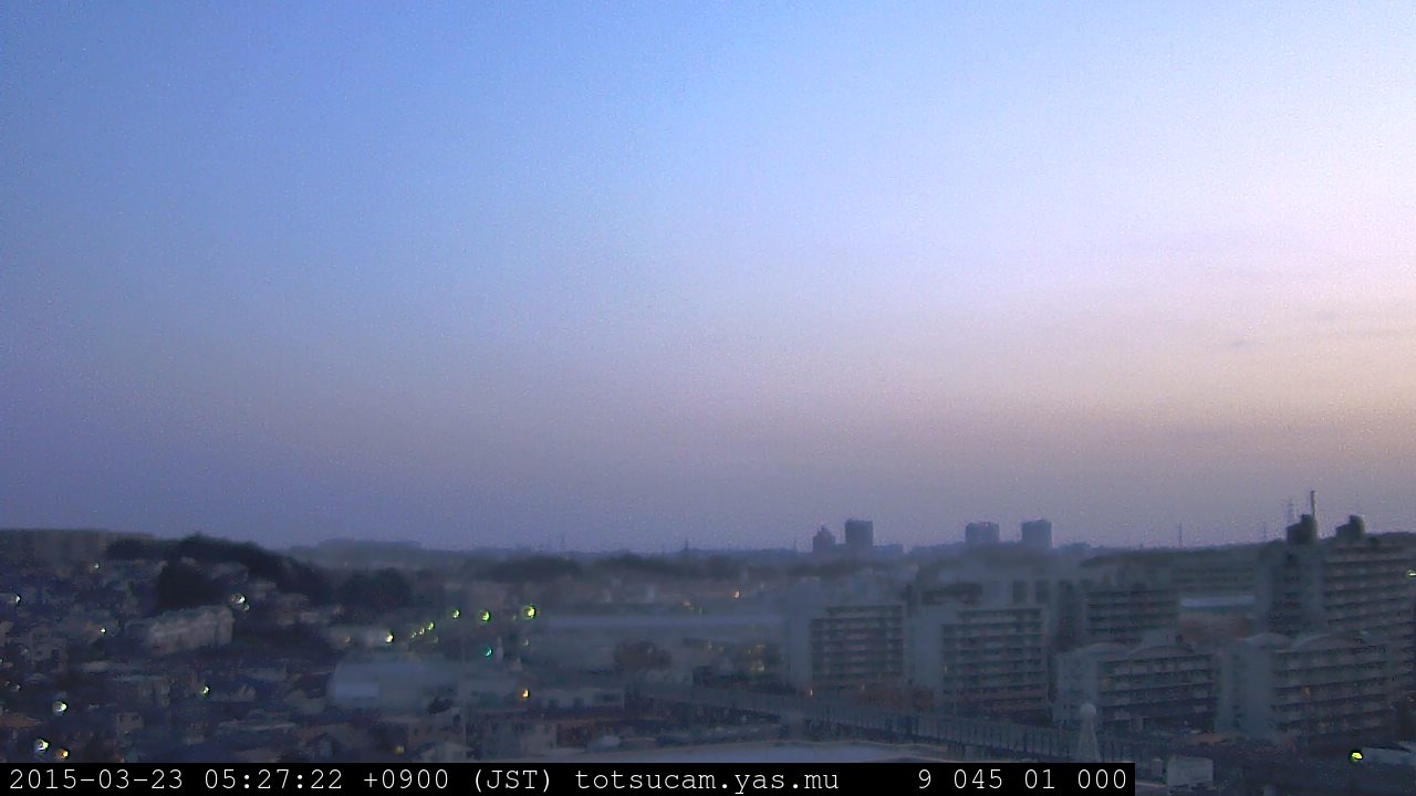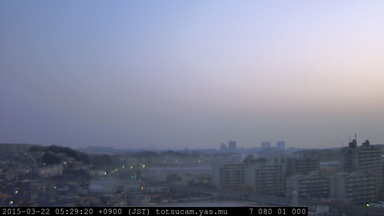 横浜市戸塚駅周辺から 東戸塚方面(北北東)を望む展望カメラの映像です。 左は現在の映像です。 下に並んでいるのは、 7日間に亘る日の出どき、昼間、夕暮れどきの写真(サムネイル)です。 それぞれ、日の出15分前、南中時、日没20分後の写真となっています。 各写真の下にはmpeg形式の動画へのリンクがあります。 それぞれ、日の出、南中、日没の前後1時間の画像です。 右欄にはその日24時間の動画へのリンクがあります。 この7日間以外は日付が一覧表示されています。 日付部分をクリックすると、 その日付から7日分が展開されて表示されます。