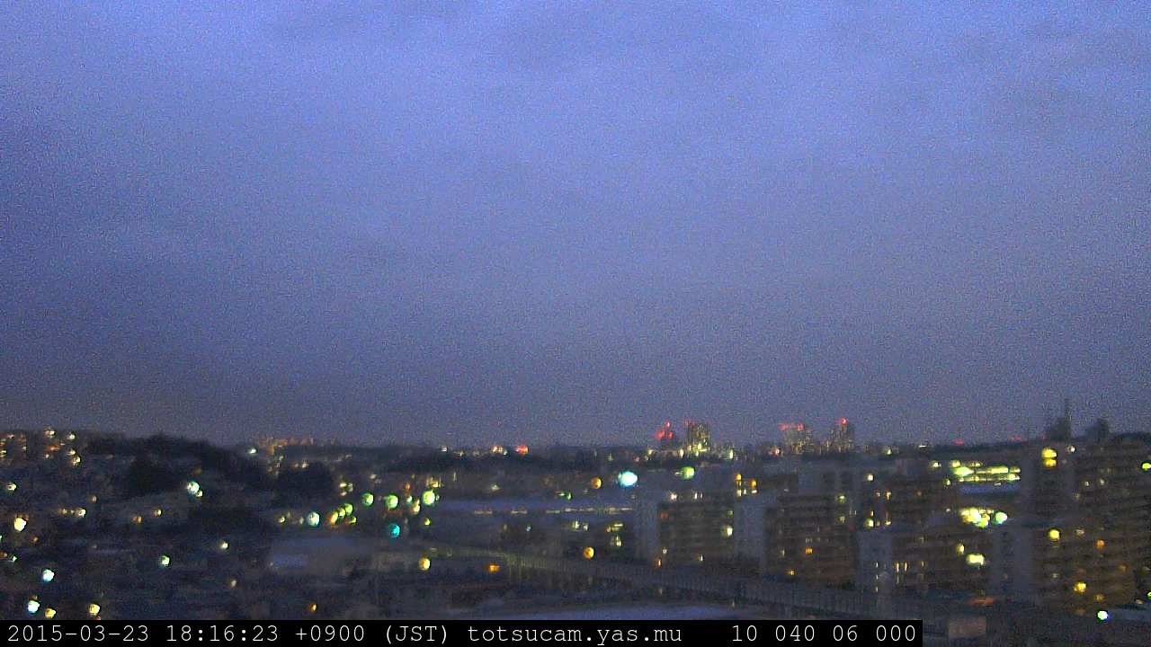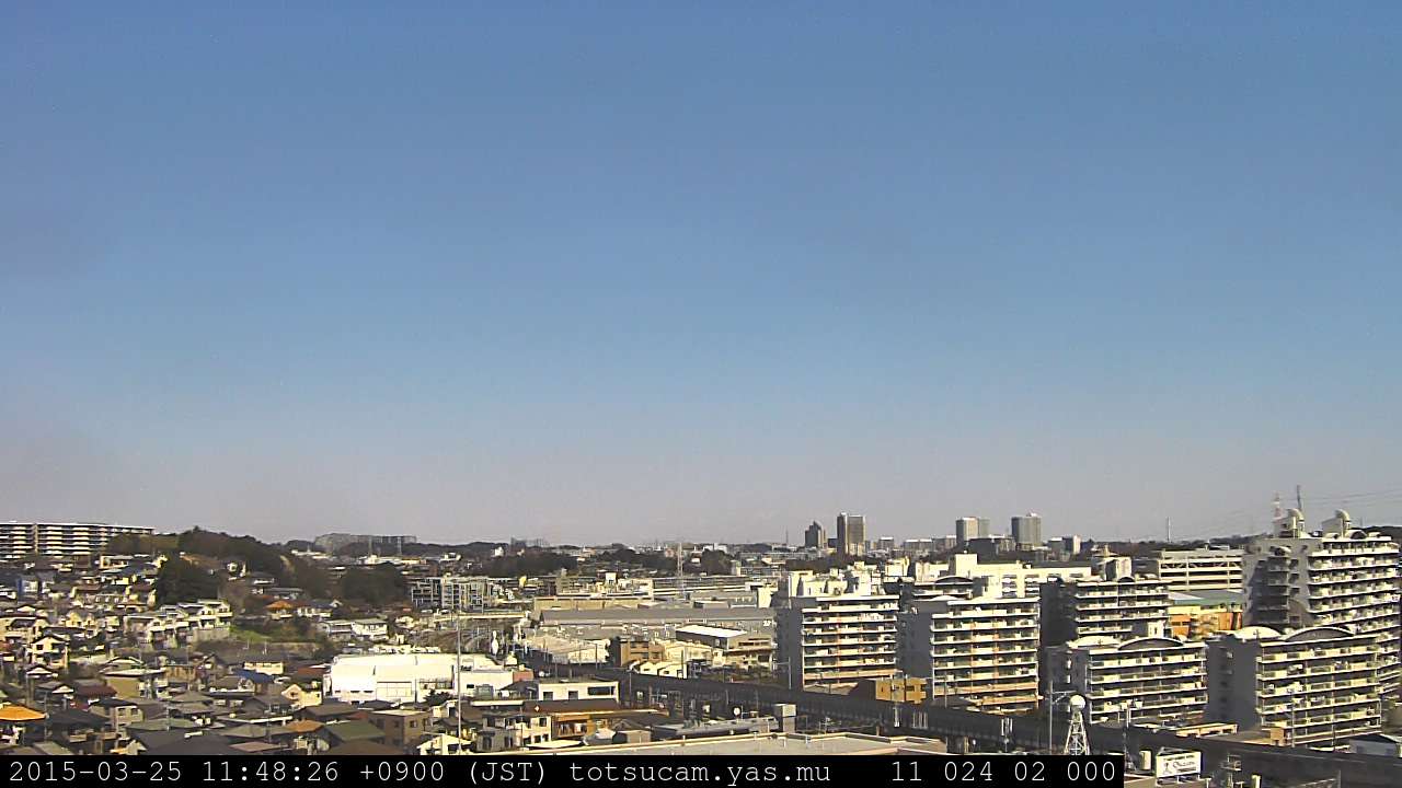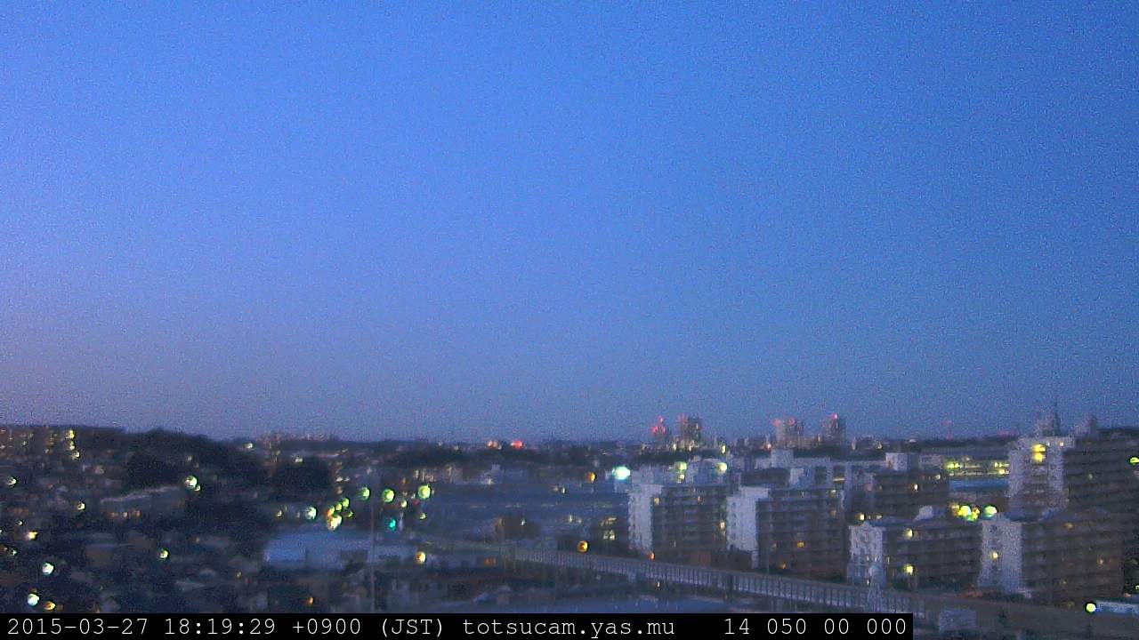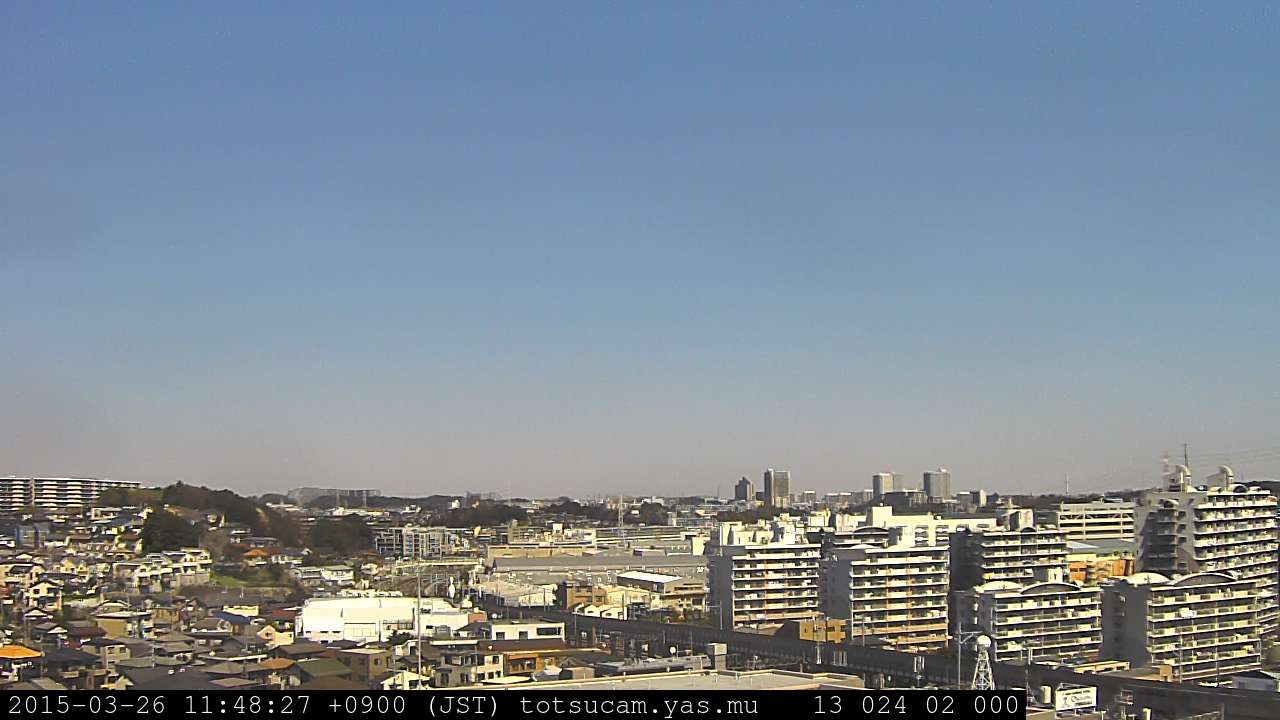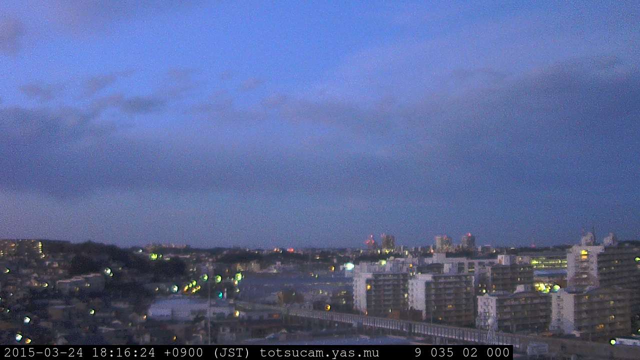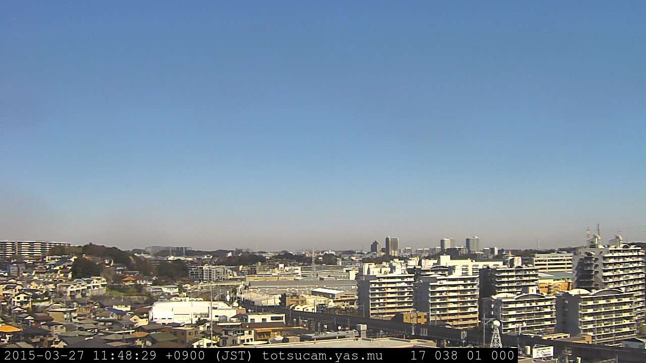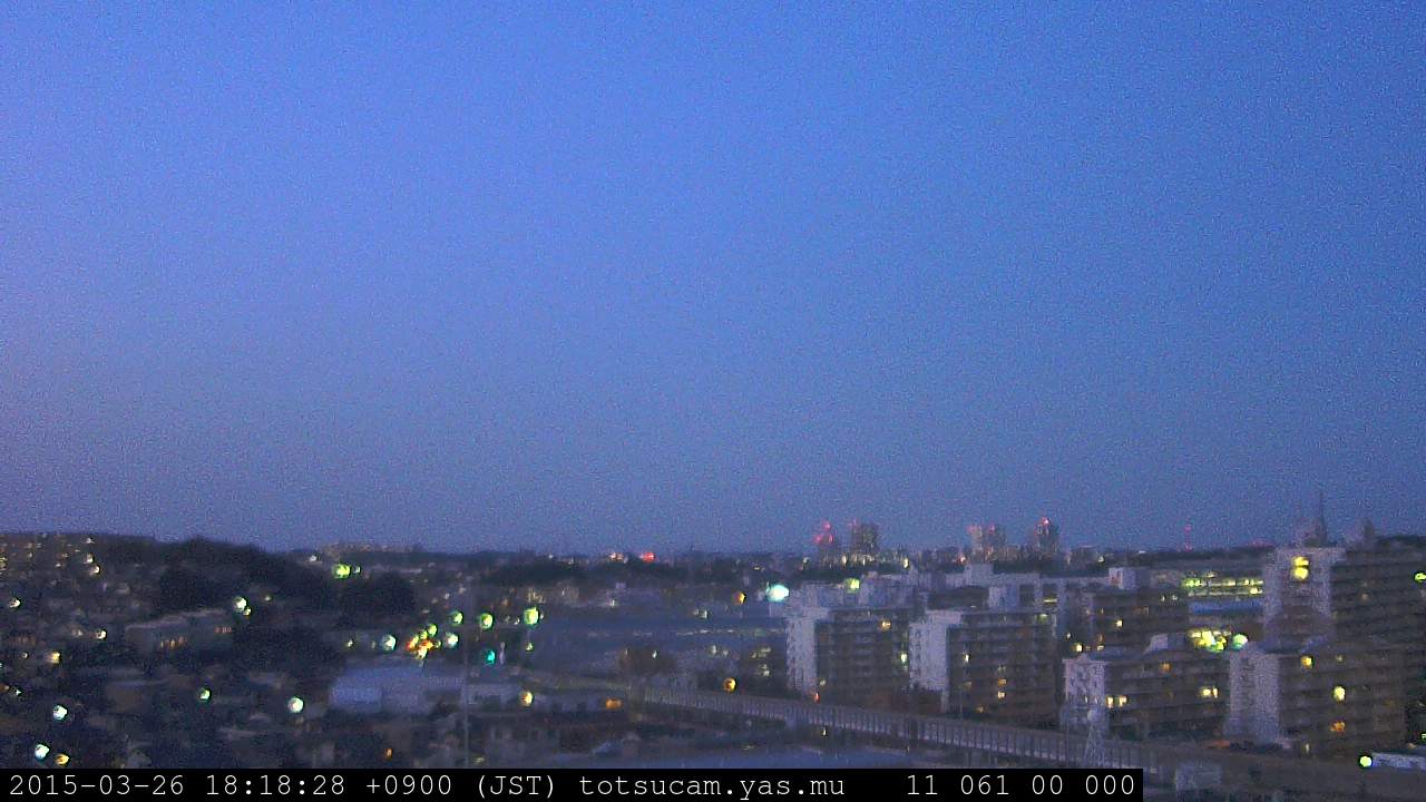 横浜市戸塚駅周辺から 東戸塚方面(北北東)を望む展望カメラの映像です。 左は現在の映像です。 下に並んでいるのは、 7日間に亘る日の出どき、昼間、夕暮れどきの写真(サムネイル)です。 それぞれ、日の出15分前、南中時、日没20分後の写真となっています。 各写真の下にはmpeg形式の動画へのリンクがあります。 それぞれ、日の出、南中、日没の前後1時間の画像です。 右欄にはその日24時間の動画へのリンクがあります。 この7日間以外は日付が一覧表示されています。 日付部分をクリックすると、 その日付から7日分が展開されて表示されます。