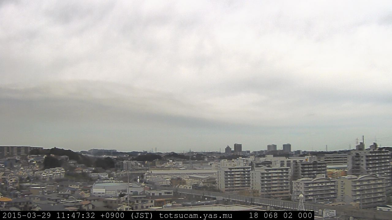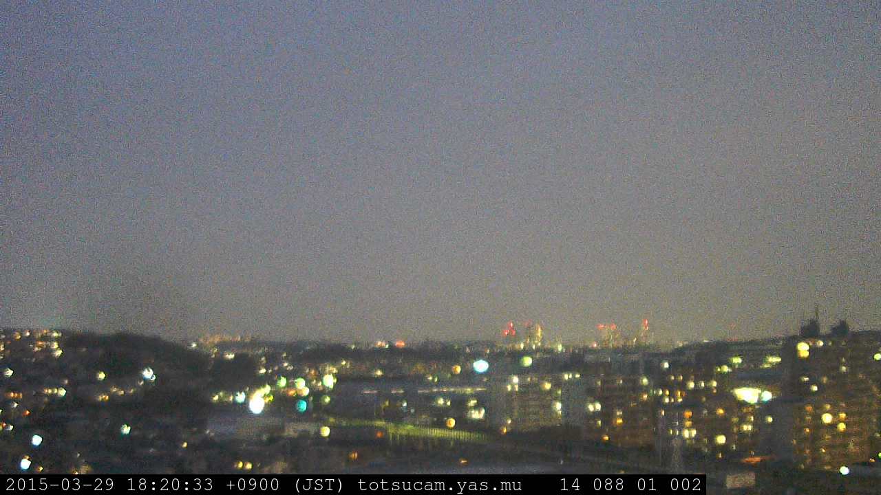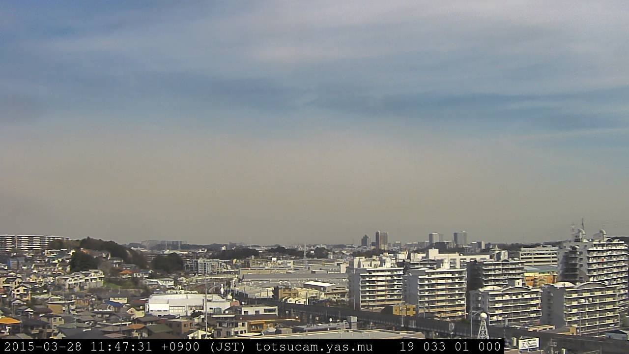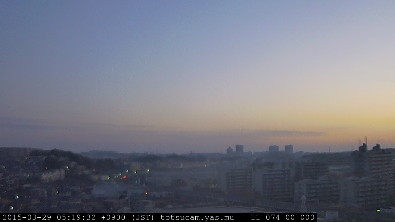 横浜市戸塚駅周辺から 東戸塚方面(北北東)を望む展望カメラの映像です。 左は現在の映像です。 下に並んでいるのは、 7日間に亘る日の出どき、昼間、夕暮れどきの写真(サムネイル)です。 それぞれ、日の出15分前、南中時、日没20分後の写真となっています。 各写真の下にはmpeg形式の動画へのリンクがあります。 それぞれ、日の出、南中、日没の前後1時間の画像です。 右欄にはその日24時間の動画へのリンクがあります。 この7日間以外は日付が一覧表示されています。 日付部分をクリックすると、 その日付から7日分が展開されて表示されます。