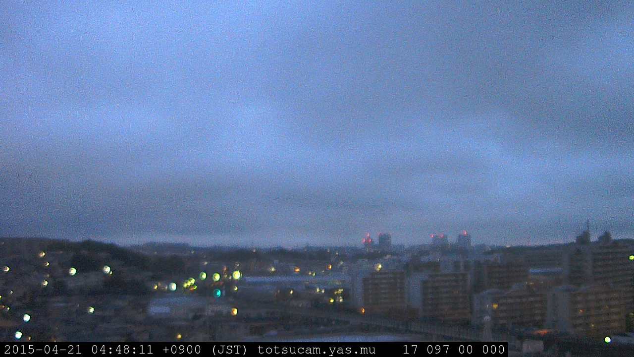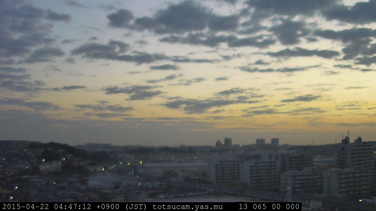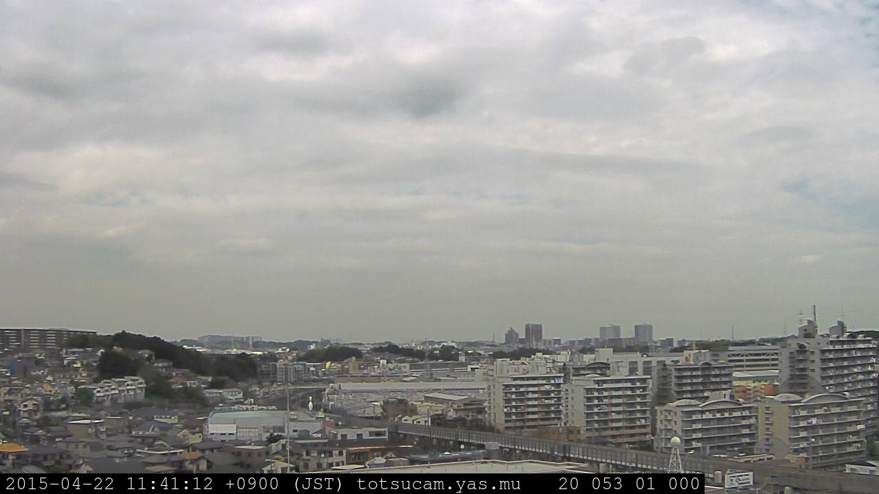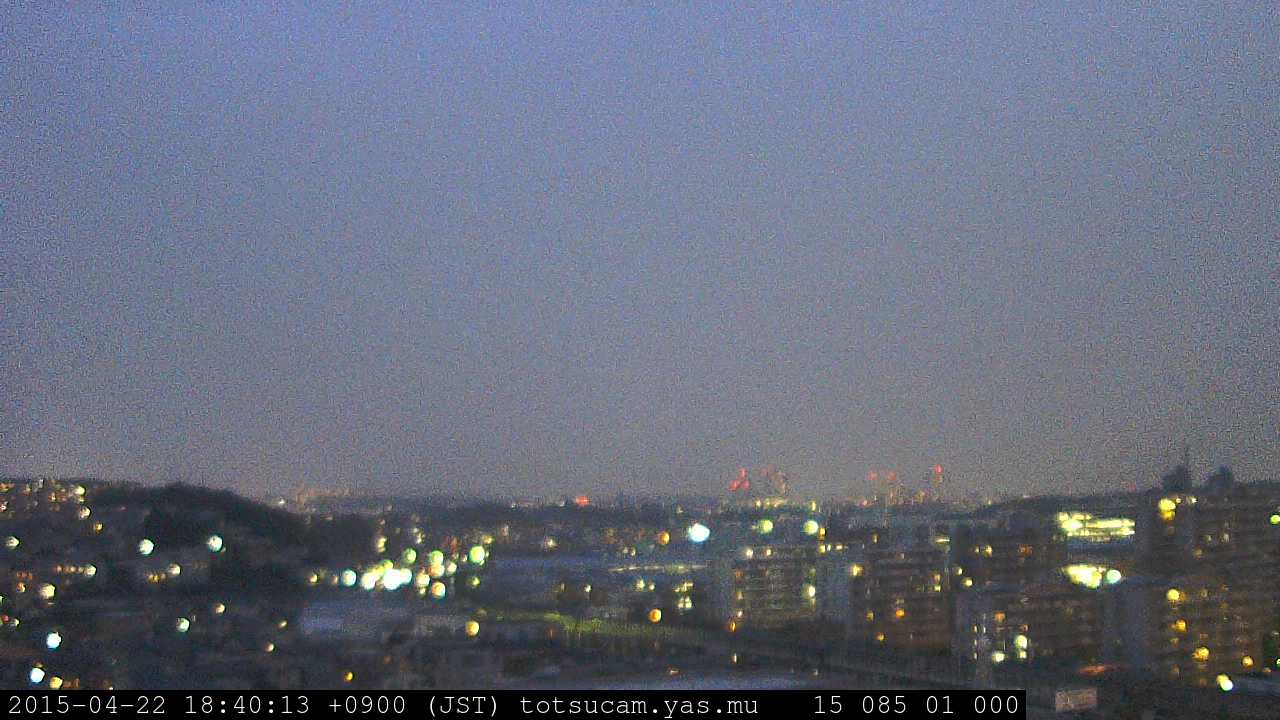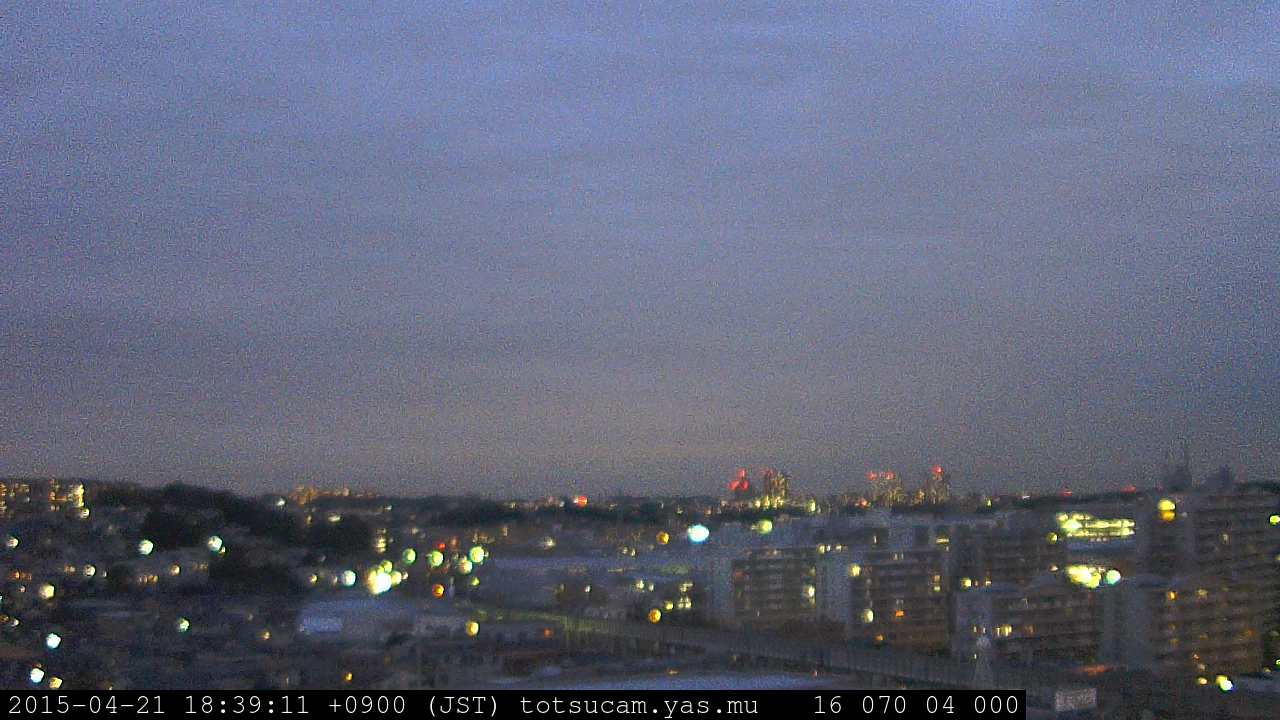 横浜市戸塚駅周辺から 東戸塚方面(北北東)を望む展望カメラの映像です。 左は現在の映像です。 下に並んでいるのは、 7日間に亘る日の出どき、昼間、夕暮れどきの写真(サムネイル)です。 それぞれ、日の出15分前、南中時、日没20分後の写真となっています。 各写真の下にはmpeg形式の動画へのリンクがあります。 それぞれ、日の出、南中、日没の前後1時間の画像です。 右欄にはその日24時間の動画へのリンクがあります。 この7日間以外は日付が一覧表示されています。 日付部分をクリックすると、 その日付から7日分が展開されて表示されます。